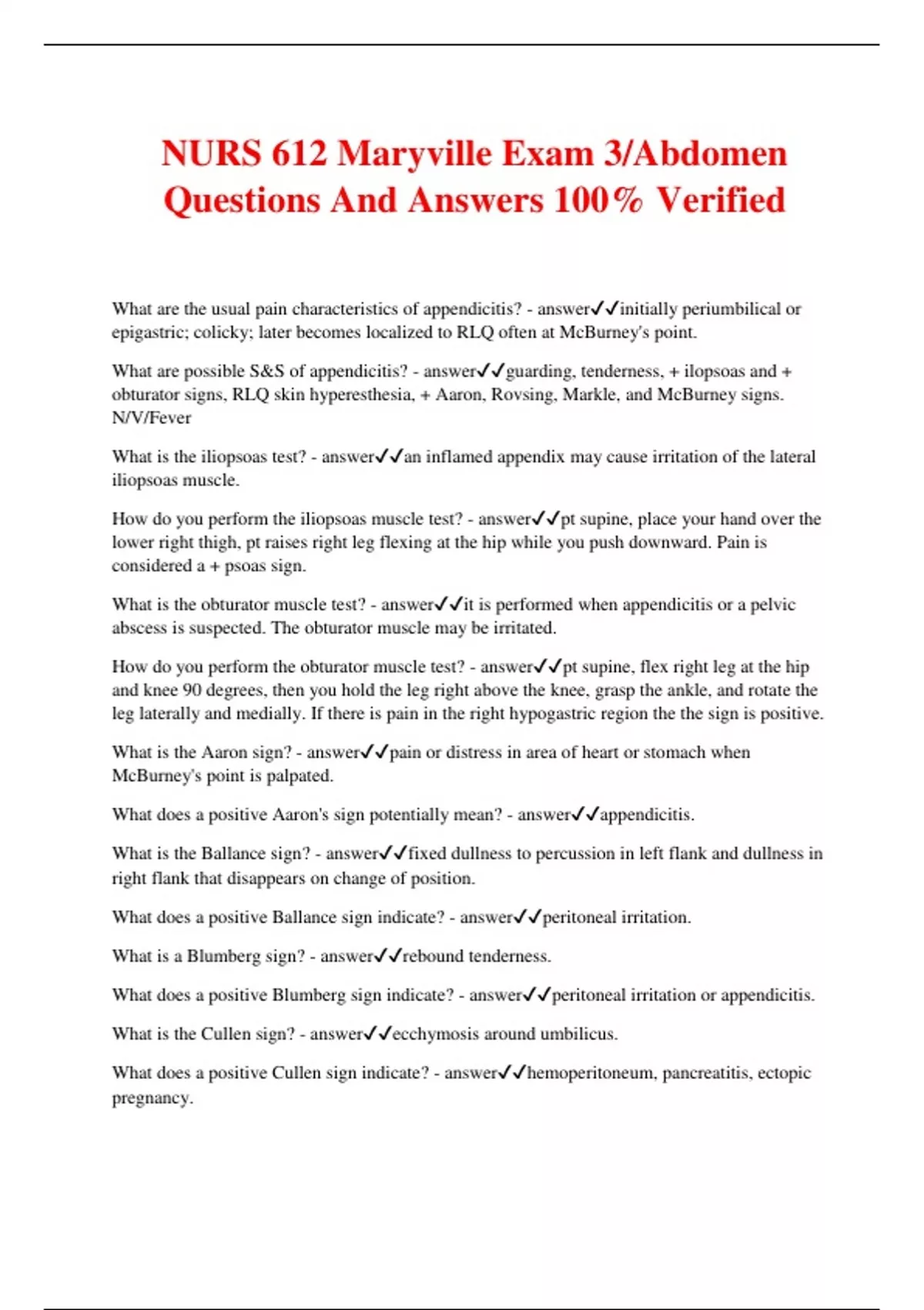 NURS 612 Maryville Exam 3/Abdomen Questions And Answers 100% Verified What are the usual pain characteristics of appendicitis? - answerinitially periumbilical or epigastric; colicky; later becomes localized to RLQ often at McBurney's point. What are possible S&S of appendicitis? - answerguarding, tenderness, + ilopsoas and + obturator signs, RLQ skin hyperesthesia, + Aaron, Rovsing, Markle, and McBurney signs. N/V/Fever What is the iliopsoas test? - answeran inflamed appendix may cause irritation of the lateral iliopsoas muscle. How do you perform the iliopsoas muscle test? - answerpt supine, place your hand over the lower right thigh, pt raises right leg flexing at the hip while you push downward. Pain is considered a + psoas sign. What is the obturator muscle test? - answerit is performed when appendicitis or a pelvic abscess is suspected. The obturator muscle may be irritated. How do you perform the obturator muscle test? - answerpt supine, flex right leg at the hip and knee 90 degrees, then you hold the leg right above the knee, grasp the ankle, and rotate the leg laterally and medially. If there is pain in the right hypogastric region the the sign is positive. What is the Aaron sign? - answerpain or distress in area of heart or stomach when McBurney's point is palpated. What does a positive Aaron's sign potentially mean? - answerappendicitis. What is the Ballance sign? - answerfixed dullness to percussion in left flank and dullness in right flank that disappears on change of position. What does a positive Ballance sign indicate? - answerperitoneal irritation. What is a Blumberg sign? - answerrebound tenderness. What does a positive Blumberg sign indicate? - answerperitoneal irritation or appendicitis. What is the Cullen sign? - answerecchymosis around umbilicus. What does a positive Cullen sign indicate? - answerhemoperitoneum, pancreatitis, ectopic pregnancy.