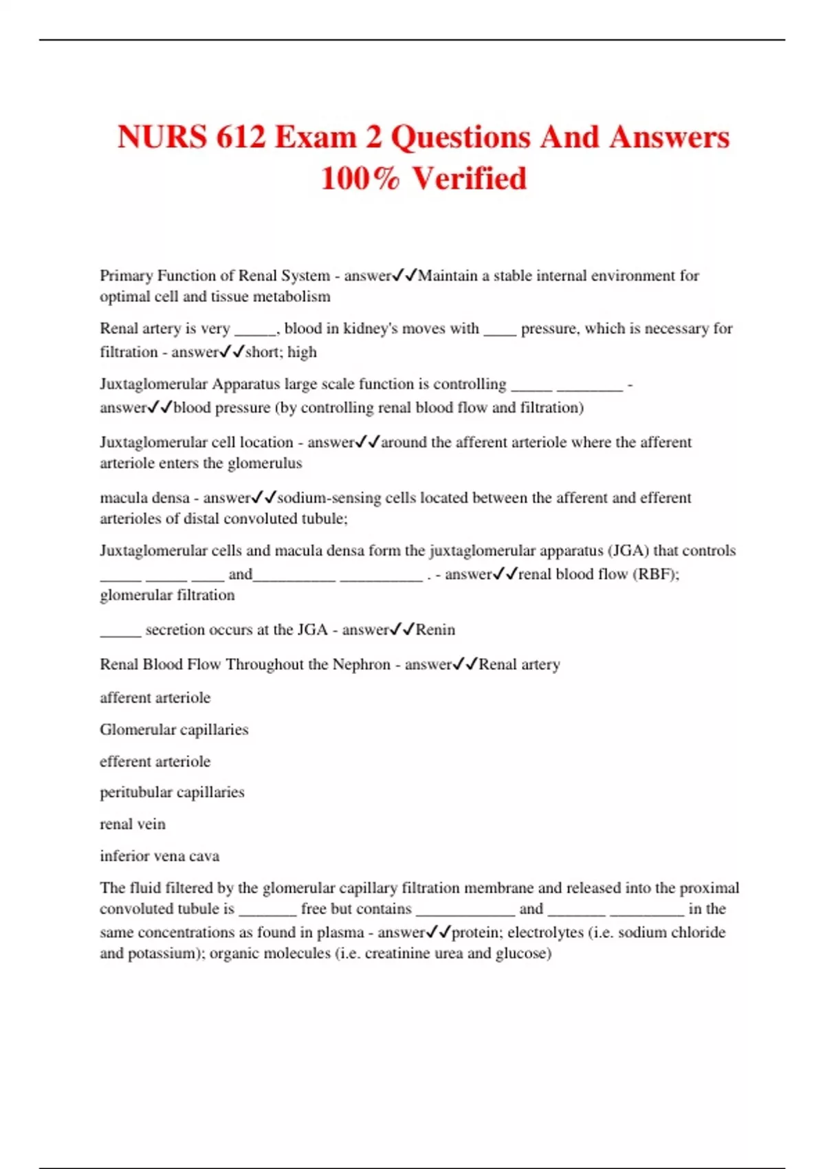 NURS 612 Exam 2 Questions And Answers 100% Verified Primary Function of Renal System - answerMaintain a stable internal environment for optimal cell and tissue metabolism Renal artery is very _____, blood in kidney's moves with ____ pressure, which is necessary for filtration - answershort; high Juxtaglomerular Apparatus large scale function is controlling _____ ________ - answerblood pressure (by controlling renal blood flow and filtration) Juxtaglomerular cell location - answeraround the afferent arteriole where the afferent arteriole enters the glomerulus macula densa - answersodium-sensing cells located between the afferent and efferent arterioles of distal convoluted tubule; Juxtaglomerular cells and macula densa form the juxtaglomerular apparatus (JGA) that controls _____ _____ ____ and__________ __________ . - answerrenal blood flow (RBF); glomerular filtration _____ secretion occurs at the JGA - answerRenin Renal Blood Flow Throughout the Nephron - answerRenal artery afferent arteriole Glomerular capillaries efferent arteriole peritubular capillaries renal vein inferior vena cava The fluid filtered by the glomerular capillary filtration membrane and released into the proximal convoluted tubule is _______ free but contains ____________ and _______ _________ in the same concentrations as found in plasma - answerprotein; electrolytes (i.e. sodium chloride and potassium); organic molecules (i.e. creatinine urea and glucose) In the glomerulus, the ________ ________ determines permeability of glomerular capillary membrane - answerBasement membrane What does glomerular filtration depend on (3)? - answer•Size and charge of substances •Hydrostatic pressure in the capillaries •Oncotic pressure in the capillaries Between BP ___ - ____ mmHg the kidneys maintain a constant GFR - answer80-180 Autoregulation of renal blood flow: Response to increased systemic BP - answerAfferent arterioles constrict, preventing an increase in filtration pressure. Autoregulation of renal blood flow: Response to decreased systemic BP - answerGFR decreases and the amount of sodium in macula densa decreases •RAAS activated •Vasoconstriction, increase in sodium and water reabsorption, BP returns to norm ________ is a good index of renal function, ______ is a good index for hydration - answercreatinine; BUN Creatinine is most valuable for monitoring the progress of chronic rather than acute renal disease. - answer Aging and Renal Function: (increased or decreased) excretion of glucose - answerincreased GU Endocrine Functions (3) - answer•Renin- Angiotensin -Aldosterone System or RAAS •Erythropoietin (EPO) Hormone regulates RBC production in bone marrow; made in kidneys- stimulated by hypoxia •Vitamin D (hormone)- Transformed in the active form in the kidneys; Increases calcium absorption from GI tract Intracellular body fluid is (half/double) extracellular fluid - answerDouble Forces favoring filtration (2) - answer•Capillary hydrostatic pressure (blood pressure) •Interstitial oncotic pressure (water pulling) Forces opposing filtration - answer•Capillary (plasma) oncotic pressure (water pulling) •Interstitial hydrostatic pressure First kind of cells to sense changes in osmotic pressure are ________ - answerNeurons- manifest as change in mental status What is the main characteristic of nephrotic syndrome? - answerEdema- caused by albumin loss Edema from low albumin - answerCaused by liver failure (cirrhosis) because albumin is produced in the liver Mechanism: Not enough water gets back into the capillaries (which is responsible for plasma oncotic pressure) Manifestations: ascites, pleural effusion, pericardial effusion, massive edema Treatment: Give albumin to pull fluid into blood vessel and then give them Lasix Edema from kidney failure - answerGlomerulonephritis (Kidney failure, damage to basement membranes) causes albumin loss and massive edema Edema from capillary membrane damage - answerCause: From infection (inflammation, swelling) Treatment: treat infection with antibiotics and sometimes steroids Edema from lymphatic obstruction - answerLymphedema Breast cancer surgery patients have to removed lymphatics around area possibly from tumor blocking or scar tissue from surgery Edema from hypertension - answerCan occur with heart failure Mechanism: capillary pressure is too high