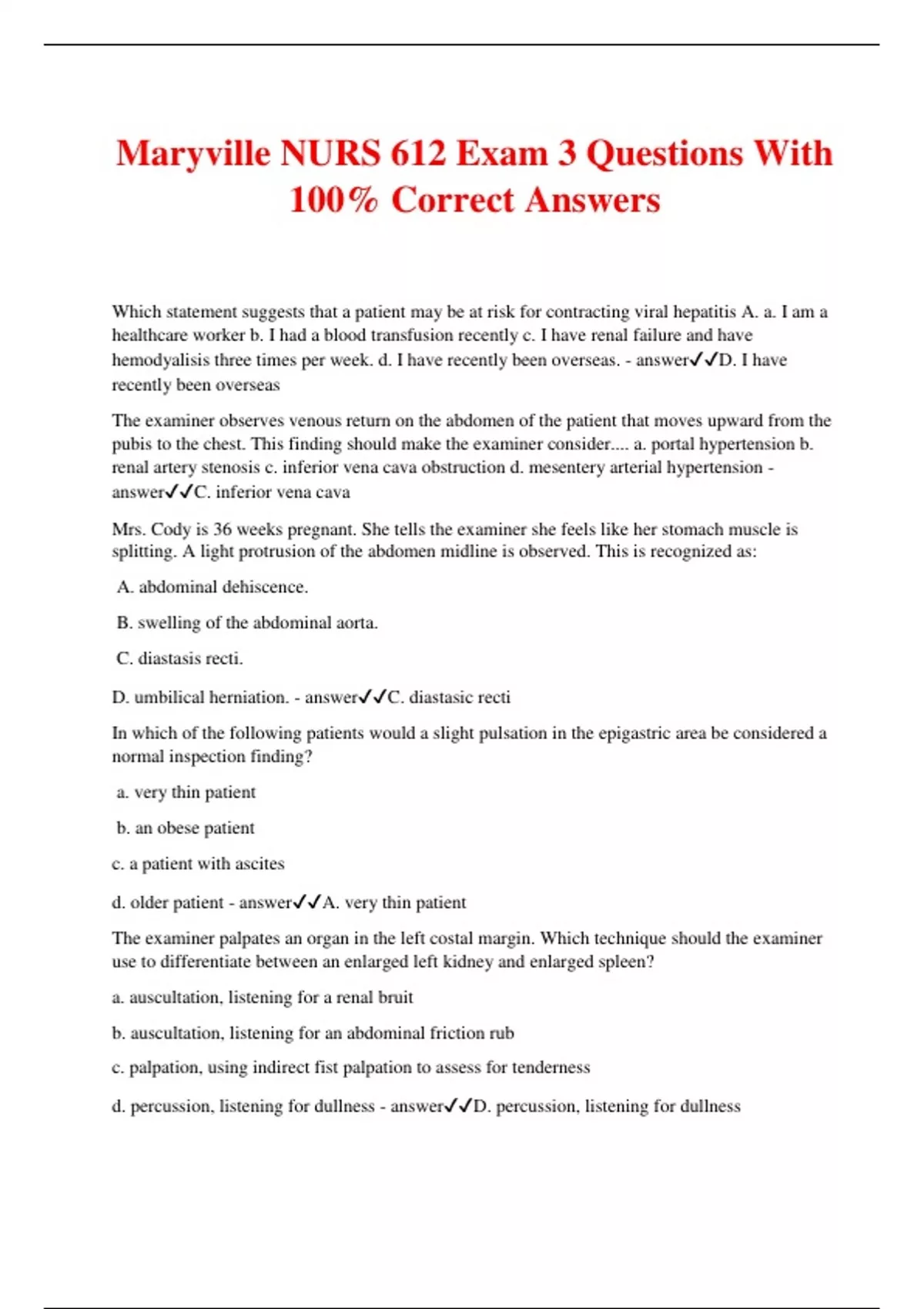 Maryville NURS 612 Exam 3 Questions With 100% Correct Answers Which statement suggests that a patient may be at risk for contracting viral hepatitis A. a. I am a healthcare worker b. I had a blood transfusion recently c. I have renal failure and have hemodyalisis three times per week. d. I have recently been overseas. - answerD. I have recently been overseas The examiner observes venous return on the abdomen of the patient that moves upward from the pubis to the chest. This finding should make the examiner consider.... a. portal hypertension b. renal artery stenosis c. inferior vena cava obstruction d. mesentery arterial hypertension - answerC. inferior vena cava Mrs. Cody is 36 weeks pregnant. She tells the examiner she feels like her stomach muscle is splitting. A light protrusion of the abdomen midline is observed. This is recognized as: A. abdominal dehiscence. B. swelling of the abdominal aorta. C. diastasis recti. D. umbilical herniation. - answerC. diastasic recti In which of the following patients would a slight pulsation in the epigastric area be considered a normal inspection finding? a. very thin patient b. an obese patient c. a patient with ascites d. older patient - answerA. very thin patient The examiner palpates an organ in the left costal margin. Which technique should the examiner use to differentiate between an enlarged left kidney and enlarged spleen? a. auscultation, listening for a renal bruit b. auscultation, listening for an abdominal friction rub c. palpation, using indirect fist palpation to assess for tenderness d. percussion, listening for dullness - answerD. percussion, listening for dullness A hiatal hernia is best described as: a. a protrusion of the abdominal contents through a weakening in the abdominal wall. b. a protrusion of the stomach through the esophageal opening in the diaphragm c. an ulcer in the mucous of the stomach that herniates into the peritoneal cavity. d. a herniation of the gallbladder in to the cystic duct. - answerB. a protrusion of the stomach through the esophageal opening in the diaphragm. An examiner may wish to use a bimanual technique for abdominal palpation when: A. palpating superficial organs. B. validating abdominal tenderness in the infant. C. meeting muscle resistance while performing deep palpation. D. determining the presence of excessive peritoneal fluid. - answerC. meeting muscle resistance while performing deep palpation A 2 1/2 year old presents with abdominal pain and stools that are red currant jelly in appearance. Which problem would the examiner suspect? a. meckel diverticulum b. pyloric stenosis c. intussusception d. Nectrotizing enterocolitis - answerC. intussusception You note that the midclavicular liver span of an adult patient is 18cm. With palpation you note that the liver is enlarged and nontender. What do these findings suggest? a. diverticulitis b. ulcerative colitis itis d. cirrhosis - answerd. cirrhosis the examiner is unable to palpate the liver or kidney the patient Which of the following techniques will help assess tenderness to these organs? a. application of continuous, firm pressure for 3 to 5 minutes b. percussion of tympany c. percussion for size d. indirect fist percussion - answerB. percussion of tympany Where is pain felt when an obturator muscle test is positive? A. Right hip and thigh B. Right hypogastric area C. Right lower quadrant and groin D. Beneath the right shoulder blade - answerB. Right hypogastric area Which of the following techniques is used to confirm the presence of abdominal ascites? A. Auscultation of fluid movement within the abdominal cavity B. Palpation of rebound tenderness C. Palpation of pitting edema D. Percussion of dullness over dependent areas of the abdomen - answerD. percussion of dullness over dependent areas of the abdomen Which of the following examination findings is indicative of peritoneal irritation or appendicitis? A. Rebound tenderness on palpation B. Shifting dullness over the abdomen on percussion C. Bruit heard over the abdominal aorta on auscultation D. Dullness over the suprapubic area on percussion - answerA. Rebound tenderness on palpation Which finding on a newborn infant suggests congenital anomaly? A. umbilical cord has one artery and one vein B. The umbilical cord is thick C. The umbilical cord is thin D. There is a small mass around the umbilicus - answerA. The umbilical cord has one artery and one vein A 61 year old man has a presenting complaint of frequent constipation. He tells the examiner that there has been a change in his bowel movement habits. He gets constipated easily and the stool is very skinny looking and has a different color than usual. He denies pain. What do these symptoms suggest? - answerC. Colon or rectal cancer The functional ability of the GI tract most severely affected by aging is ? - answermotility