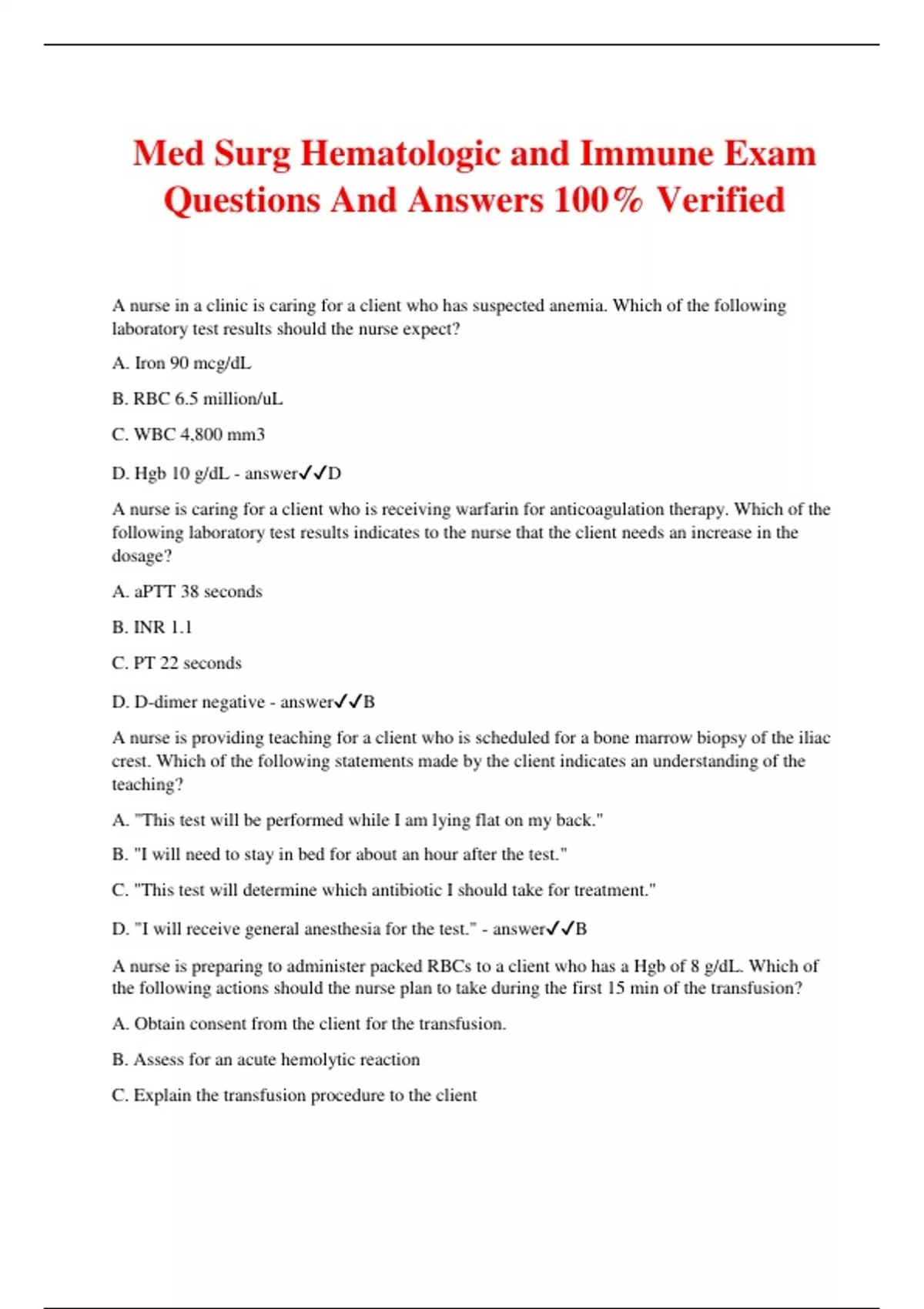 Med Surg Hematologic and Immune Exam Questions And Answers 100% Verified A nurse in a clinic is caring for a client who has suspected anemia. Which of the following laboratory test results should the nurse expect? A. Iron 90 mcg/dL B. RBC 6.5 million/uL C. WBC 4,800 mm3 D. Hgb 10 g/dL - answerD A nurse is caring for a client who is receiving warfarin for anticoagulation therapy. Which of the following laboratory test results indicates to the nurse that the client needs an increase in the dosage? A. aPTT 38 seconds B. INR 1.1 C. PT 22 seconds D. D-dimer negative - answerB A nurse is providing teaching for a client who is scheduled for a bone marrow biopsy of the iliac crest. Which of the following statements made by the client indicates an understanding of the teaching? A. "This test will be performed while I am lying flat on my back." B. "I will need to stay in bed for about an hour after the test." C. "This test will determine which antibiotic I should take for treatment." D. "I will receive general anesthesia for the test." - answerB A nurse is preparing to administer packed RBCs to a client who has a Hgb of 8 g/dL. Which of the following actions should the nurse plan to take during the first 15 min of the transfusion? A. Obtain consent from the client for the transfusion. B. Assess for an acute hemolytic reaction C. Explain the transfusion procedure to the client D. Obtain blood culture specimens to send to the lab - answerB A nurse is caring for a client who is receiving a blood transfusion. Which of the following actions should the nurse plan to take if an allergic transfusion reaction is suspected? (SATA) A. Stop the transfusion B. Monitor for hypertension C. Maintain an IV infusion with 0.9% sodium chloride D. Position the client in an upright position with the feet lower than the heart E. Administer diphenhydramine - answerA, C, E A nurse is monitoring a client who began receiving a unit of packed RBCs 10 min ago. Which of the following findings should the nurse identify as an indication of a febrile transfusion reaction? (SATA) A. Temperature change from 37 C (98.6 F) B. Current blood pressure 178/90 mm Hg C. Heart rate change from 88/min pretransfusion to 120/min D. Client report of itching E. Client appears flushed - answerC, E A nurse is providing preoperative teaching for a client who requests autologous donation in preparation for a scheduled orthopedic surgical procedure. Which of the following statements should the nurse include in the teaching? A. "You should make an appointment to donate blood 8 weeks prior to the surgery." B. "If you need an autologous transfusion, the blood your brother donates can be used." C. "You can donate blood each week if your hemoglobin is stable." D. "Any unused blood that is donated can be used for other clients." - answerC A nurse preceptor is observing a newly licensed nurse on the unit who is preparing to administer a blood transfusion to an older adult client. Which of the following actions by the newly licensed nurse indicates an understanding of the procedure? A. Inserts an 18-gauge IV catheter in the client B. Verifies blood compatibility and expiration date of the blood with an assistive personnel (AP) C. Administers dextrose 5% in 0.9% sodium chloride IV with the transfusion D. Obtains vital signs every 15 min throughout the procedure - answerD A nurse is planning care for a client who has Hgb 7.5 g/dL and Hot 21.5%. Which of the following actions should the nurse include in the pan of care? (SATA) A. Provide assistance with ambulation B. Monitor oxygen saturation C. Weigh the client weekly D. Obtain stool specimen for occult blood E. Schedule daily rest periods - answerA, B, D, E A nurse is teaching a client who has a new prescription for ferrous sulfate. Which of the following information should the nurse include in the teaching? A. Stools will be dark red B. Take with a glass of milk if gastrointestinal distress occurs C. Foods high in vitamin C will promote absorption D. Take for 14 days - answerC A nurse is providing discharge teaching to a client who had a gastrectomy for stomach cancer. Which of the following information should the nurse include in the teaching? (SATA) A. "You will need a monthly injection of vitamin B12 for the rest of your life." B. "Using the nasal spray form of vitamin B12 on a daily basis can be an option." C. "An oral supplement of vitamin B12 taken on a daily basis can be an option." D. "You should increase your intake of animal proteins, legumes, and dairy products to increase vitamin B12 in your diet." E. "Add soy milk fortified with vitamin B12 to your diet to decrease the risk of pernicious anemia." - answerA, B A nurse is completing an integumentary assessment of a client who has anemia. Which of the following findings should the nurse expect? A. Absent turgor B. Spoon-shaped nails C. Shiny, hairless legs D. Yellow mucous membranes - answerB A nurse in a clinic receives a phone call from a client seeking information about a new prescription for erythropoietin. Which of the following information should the nurse review with the client?