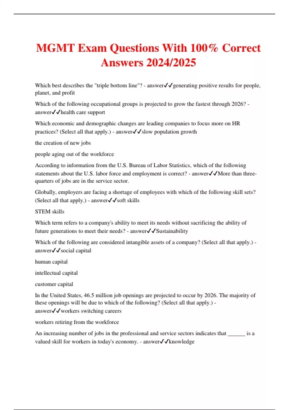 MGMT Exam Questions With 100% Correct Answers 2024/2025 Which best describes the "triple bottom line"? - answergenerating positive results for people, planet, and profit Which of the following occupational groups is projected to grow the fastest through 2026? - answerhealth care support Which economic and demographic changes are leading companies to focus more on HR practices? (Select all that apply.) - answerslow population growth the creation of new jobs people aging out of the workforce According to information from the U.S. Bureau of Labor Statistics, which of the following statements about the U.S. labor force and employment is correct? - answerMore than three- quarters of jobs are in the service sector. Globally, employers are facing a shortage of employees with which of the following skill sets? (Select all that apply.) - answersoft skills STEM skills Which term refers to a company's ability to meet its needs without sacrificing the ability of future generations to meet their needs? - answerSustainability Which of the following are considered intangible assets of a company? (Select all that apply.) - answersocial capital human capital intellectual capital customer capital In the United States, 46.5 million job openings are projected to occur by 2026. The majority of these openings will be due to which of the following? (Select all that apply.) - answerworkers switching careers workers retiring from the workforce An increasing number of jobs in the professional and service sectors indicates that ______ is a valued skill for workers in today's economy. - answerknowledge