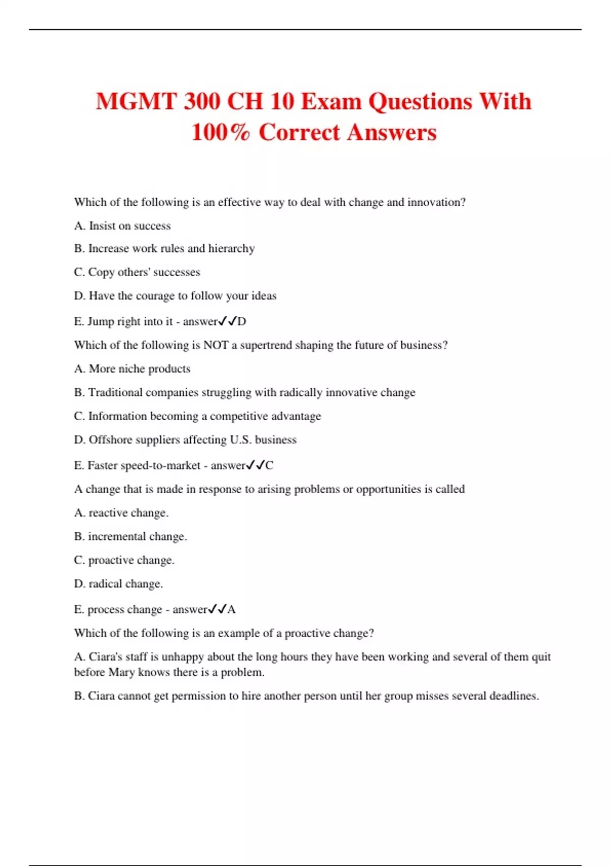 MGMT 300 CH 10 Exam Questions With 100% Correct Answers Which of the following is an effective way to deal with change and innovation? A. Insist on success B. Increase work rules and hierarchy C. Copy others' successes D. Have the courage to follow your ideas E. Jump right into it - answerD Which of the following is NOT a supertrend shaping the future of business? A. More niche products B. Traditional companies struggling with radically innovative change C. Information becoming a competitive advantage D. Offshore suppliers affecting U.S. business E. Faster speed-to-market - answerC A change that is made in response to arising problems or opportunities is called A. reactive change. B. incremental change. C. proactive change. D. radical change. E. process change - answerA Which of the following is an example of a proactive change? A. Ciara's staff is unhappy about the long hours they have been working and several of them quit before Mary knows there is a problem. B. Ciara cannot get permission to hire another person until her group misses several deadlines. C. Ciara's group sent a product that was nearing its launch date back to the drawing board based on a competitor's superior new offering. D. Ciara explores探索improvements in bonus structures with her staff and begins to implement them prior to any serious discontent on the part of the staff. E. Ciara is constantly "putting out fires", responding to daily crises in her group. - answerD Wal-Mart's implementation of RFID, a type of technology that allows it to improve inventory tracking, is an example of a(n) ______ change. A. reactive B. incremental C. proactive D. responsive E. radical - answerC Which of the following is an example of a force for change originating outside the organization? A. Productivity issues B. Conflict management C. Structural reorganization D. Absenteeism E. Social pressures - answerE The invention of a machine to make plastic corks for wine bottles has severely affected companies that produce traditional cork. This is an example of a(n) ______ change. A. market B. social & political C. demographic D. technological E. economic - answerD The increasing diversity of the American workforce is an example of a(n) ______ change. A. demographic B. market C. social & political D. political E. economic - answerA Inside forces for change include which of the following? A. Domestic competition B. Turnover C. Advancements in automation D. Immigration E. Recession - answerB Arizona Pottery is having a difficult time finding inexpensive labor, which it attributes to an unfriendly climate toward Hispanics since the passage of tough illegal immigration legislation in that state. This is an example of a(n) ______ change. A. market B. employee C. social and political D. technological E. economic - answerC With the recession and the accompanying high levels of unemployment, La Russo's Italian Ice has had its choice of employees to support its growth. This is an example of a(n) ______ change. A. market B. social or political C. arbitrary D. technological E. demographic - answerA Recently many older workers who had planned to retire soon decided to keep working longer. This is an example of a(n) ______ change. A. social or political B. arbitrary C. demographic D. economic