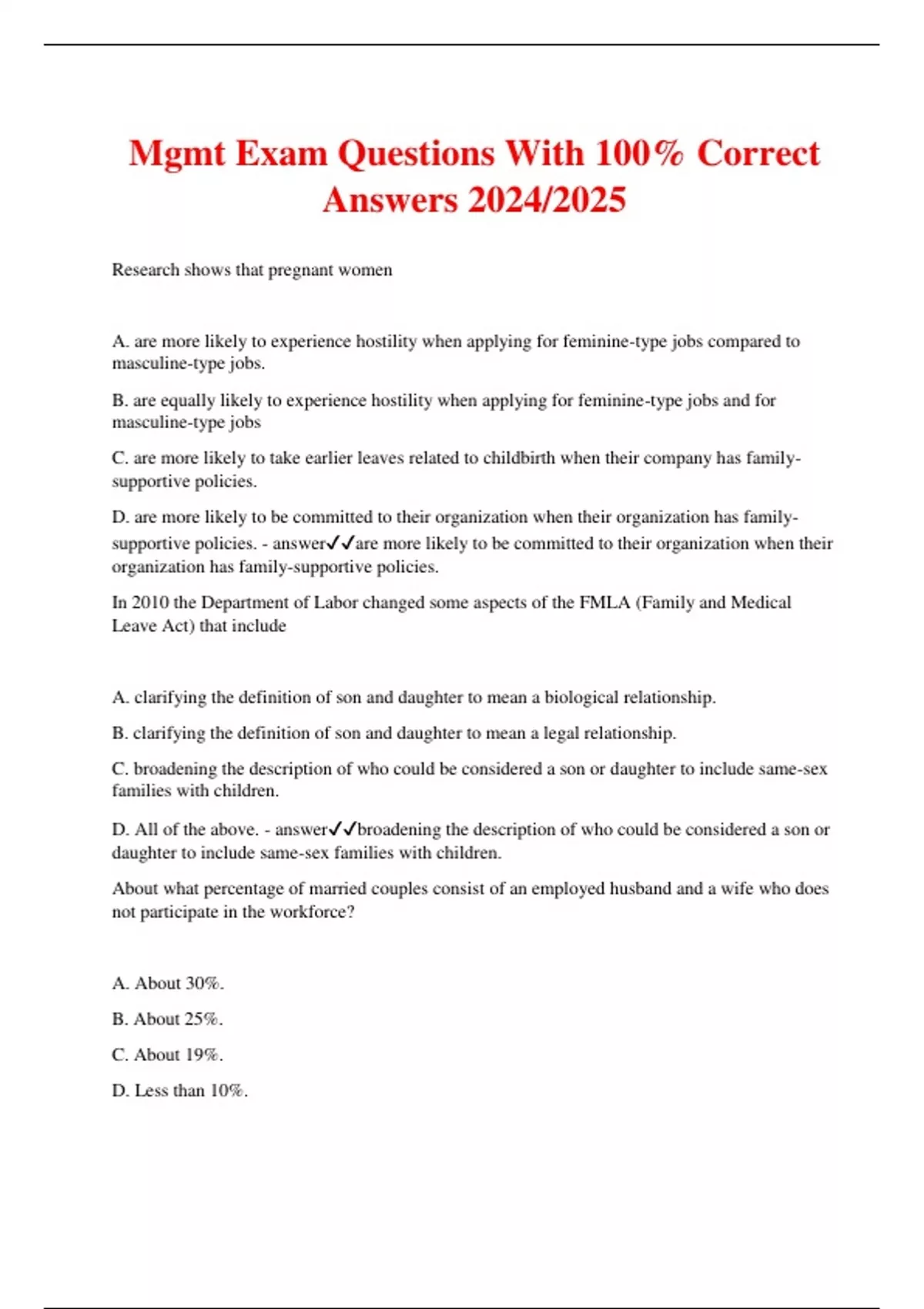 Mgmt Exam Questions With 100% Correct Answers 2024/2025 Research shows that pregnant women A. are more likely to experience hostility when applying for feminine-type jobs compared to masculine-type jobs. B. are equally likely to experience hostility when applying for feminine-type jobs and for masculine-type jobs C. are more likely to take earlier leaves related to childbirth when their company has family- supportive policies. D. are more likely to be committed to their organization when their organization has family- supportive policies. - answerare more likely to be committed to their organization when their organization has family-supportive policies. In 2010 the Department of Labor changed some aspects of the FMLA (Family and Medical Leave Act) that include A. clarifying the definition of son and daughter to mean a biological relationship. B. clarifying the definition of son and daughter to mean a legal relationship. C. broadening the description of who could be considered a son or daughter to include same-sex families with children. D. All of the above. - answerbroadening the description of who could be considered a son or daughter to include same-sex families with children. About what percentage of married couples consist of an employed husband and a wife who does not participate in the workforce? A. About 30%. B. About 25%. C. About 19%. D. Less than 10%. E. None of the above. - answerAbout 19%. Men's covered wives or partners are also provided protection under the act. B. Nearly 50% of the cases filed with the EEOC under Pregnancy Discrimination Act were resolved with merit. C. Prior to passage of the act, employers commonly required pregnant women to take leaves of absence or to resign. D. All of the above. E. A and C only above. - answerA and C only above. Which of the following is not true of the Pregnancy Discrimination Act? A. Women who are pregnant must be allowed to continue working as long as they are able to perform their jobs. B. Women who are temporarily unable to perform their jobs must be treated the same as any other employee with a temporary disability. C. Co-pays for pregnancy must be the same as those provided for other medical conditions. D. The Pregnancy Discrimination Act requires employers to provide medical benefits for pregnancy and related conditions. - answerThe Pregnancy Discrimination Act requires employers to provide medical benefits for pregnancy and related conditions. Which of the following is true of the relationships between sex, marital status, and children discussed in the text? A) Married men are less likely to be promoted than single men. B) Married women are more likely to be promoted than single women. C) Having pre-school aged children is associated with higher rates of promotion for men. D) Having pre-school aged children is associated with higher rates of promotion for women. - answerHaving pre-school aged children is associated with higher rates of promotion for men. Flexible scheduling A. is more likely to be available to women than men. B. is associated with lower turnover. C. increases stress in dealing with work and family issues. D. is available to the majority of workers in the U.S. - answeris associated with lower turnover. In comparing earnings for men and women, researchers have found that A. male managers, but not female managers, perceive women as less promotable than men due to having greater work/family life conflict than men. B. male managers, but not female managers, perceive women as poorer performers who fit their jobs less well. C. male and female managers perceive women as less promotable than men due to having greater work/family life conflict than men. D. differences in earnings and promotions do not reflect behaviors of men and women at work. - answermale and female managers perceive women as less promotable than men due to having greater work/family life conflict than men. Which of the following are important considerations for employers when developing schedules for single employees? A. Regardless of marital status, all employees could make use of flexible schedules and leaves. B. Avoid asking single employees to perform duties that would not be expected of employees with family needs. C. When given flexible scheduling choices, single employees repay employers through greater willingness to provide extra help when needed. D. All of the above. - answerAll of the above. Which of the following is true of the family policies in the U.S. and some countries discussed in the text? A. In the U.S., most states offer paid leave for family emergencies. B. The FMLA provides up to 6 months of unpaid leave, while leave in Europe is limited to 3 months. C. The FMLA covers all workers, while policies in Europe are limited to the highest wage earners. D. Many countries other than the U.S. provide government subsidized or funded childcare for younger children, much like public schools do in the U.S for older children. - answerMany