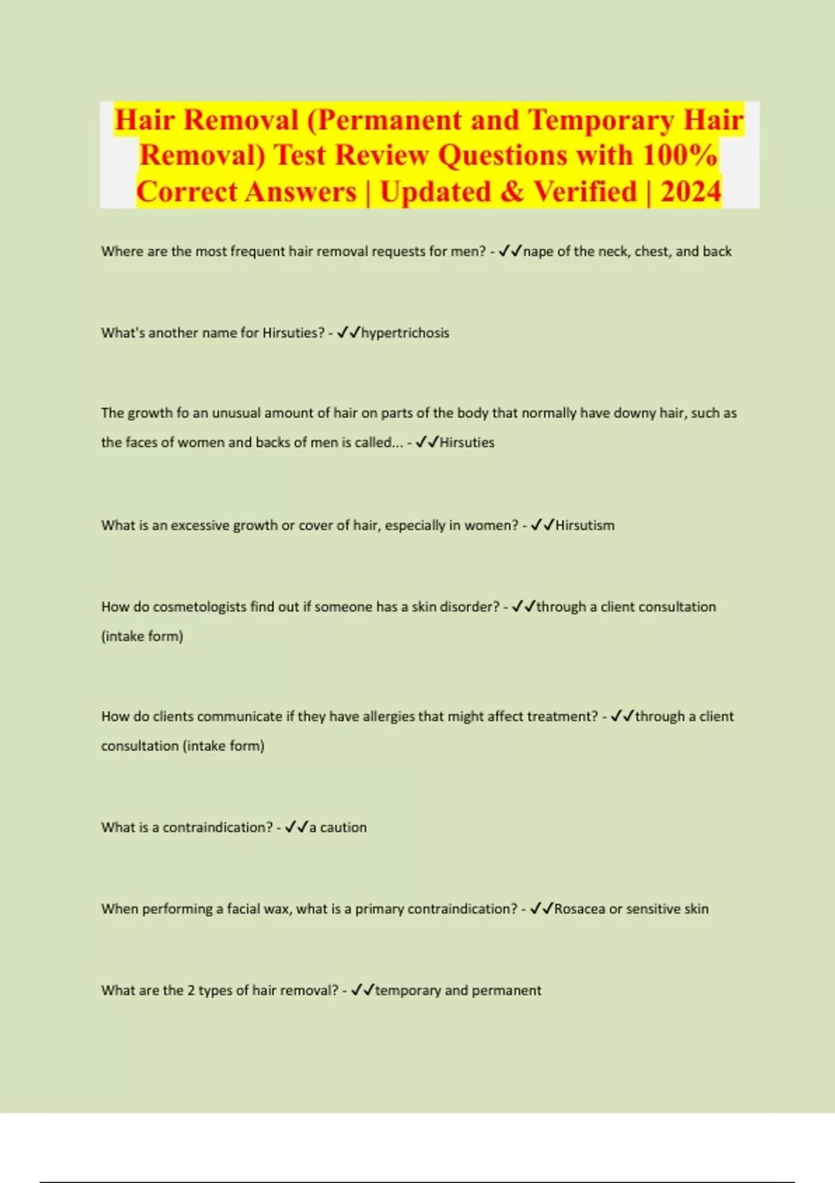 Hair Removal (Permanent and Temporary Hair Removal) Test Review Questions with 100% Correct Answers | Updated & Verified | 2024