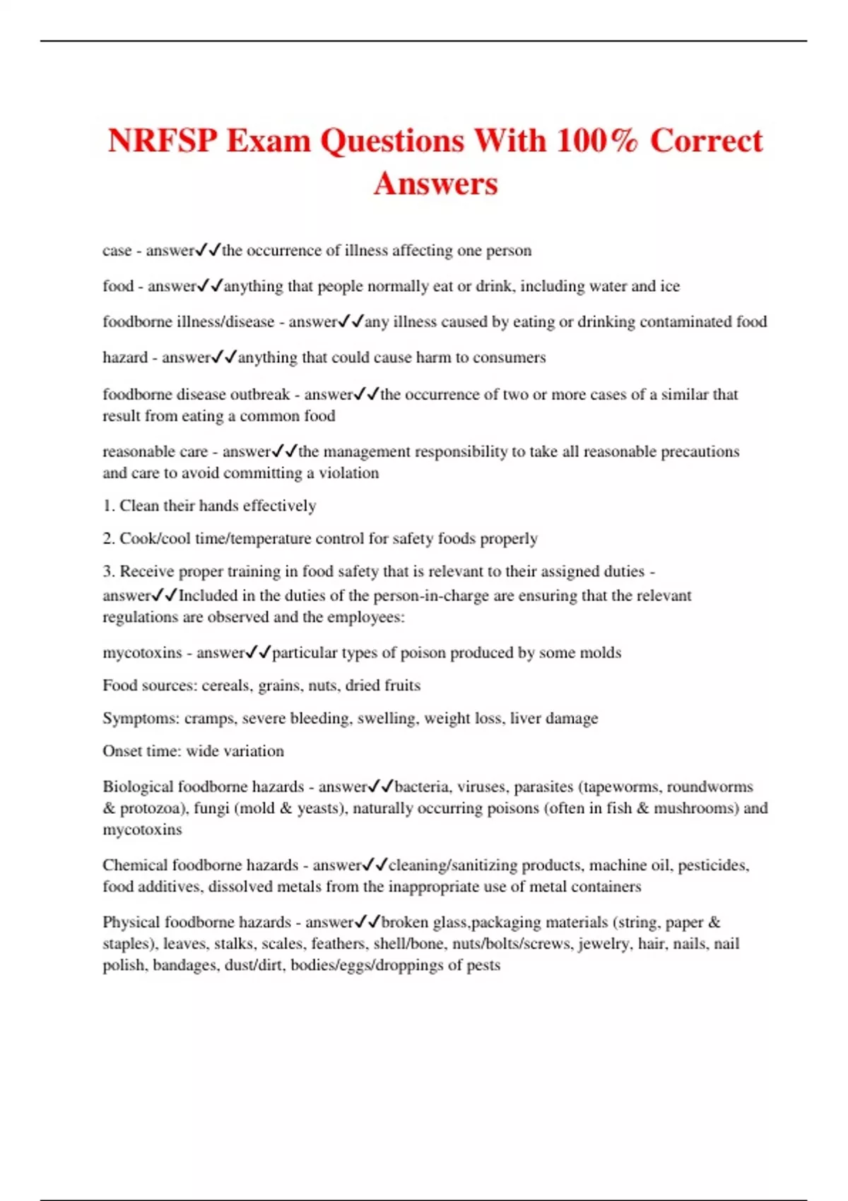 NRFSP Exam Questions With 100% Correct Answers Canned foods must be purchased from an approved source to make sure they - answerhave been processed to destroy disease-causing microorganisms. The delivery inspection of dry foods should include checking for - answerintact packaging, dry and undamaged food, dry containers, insect infestation and clean delivery truck. Upon delivery, fresh fish should have - answerbright red moist gills, eyes that are clear and skin bright in color. Home-canned foods are NOT allowed in a food establishment because of the potential danger of - answerbacteria that produce botulism toxin. Pasteurized products, such as milk and fruit juices, are - answerheated to temperatures that reduce bacteria to safe levels. When using chemical sanitizers for swab or spray application, it is necessary to use ____ times the concentration as used for immersion sanitizing. - answer2 Chlorine sanitizers used in low-temperature dishwashing machines work best when the temperature of the final rinse water is maintained between which temperatures? - answer120°F (49°C) and 140°F (60°C). The water supply to your food establishment is interrupted for several hours. You should NOT - answerkeep preparing and serving food as usual after telling the health department of the problem The only 100% effective back flow preventive device is a(n) - answerAir gap A food establishment restroom must be stocked with all of the following EXCEPT - answerA common use towel A properly designed toilet facility within a food establishment must have - answerTight fitting self-closing doors A food service employee has a head cold with discharge from eyes and nose. What work activity would be acceptable for this employee? - answerRemoving garbage from the premises Brushes, mops, buckets, and other non-food items used in food prep areas should be - answerCleaned and sanitized every day The unit used for measuring chemica