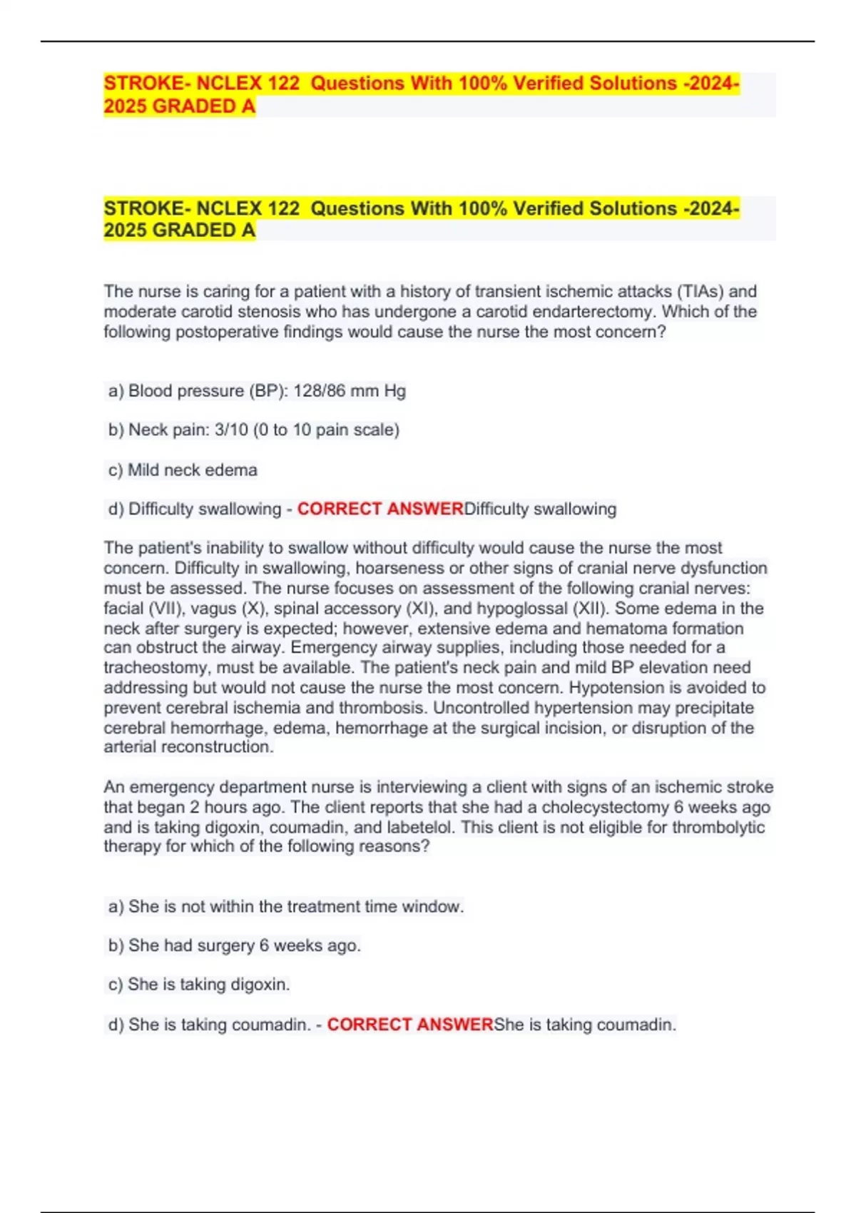 STROKE- NCLEX|122 Questions With 100% Verified Solutions - GRADED A
