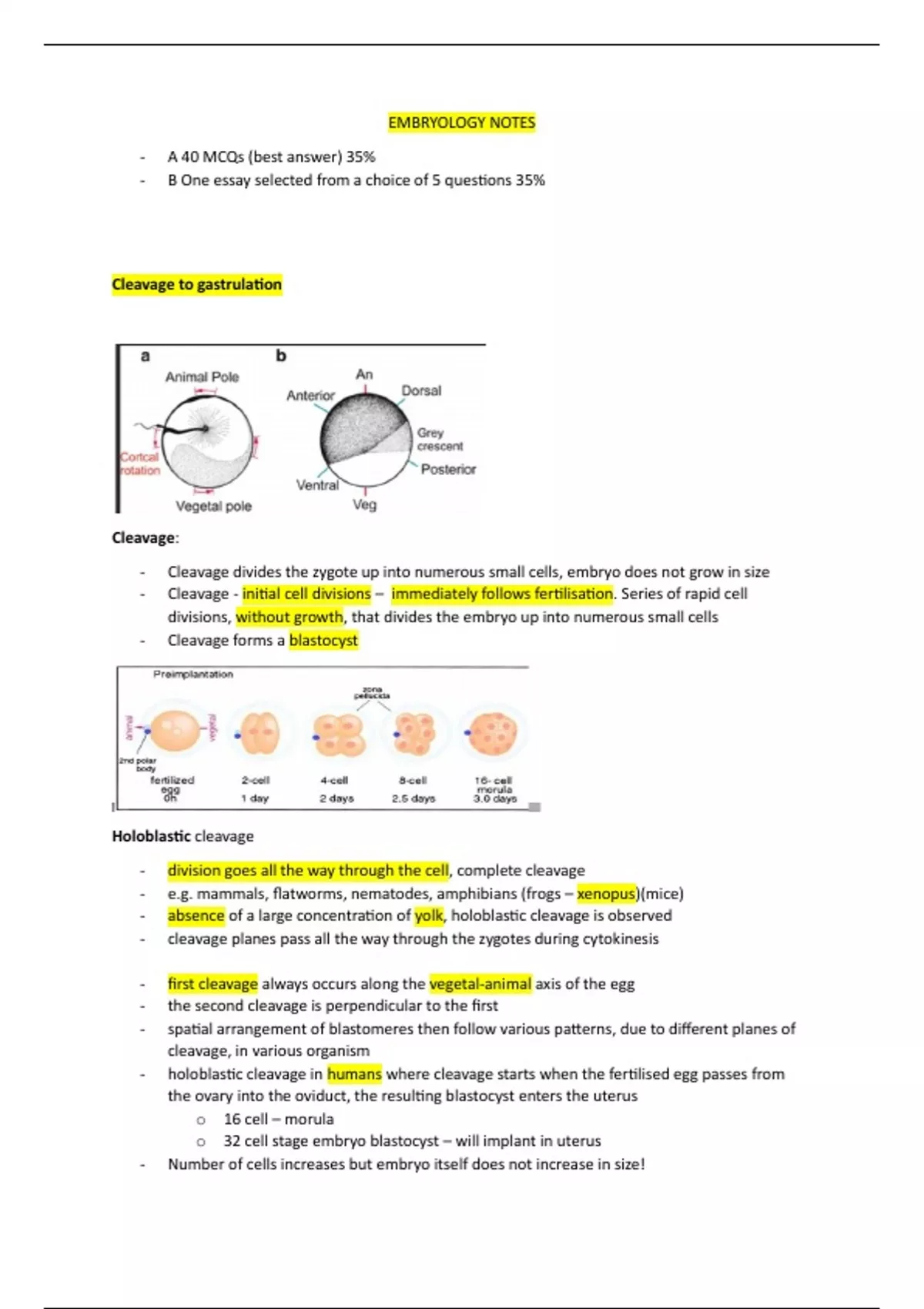 - 2 types of cleavage: holoblastic (animals with little yolk) meroblastic (lot of yolk)