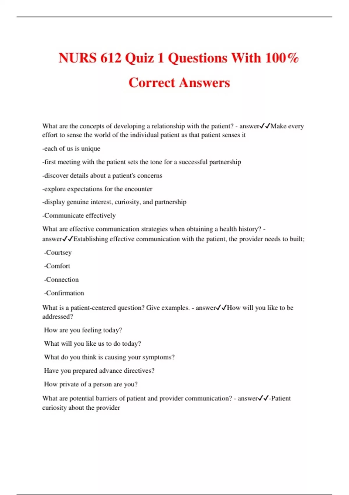 NURS 612 Quiz 1 Questions With 100% Correct Answers What are the concepts of developing a relationship with the patient? - answerMake every effort to sense the world of the individual patient as that patient senses it -each of us is unique -first meeting with the patient sets the tone for a successful partnership -discover details about a patient's concerns -explore expectations for the encounter -display genuine interest, curiosity, and partnership -Communicate effectively What are effective communication strategies when obtaining a health history? - answerEstablishing effective communication with the patient, the provider needs to built; -Courtsey -Comfort -Connection -Confirmation What is a patient-centered question? Give examples. - answerHow will you like to be addressed? How are you feeling today? What will you like us to do today? What do you think is causing your symptoms? Have you prepared advance directives? How private of a person are you? What are potential barriers of patient and provider communication? - answer-Patient curiosity about the provider -Anxiety -Silence -Depression -Seduction -Anger -Avoiding the full story -Financial considerations What is the structure and the components of a patient history? What kind of patient information is obtained in each section? - answerPatient identifiers Chief complain HPI- history of present illines PHM- past medical history FH- family history SH- social history What is the difference between objective and subjective data? What components of the health history are objective and subjective? - answerSubjective data is gathered from the patient telling you something that you cannot use your five senses to measure. Objective data is the information that we can gather using our 5 senses. It is either a measurement or an observation. Components that are subjective include patients description of review of symptoms, past medical/social history. Components that are objective include physical exam of review of symptoms, vital signs, lab values or test results. How do you approach sensitive issues when interviewing a patient? - answerProvide privacy, avoid confrontation, be direct and firm, do not apologize for asking questions, do not ask leading questions, do not push too hard, always use language that is understandable to the patient, but not patronizing. What does it mean to be culturally aware and culturally competent when caring for patients with diverse backgrounds? - answerCulturally competent requires one to be sensitive to a patient's heritage, sexual orientation, socioeconomic situation, ethnicity, and cultural background. Culturally aware refers to understanding one's own biases, stereotypes, prejudices, and assumptions of others who are different from them. What are examples of questions to explore the patient's culture? - answerWhy do you think it started when it did? What should be done to get rid of it? What are the most important problems your sickness has caused for you? What worries you and frightens you the most about your sickness? What are the components of a cultural response to a patient? - answer-Modes of communication: the use of speech, body language, and space -Health beliefs and practices that may vary from your own -Diet and nutritional practices -The nature of relationships with families How do you measure visual acuity and test cranial nerve II (Optic)? Describe the various tests to measure different types of visual acuity. How do you document your findings? - answerVisual acuity testing measures the function of CN2 -(optic nerve) central vision: ALWAYS TEST W/O GLASSES FIRST! Document W and W/O glasses -Snellen chart for distance vision smaller the fraction, worse the vision 20/200 is legally blind -Rosenbaum chart for near vision 14 inches fm eyes. Read smallest line possible -Confrontation test for peripheral vision Sit at eye level, 1 meter apart. Examiner covers eye directly opposite of pt. ABNORMAL RESULTS: caused by Stroke, retinal detachment, optic neuropathy, pituitary tumor compression, central retinal vascular occlusion -Amsler grid is used to evaluate macular degeneration -Tumbling E / HOTV charts→ test children ages 3-5, 10 feet from chart. When you palpate the eyes, what are you assessing for? - answer1. for nodules 2. .ntraoccular pressure ( one eye will be harder than the other) 3. pain→ scleritis, orbital cellulitis, cavernous sinus thrombosis 4. Firm and resists palpation→ severe glaucoma, retrobulbar tumor Describe you would inspect the lower and upper conjunctiva.