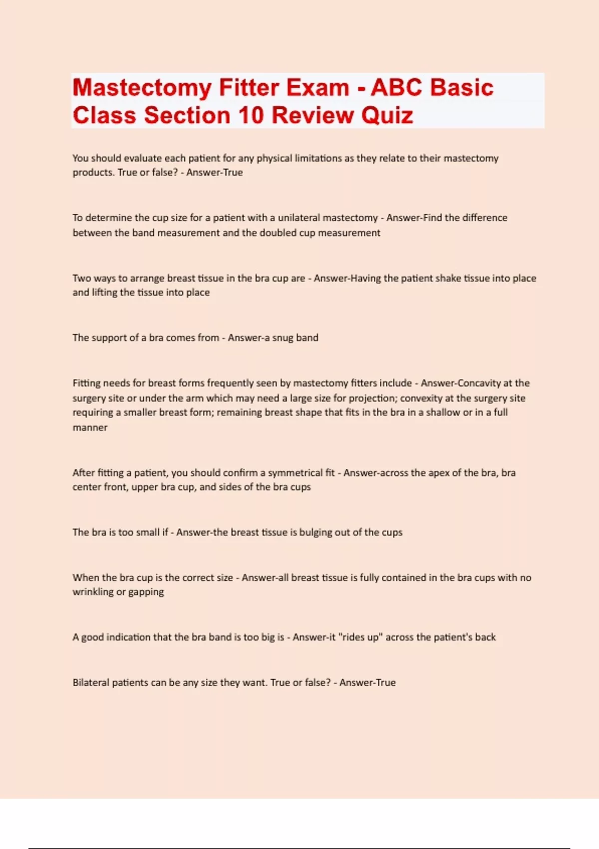 Mastectomy Fitter Exam - ABC Basic Class Section 10 Review Quiz Questions & Answers Already Passed!!