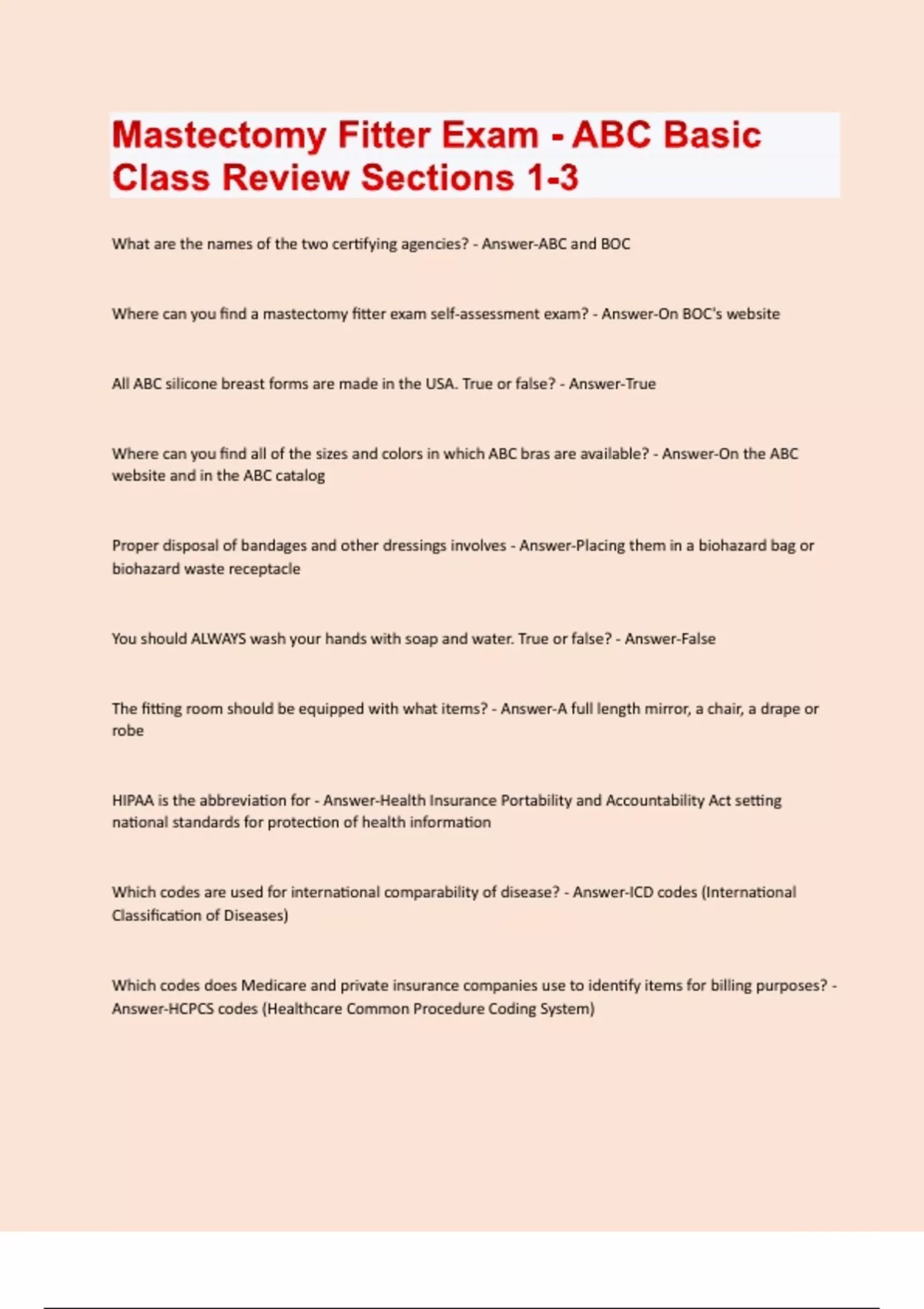 What are the names of the two certifying agencies? - Answer-ABC and BOC Where can you find a mastectomy fitter exam self-assessment exam? - Answer-On BOC's website All ABC silicone breast forms are made in the USA. True or false? - Answer-True Where can you find all of the sizes and colors in which ABC bras are available? - Answer-On the ABC website and in the ABC catalog Proper disposal of bandages and other dressings involves - Answer-Placing them in a biohazard bag or biohazard waste receptacle You should ALWAYS wash your hands with soap and water. True or false? - Answer-False The fitting room should be equipped with what items? - Answer-A full length mirror, a chair, a drape or robe HIPAA is the abbreviation for - Answer-Health Insurance Portability and Accountability Act setting national standards for protection of health information Which codes are used for international comparability of disease? - Answer-ICD codes (International Classification of Diseases) Which codes does Medicare and private insurance companies use to identify items for billing purposes? - Answer-HCPCS codes (Healthcare Common Procedure Coding System)