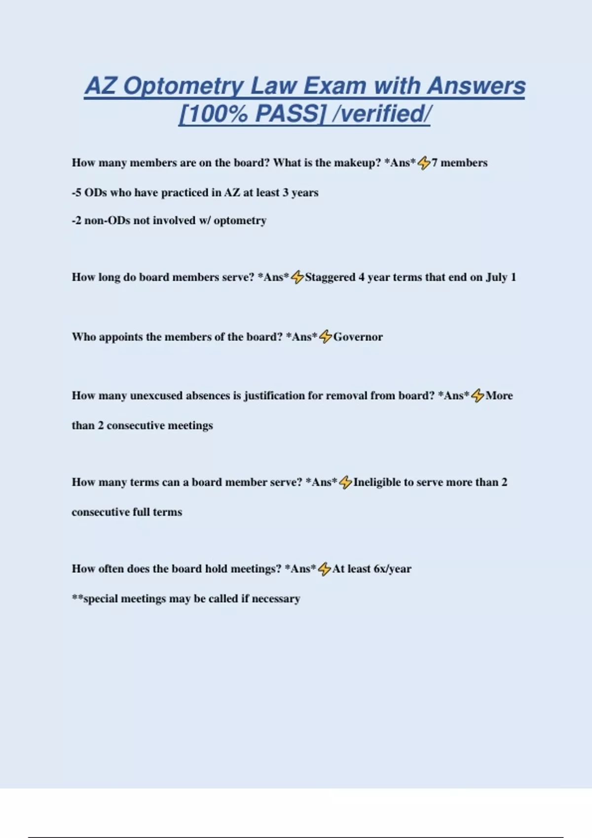 AZ Optometry Law Exam with Answers [100% PASS] /verified/ How many members are on the board? What is the makeup? *Ans* 7 members -5 ODs who have practiced in AZ at least 3 years -2 non-ODs not involved w/ optometry How long do board members serve? *Ans* Staggered 4 year terms that end on July 1 Who appoints the members of the board? *Ans* Governor How many unexcused absences is justification for removal from board? *Ans* More than 2 consecutive meetings How many terms can a board member serve? *Ans* Ineligible to serve more than 2 consecutive full terms How often does the board hold meetings? *Ans* At least 6x/year **special meetings may be called if necessary Do members of board receive compensation? *Ans* Receive compensation as determined pursuant to section 38-611 for each day spent in performance of duties (as well as executive director if applicable) 4 items the board may not adopt a rule that: *Ans* 1. Regulates a licensee's fee or charges to patient 2. Regulates the place in which a licensee may practice 3. Prescribes the matter or method of accounting, billing, or collection of fees 4. Prohibits advertising by a licensee unless the advertising is inconsistent w/ section 44- 1481 What is purpose of executive director? (Title 41, chapter 4, article 4) *Ans* The board may hire an executive director as an employee of the board responsible for administrative functions What is title 41, chapter 4, article 4? *Ans* The board may hire consultants and professional and clerical personnel as required to perform its duties When must a person file if they are aggrieved by action taken by board? *Ans* A written request w/in 30 days after that person is notified of action by personal delivery or certified mail