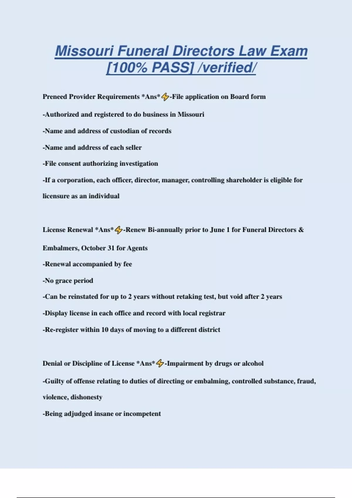 Missouri Funeral Directors Law Exam [100% PASS] /verified/ Preneed Provider Requirements *Ans* -File application on Board form -Authorized and registered to do business in Missouri -Name and address of custodian of records -Name and address of each seller -File consent authorizing investigation -If a corporation, each officer, director, manager, controlling shareholder is eligible for licensure as an individual License Renewal *Ans* -Renew Bi-annually prior to June 1 for Funeral Directors & Embalmers, October 31 for Agents -Renewal accompanied by fee -No grace period -Can be reinstated for up to 2 years without retaking test, but void after 2 years -Display license in each office and record with local registrar -Re-register within 10 days of moving to a different district Denial or Discipline of License *Ans* -Impairment by drugs or alcohol -Guilty of offense relating to duties of directing or embalming, controlled substance, fraud, violence, dishonesty -Being adjudged insane or incompetent -Pre-signing a death certificate on a body not embalmed by or under the direction of the licensee Make Up of State Board *Ans* -10 members, 9 licensed, 1 public -1 member from each of the Missouri Congressional Districts -Members serve for 5 years -Must submit audited financial statements -Licensed members in active practice for 5 years -US Citizen -Missouri resident for 1 year -Qualified Voter -Of good moral character -No more than 5 members from any 1 political party -Public member must not have any involvement in the funeral industry -Public member not to participate in discussions of technical questions -All members take an oath Board Meetings *Ans* -At least 2 meetings per year -3 members constitutes a quorum -Elect officers: Chairman, Vice-chairman, Secretary -Officers serve 1 year, April-March -All board members may participate in voting