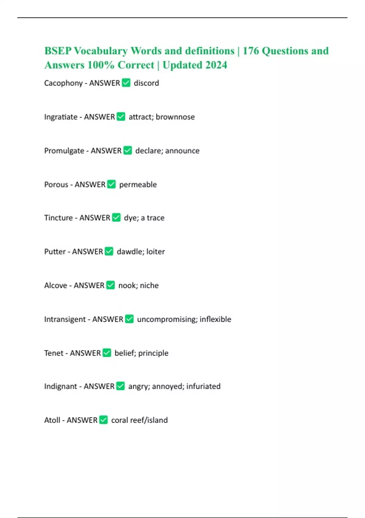 BSEP Vocabulary Words and definitions | 176 Quest ions and Answers 100% Correc t | Update d 2024 Cacophony - ANSWER discord Ingratiate - ANSWER attract; brownnose Promulgate - ANSWER declare; announce Porous - ANSWER permeable Tincture - ANSWER dye; a trace Putter - ANSWER dawdle; loiter Alcove - ANSWER nook; niche Intransigent - ANSWER uncompromising; inflexible Tenet - ANSWER belief; principle Indignant - ANSWER angry; annoyed; infuriated Atoll - ANSWER coral reef/island Sedentary - ANSWER sitting; idle Extol - ANSWER acclaim; applaud Repugnant - ANSWER disagreeable; offensive Impertinent - ANSWER arrogant; rude; irrelevant Engender - ANSWER bring about; create; develop Foment - ANSWER instigate; provoke;stimulate Thorny - ANSWER difficult; complex Assuage - ANSWER relieve; soothe; allay Fallacy - ANSWER false notion; misleading belief Succor - ANSWER relief; assistance; aid Jeer - ANSWER scoff; taunt Yarn - ANSWER tale