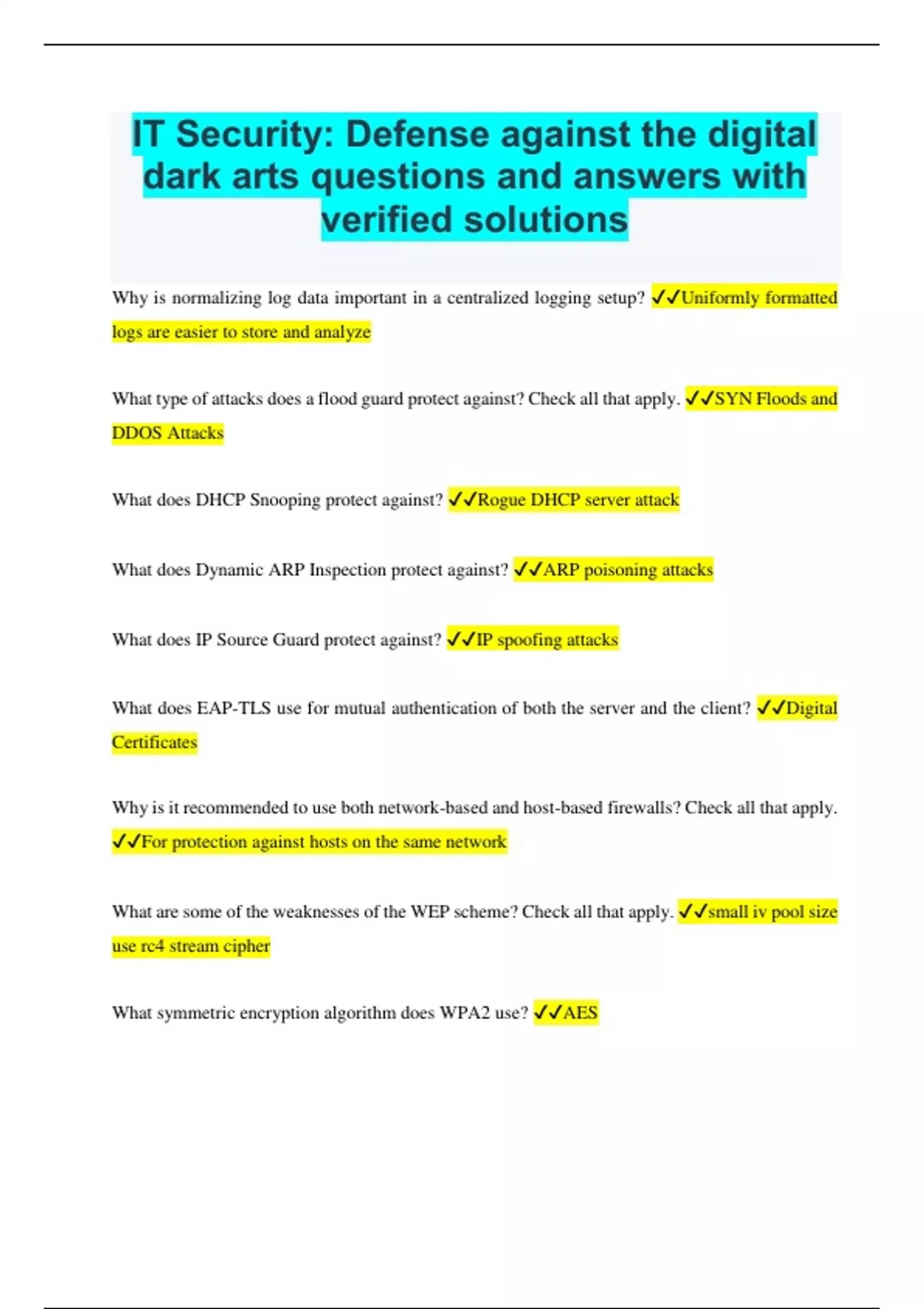 IT Security: Defense against the digital dark arts questions and answers with verified solutions Why is normalizing log data important in a centralized logging setup? Uniformly formatted logs are easier to store and analyze What type of attacks does a flood guard protect against? Check all that apply. SYN Floods and DDOS Attacks What does DHCP Snooping protect against? Rogue DHCP server attack What does Dynamic ARP Inspection protect against? ARP poisoning attacks What does IP Source Guard protect against? IP spoofing attacks What does EAP-TLS use for mutual authentication of both the server and the client? Digital Certificates Why is it recommended to use both network-based and host-based firewalls? Check all that apply. For protection against hosts on the same network What are some of the weaknesses of the WEP scheme? Check all that apply. small iv pool size use rc4 stream cipher What symmetric encryption algorithm does WPA2 use? AESHow can you reduce the likelihood of WPS brute-force attacks? Check all that apply disable wps Select the most secure WiFi security configuration from below: WPA2 ENTERPRISE What does tcpdump do? Select all that apply. Analyzes packets and provides a textual analysis Capture packets What does wireshark do differently from tcpdump? Check all that apply. It has a graphical interface understand more application-level protocols What factors should you consider when designing an IDS installation? Check all that apply. traffic bandwidth Storage Capacity What is the difference between an Intrusion Detection System and an Intrusion Preventi