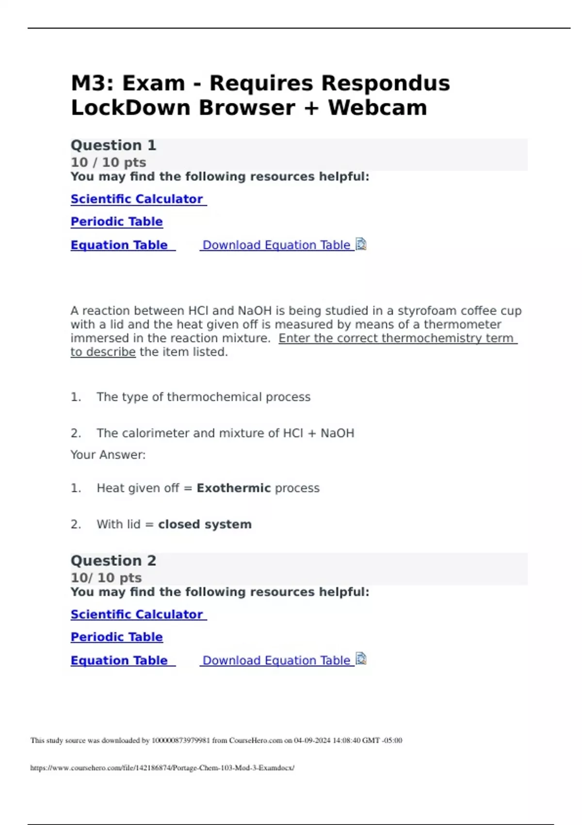 Equation Table Download Equation T able A reaction between HCl and NaOH is being studied in a styrofoam coffee cup with a lid and the heat given off is measured by means of a thermometer immersed in the reaction mixture. Enter the correct thermochemistry term to describe the item listed. 1. The type of thermochemical process