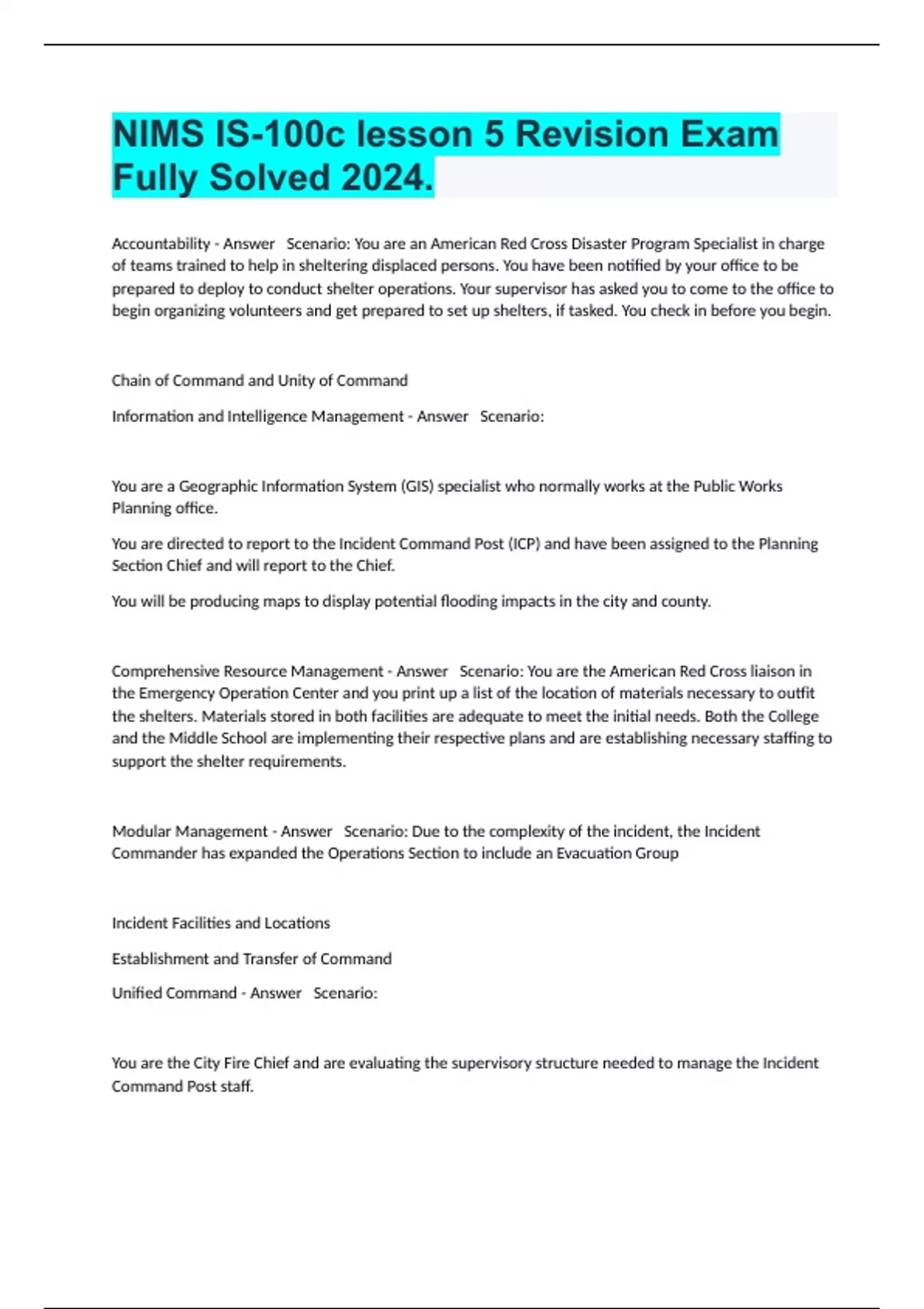 Accountability - Answer Scenario: You are an American Red Cross Disaster Program Specialist in charge of teams trained to help in sheltering displaced persons. You have been notified by your office to be prepared to deploy to conduct shelter operations. Your supervisor has asked you to come to the office to begin organizing volunteers and get prepared to set up shelters, if tasked. You check in before you begin. Chain of Command and Unity of Command Information and Intelligence Management - Answer Scenario: You are a Geographic Information System (GIS) specialist who normally works at the Public Works Planning office. You are directed to report to the Incident Command Post (ICP) and have been assigned to the Planning Section Chief and will report to the Chief. You will be producing maps to display potential flooding impacts in the city and county. Comprehensive Resource Management - Answer Scenario: You are the American Red Cross liaison in the Emergency Operation Center and you print up a list of the location of materials necessary to outfit the shelters. Materials stored in both facilities are adequate to meet the initial needs. Both the College and the Middle School are implementing their respective plans and are establishing necessary staffing to support the shelter requirements. Modular Management - Answer Scenario: Due to the complexity of the incident, the Incident Commander has expanded the Operations Section to include an Evacuation Group Incident Facilities and Locations Establishment and Transfer of Command Unified Command - Answer Scenario: You are the City Fire Chief and are evaluating the supervisory structure needed to manage the Incident Command Post staff.