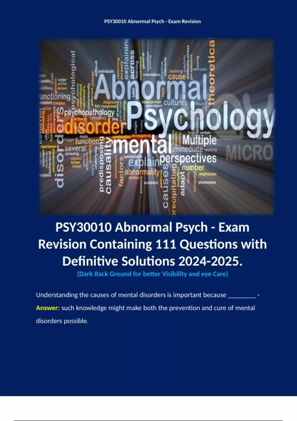 PSY30010 Abnormal Psych - Exam Revision Containing 111 Questions with Definitive Solutions .