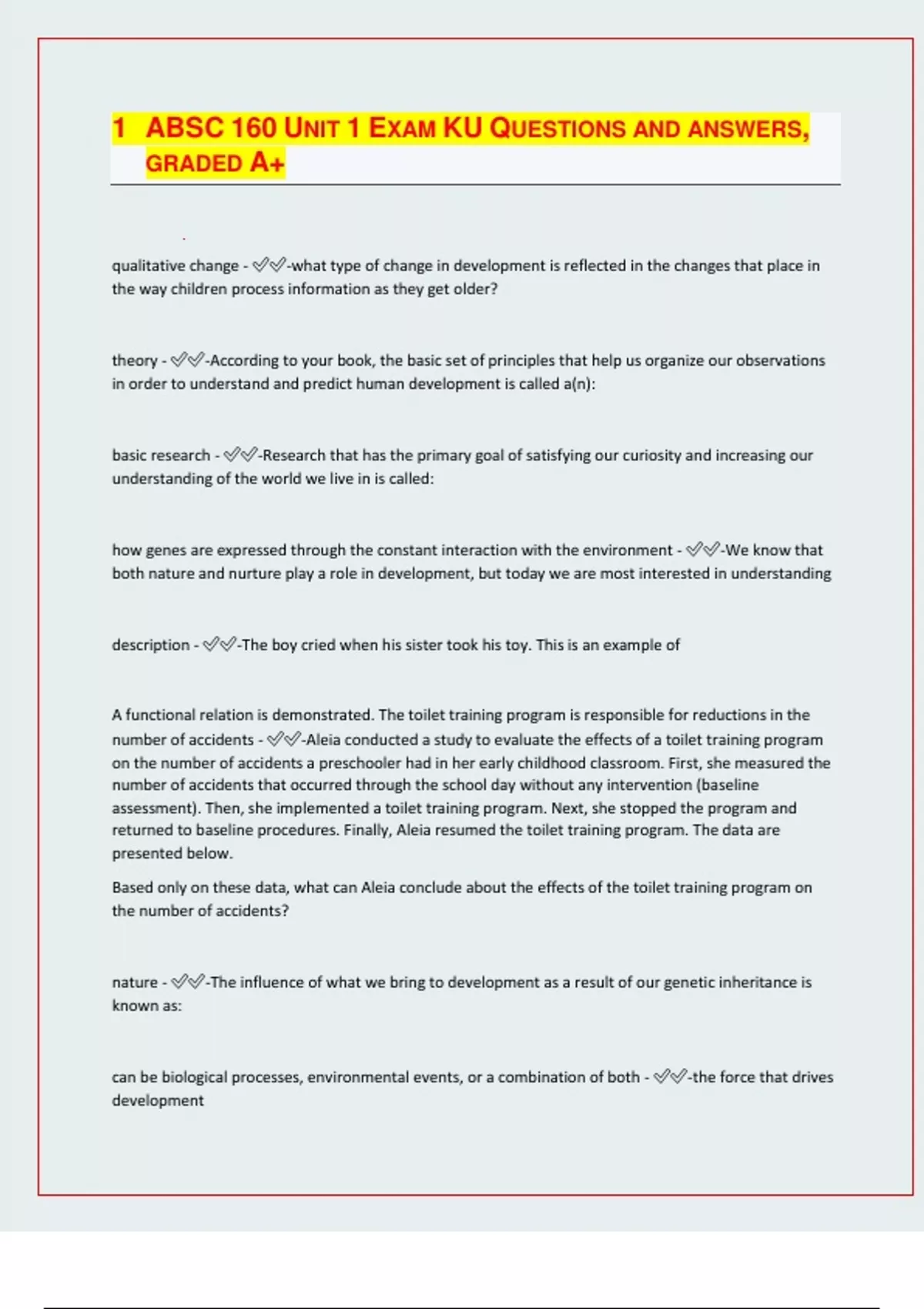 ABSC 160 UNIT 1 EXAM KU QUESTIONS AND ANSWERS, GRADED A+ qualitative change - -what type of change in development is reflected in the changes that place in the way children process information as they get older? theory - -According to your book, the basic set of principles that help us organize our observations in order to understand and predict human development is called a(n): basic research - -Research that has the primary goal of satisfying our curiosity and increasing our understanding of the world we live in is called: how genes are expressed through the constant interaction with the environment - -We know that both nature and nurture play a role in development, but today we are most interested in understanding description - -The boy cried when his sister took his toy. This is an example of A functional relation is demonstrated. The toilet training program is responsible for reductions in the number of accidents - -Aleia conducted a study to evaluate the effects of a toilet training program on the number of accidents a preschooler had in her early childhood classroom. First, she measured the number of accidents that occurred through the school day without any intervention (baseline assessment). Then, she implemented a toilet training program. Next, she stopped the program and returned to baseline procedures. Finally, Aleia resumed the toilet training program. The data are presented below. Based only on these data, what can Aleia conclude about the effects of the toilet training program on the number of accidents? nature - -The influence of what we bring to development as a result of our genetic inheritance is known as: can be biological processes, environmental events, or a combination of both - -the force that drives development observer bias - -A researcher who is conducting observations to test her own hypothesis may pay more attention to behavior that supports that hypothesis, so she must guard against Chromosome - -the structure labeled "A" in the figure is circular logic - -_____________ is when a term is used as the explanation of a phenomenon, while at the same time it is also the object of study. question experts - -As a good consumer of developmental information, students are encouraged to Equifinality - -If we say that there is no one right way to raise a child, we are endorsing the principle of observable behavior - -Psychoanalytic theory focuses on the internal process of the mind, but learning theories focus on Students might not correctly report their grade point average in an attempt to look better. - - Professor Tyrone is interested in studying how the use