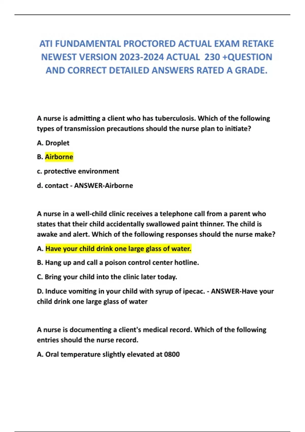 ATI FUNDAMENTAL PROCTORED ACTUAL EXAM RETAKE NEWEST VERSION ACTUAL 230 +QUESTION AND CORRECT DETAILED ANSWERS RATED A GRADE.