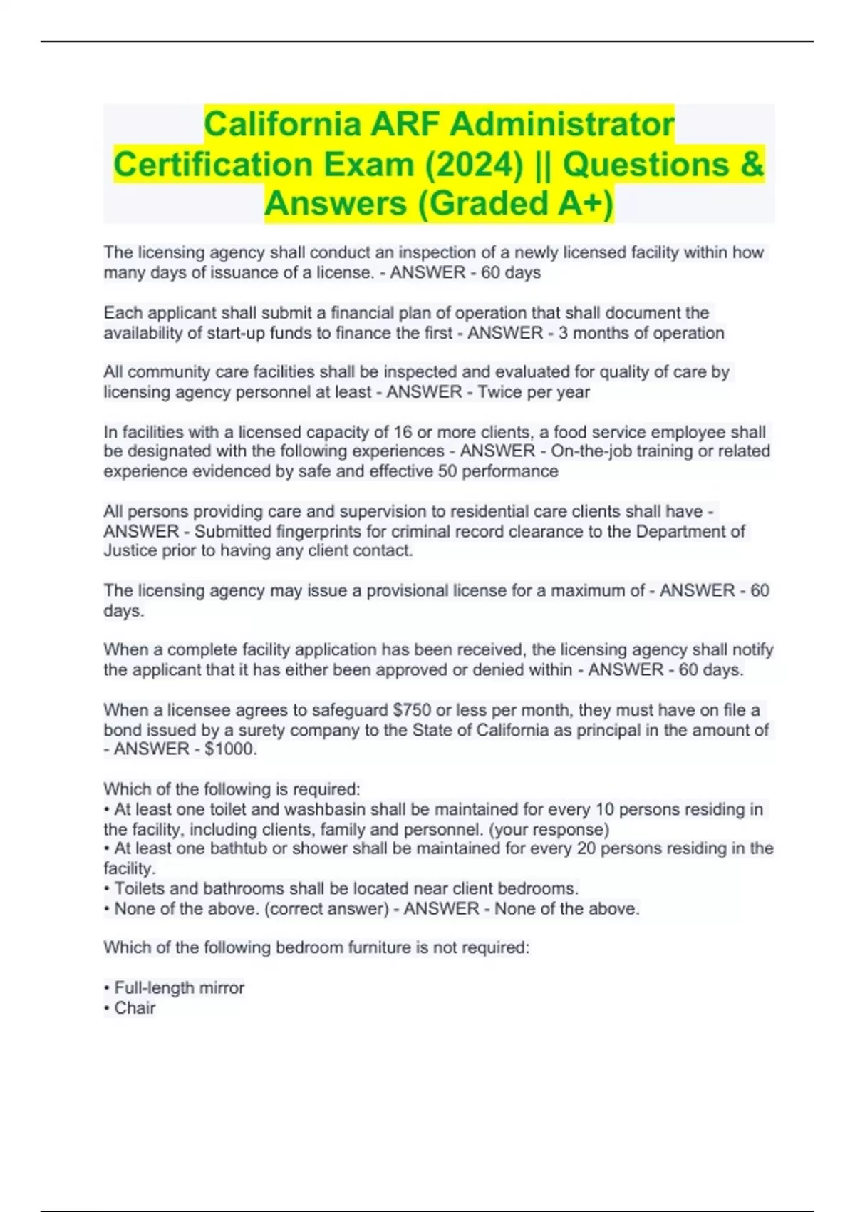 California ARF Administrator Certification Exam (2024) || Questions & Answers (Graded A+) California ARF Administrator Certification Exam (2024) || Questions & Answers (Graded A+) The licensing agency shall conduct an inspection of a newly licensed facility within how many days of issuance of a license. - ANSWER - 60 days Each applicant shall submit a financial plan of operation that shall document the availability of start-up funds to finance the first - ANSWER - 3 months of operation All community care facilities shall be inspected and evaluated for quality of care by licensing agency personnel at least - ANSWER - Twice per year In facilities with a licensed capacity of 16 or more clients, a food service employee shall be designated with the following experiences - ANSWER - On-the-job training or related experience evidenced by safe and effective 50 performance All persons providing care and supervision to residential care clients shall have - ANSWER - Submitted fingerprints for criminal record clearance to the Department of Justice prior to having any client contact. The licensing agency may issue a provisional license for a maximum of - ANSWER - 60 days. When a complete facility application has been received, the licensing agency shall notify the applicant that it has either been approved or denied within - ANSWER - 60 days. When a licensee agrees to safeguard $750 or less per month, they must have on file a bond issued by a surety company to the State of California as principal in the amount of - ANSWER - $1000. Which of the following is required: • At least one toilet and washbasin shall be maintained for every 10 persons residing in the facility, including clients, family and personnel. (your response) • At least one bathtub or shower shall be maintained for every 20 persons residing in the facility. • Toilets and bathrooms shall be located near client bedrooms. • None of the above. (correct answer) - ANSWER - None of the above. Which of the following bedroom furniture is not required: • Full-length mirror • Chair • Night stand • All of the above - ANSWER - Full-length mirror The Department may deny or revoke any administrator certificate upon which of the following grounds: