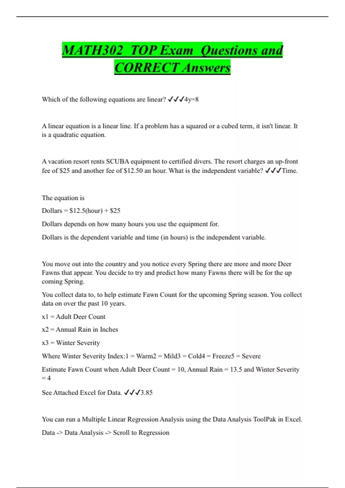 Which of the following equations are linear? 4y=8 A linear equation is a linear line. If a problem has a squared or a cubed term, it isn't linear. It is a quadratic equation. A vacation resort rents SCUBA equipment to certified divers. The resort charges an up-front fee of $25 and another fee of $12.50 an hour. What is the independent variable? Time. The equation is Dollars = $12.5(hour) + $25 Dollars depends on how many hours you use the equipment for. Dollars is the dependent variable and time (in hours) is the independent variable.
