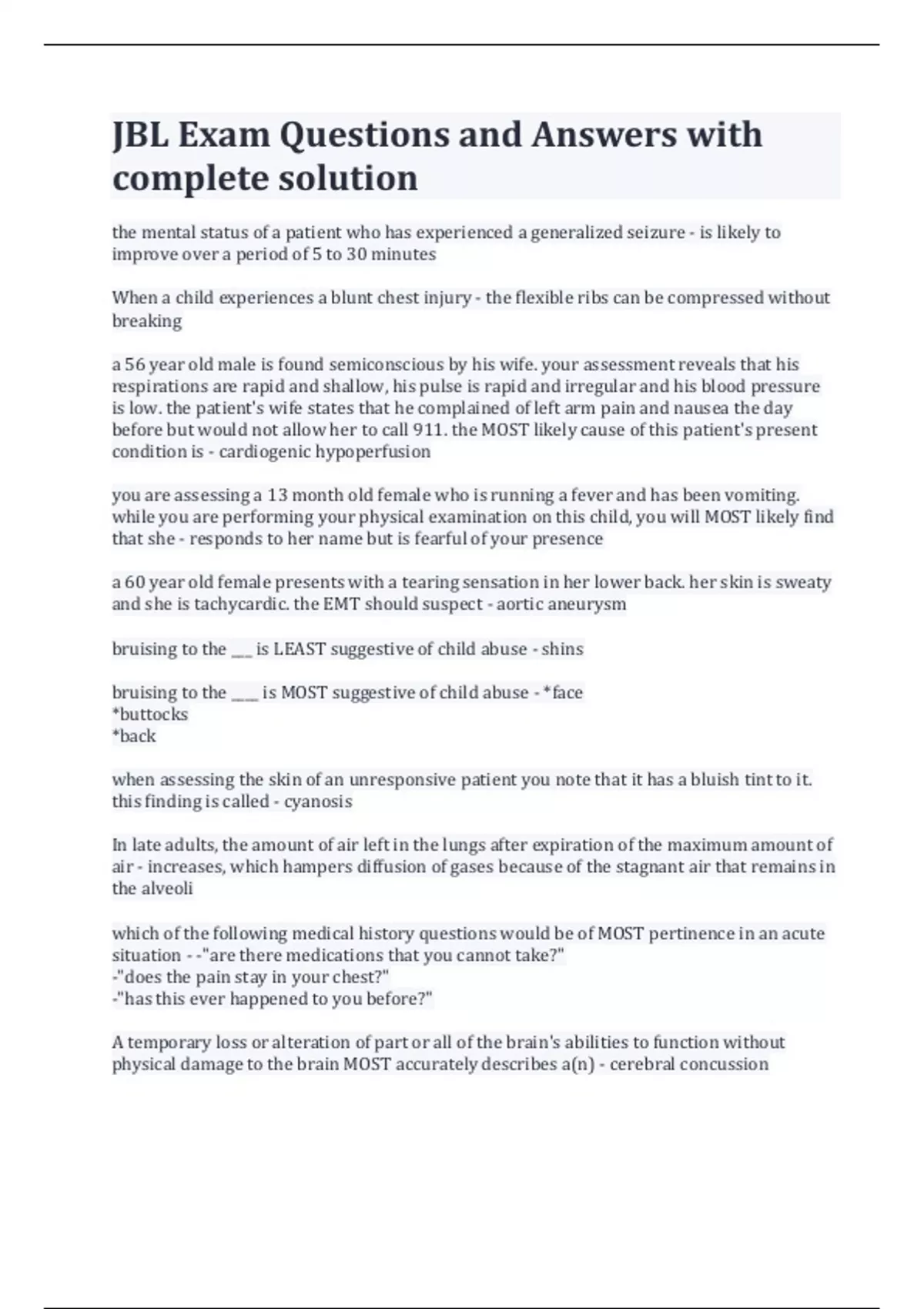 JBL Exam Questions and Answers with complete solution the mental status of a patient who has experienced a generalized seizure - is likely to improve over a period of 5 to 30 minutes When a child experiences a blunt chest injury - the flexible ribs can be compressed without breaking a 56 year old male is found semiconscious by his wife. your assessment reveals that his respirations are rapid and shallow, his pulse is rapid and irregular and his blood pressure is low. the patient's wife states that he complained of left arm pain and nausea the day before but would not allow her to call 911. the MOST likely cause of this patient's present condition is - cardiogenic hypoperfusion you are assessing a 13 month old female who is running a fever and has been vomiting. while you are performing your physical examination on this child, you will MOST likely find that she - responds to her name but is fearful of your presence a 60 year old female presents with a tearing sensation in her lower back. her skin is sweaty and she is tachycardic. the EMT should suspect - aortic aneurysm bruising to the ___ is LEAST suggestive of child abuse - shins bruising to the ____ is MOST suggestive of child abuse - *face *buttocks *back when assessing the skin of an unresponsive patient you note that it has a bluish tint to it. this finding is called - cyanosis In late adults, the amount of air left in the lungs after expiration of the maximum amount of air - increases, which hampers diffusion of gases because of the stagnant air that remains in the alveoli which of the following medical history questions would be of MOST pertinence in an acute situation - -"are there medications that you cannot take?" -"does the pain stay in your chest?" -"has this ever happened to you before?" A temporary loss or alteration of part or all of the brain's abilities to function without physical damage to the brain MOST accurately describes a(n) - cerebral concussion you are dispatched to a residence for a 66 year old male who according to family members has suffered a massive stroke. your primary assessment reveals that the patient is unresponsive, apneic and pulseless you should - initiate CPR and attach an AED as soon as possible Why does the incidence of diabetes mellitus increase with age? - decreased physical activity, increased weight gain and decreased insulin production when performing a rapid exam on a supine patient, what part of the body is typically assessed last? - posterior An infant's normal body temperature is typically higher than - a preschooler's The suture of the anterior fontanelle is typically closed by _____ months of age, and the suture of the posterior fontanelle is typically closed by _____ months of age. - 18, 6 factors that contribute to a decline in the vital capacity of an elderly patient include - *decreased residual volume *increased stiffness of the thoracic cage *loss of respiratory muscle mass Whenever possible, a female sexual assault victim should be - given the option of being treated by a female EMT what patient response would establish the "E" in the SAMPLE history? - "i was moving the lawn when the pain began" chronic renal failure is a condition that - is often caused by hypertension or diabetes. If a patient develops difficulty breathing after your primary assessment, you should immediately - reevaluate his/her airway status After determining that an infant or child has strong central pulses, you should - not rule out compensated shock normal respiratory rates should not exceed ______ breaths/min in toddlers and _____ breaths/min in infants - 40, 60 painful urination is a common symptom of - gonorrhea in both men and women After administering 0.3 mg of epinephrine via auto-injector to a 22-year-old female with an allergic reaction, you note improvement in her breathing and resolution of her hives. However, she is still anxious and tachycardic. You should - monitor her closely but recall that anxiety and tachycardia are side effects of epinephrine