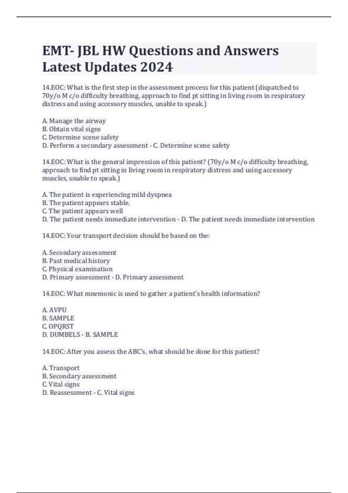 EMT- JBL HW Questions and Answers Latest Updates 2024