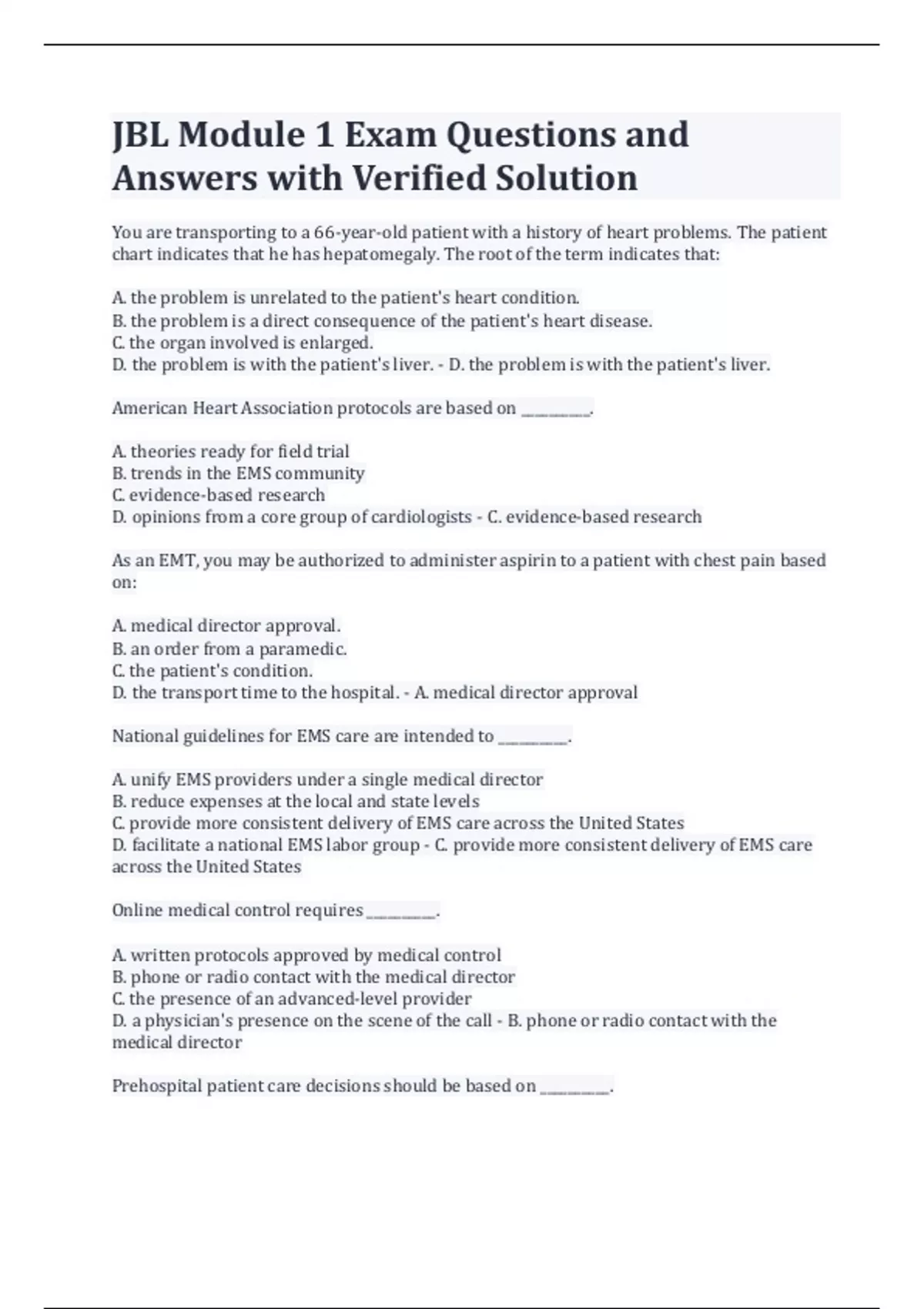 JBL Module 1 Exam Questions and Answers with Verified Solution You are transporting to a 66-year-old patient with a history of heart problems. The patient chart indicates that he has hepatomegaly. The root of the term indicates that: A. the problem is unrelated to the patient's heart condition. B. the problem is a direct consequence of the patient's heart disease. C. the organ involved is enlarged. D. the problem is with the patient's liver. - D. the problem is with the patient's liver. American Heart Association protocols are based on __________. A. theories ready for field trial B. trends in the EMS community C. evidence-based research D. opinions from a core group of cardiologists - C. evidence-based research As an EMT, you may be authorized to administer aspirin to a patient with chest pain based on: A. medical director approval. B. an order from a paramedic. C. the patient's condition. D. the transport time to the hospital. - A. medical director approval National guidelines for EMS care are intended to __________. A. unify EMS providers under a single medical director B. reduce expenses at the local and state levels C. provide more consistent delivery of EMS care across the United States D. facilitate a national EMS labor group - C. provide more consistent delivery of EMS care across the United States Online medical control requires __________. A. written protocols approved by medical control B. phone or radio contact with the medical director C. the presence of an advanced-level provider D. a physician's presence on the scene of the call - B. phone or radio contact with the medical director Prehospital patient care decisions should be based on __________. A. the opinions of physicians B. the experiences of EMTs C. EMS research D. an EMS agency's fiscal resources - C. EMS research The ability to handle multiple tasks based on their priority is called __________. A. time management B. patient advocacy C. integrity D. patient empathy - A. time management The ability to take appropriate action with little direction is known as __________. A. diplomacy B. self-confidence C. self-motivation D. time management - C. self-motivation The ability to understand others and have them understand you is known as __________. A. scene leadership B. teamwork and diplomacy C. communication D. self-confidence - C. communication The determination that prompt surgical care in the hospital is more important than performing time-consuming procedures in the field on a major trauma patient is based MOSTLY on: A. regional trauma guidelines. B. local protocols. C. the lead EMT's decision. D. EMS research. - D. EMS research. The EMT is legally obligated to protect a patient's privacy according to _____________. A. DCAP B. APGAR C. HIPAA D. CQI - C. HIPAA What is an EMT's primary service area? A. The main area in which the EMS agency operates B. The only area the EMT is certified to provide patient care C. The area serviced by the EMT's medical director D. The location where the EMT provides essential care during a 9-1-1 call - A. The main area in which the EMS agency operates What should an EMT do to limit errors in the field? A. Contact medical direction before initiating any treatments. B. Carry an EMT text for reference at all times. C. Follow the agency's written protocols. D. Deviate from established standards when necessary. - C. Follow the agency's written protocols Which of the following courses requires about 150 hours of training? A. AEMT B. Paramedic C. EMT D. EMR - C. EMT Which of the following descriptions MOST accurately portrays emergency medical services (EMS)? A. A team of health care professionals who are responsible for providing emergency care and transportation to the sick and injured B. A team of paramedics and emergency physicians who are responsible for providing emergency care to critically injured patients C. A vast network of advanced life support (ALS) providers who provide definitive emergency care in the prehospital setting D. A system composed exclusively of emergency medical responders (EMRs) and emergency medical technicians (EMTs) who are responsible for providing care to sick and injured patients - A. A team of health care professionals who are responsible for providing emergency care and transportation to the sick and injured Which of the following interventions is used by all levels of EMS providers? A. Automated external defibrillator B. Needle decompression C. Automatic transport ventilators D. Multilumen airways - A. Automated external defibrillator Which of the following is a specific example of the Mobile Integrated Healthcare (MIH) model? A. The paramedic administers a patient's flu vaccination B. Paramedics pick up a patient from an acute care clinic C. EMTs respond to a woman who complains of high fever D. EMTs assess a patient whose lung disease is "acting up" - A. The paramedic administers a patient's flu vaccination Which of the following statements regarding the Americans With Disabilities Act (ADA) of 1990 is correct? A. The minimum number of hours required to successfully complete an EMT course is less for candidates who are disabled. B. According to the ADA, EMT candidates with a documented disability are exempt from taking the NREMT exam. C. The ADA applies only to individuals with a diagnosed and well-documented physical disability. D. The ADA prohibits employers from failing to provide full and equal employment to those who are disabled. - D. The ADA prohibits employers from failing to provide full and equal employment to those who are disabled. Which of the following statements regarding the NREMT is correct? A. EMS training standards are regulated by the NREMT. B. The NREMT is a governmental agency that certifies EMTs. C. The NREMT provides a national standard for EMS testing. D. The NREMT is the exclusive certifying body for EMTs. - C. The NREMT provides a national standard for EMS testing. You are caring for a driver who struck a light pole. She admits 