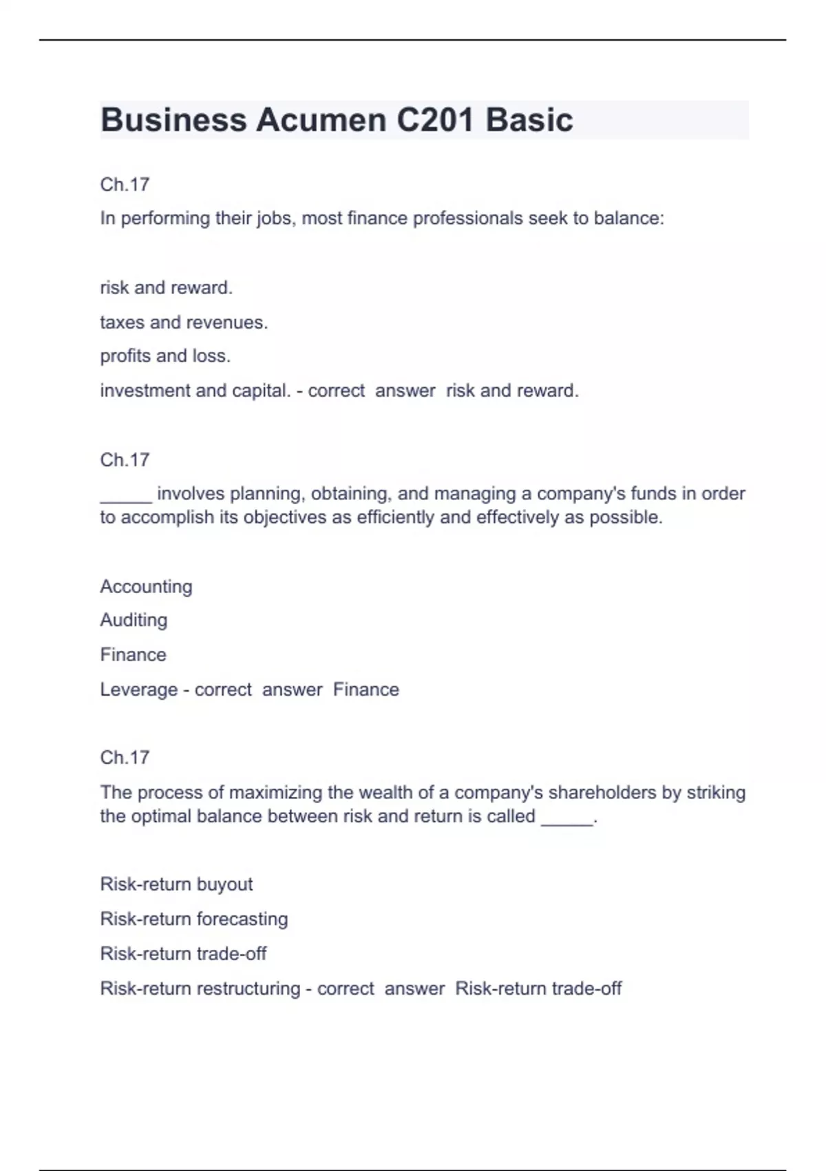 Business Acumen C201 Basic Question and answers already passed 2024 Ch.17 In performing their jobs, most finance professionals seek to balance: risk and reward. taxes and revenues. profits and loss. investment and capital. - correct answer risk and reward. Ch.17 _____ involves planning, obtaining, and managing a company's funds in order to accomplish its objectives as efficiently and effectively as possible. Accounting Auditing Finance Leverage - correct answer Finance Ch.17 The process of maximizing the wealth of a company's shareholders by striking the optimal balance between risk and return is called _____. Risk-return buyout