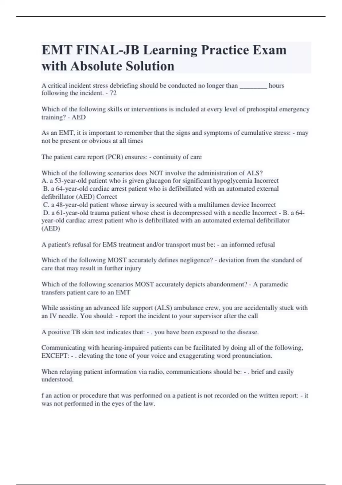 EMT FINAL-JB Learning Practice Exam with Absolute Solution A critical incident stress debriefing should be conducted no longer than ________ hours following the incident. - 72 Which of the following skills or interventions is included at every level of prehospital emergency training? - AED As an EMT, it is important to remember that the signs and symptoms of cumulative stress: - may not be present or obvious at all times The patient care report (PCR) ensures: - continuity of care Which of the following scenarios does NOT involve the administration of ALS? A. a 53-year-old patient who is given glucagon for significant hypoglycemia Incorrect B. a 64-year-old cardiac arrest patient who is defibrillated with an automated external defibrillator (AED) Correct C. a 48-year-old patient whose airway is secured with a multilumen device Incorrect D. a 61-year-old trauma patient whose chest is decompressed with a needle Incorrect - B. a 64-year-old cardiac arrest patient who is defibrillated with an automated external defibrillator (AED) A patient's refusal for EMS treatment and/or transport must be: - an informed refusal Which of the following MOST accurately defines negligence? - deviation from the standard of care that may result in further injury Which of the following scenarios MOST accurately depicts abandonment? - A paramedic transfers patient care to an EMT While assisting an advanced life support (ALS) ambulance crew, you are accidentally stuck with an IV needle. You should: - report the incident to your supervisor after the call A positive TB skin test indicates that: - . you have been exposed to the disease. Communicating with hearing-impaired patients can be facilitated by doing all of the following, EXCEPT: - . elevating the tone of your voice and exaggerating word pronunciation. When relaying patient information via radio, communications should be: - . brief and easily understood. f an action or procedure that was performed on a patient is not recorded on the written report: - it was not performed in the eyes of the law. Maintaining the chain of evidence at the scene of a crime should include: - not cutting through holes in clothing that were caused by weapons When you begin an oral report, you should state the patient's age, sex, and: - chief complaint. The person who is responsible for authorizing EMTs to perform emergency medical care in the field is the: - medical director. Two-way communication that requires the EMT to "push to talk" and "release to listen" describes what mode of communication? - . simplex According to Occupational Safety and Health Administration (OSHA) regulations, an employer must: - offer a workplace environment that reduces the risk for exposure. which of the following errors is an example of a knowledge-based failure? An EMT gives the correct drug to a patient, although his protocols clearly state that he is not authorized to do so. B. Due to an improperly applied cervical collar, a patient's spinal injury is aggravated and he is permanently disabled. C. An EMT administers the wrong drug to a patient because she did not know the pertinent information about the drug. D. A patient is given nitroglycerin by an EMT who did not obtain proper authorization from medical control first. - An EMT administers the wrong drug to a patient because she did not know the pertinent information about the drug. Correct Which of the following statements regarding the Good Samaritan law is correct? It provides the EMT immunity from a lawsuit. B. The law does not protect EMTs who are off duty. C. It will not protect the EMT in cases of gross negligence. D. It guarantees that the EMT will not be held liable if he or she is sued. - it will not protect the EMT in cases of gross negligence. In which of the following situations does the EMT NOT have a legal duty to act? Choose one answer. A. a response to an injured patient while off duty B. a response to a motor vehicle crash while off duty C. Local policy requires you to assist in any emergency. D. a response to the residence of a patient who fell - a response to a motor vehicle crash while off duty The official transfer of patient care does not occur until the EMT: - gives an oral report to the emergency room physician or nurse The spread of HIV and hepatitis in the health care setting can usually be traced to: - careless handling of sharps. When faced with a situation in which a patient is in cardiac arrest, and a valid living will or DNR order cannot be located, you should: - begin resuscitation at once. After delivering your patient to the hospital, you sit down to complete the PCR. When documenting the patient's last blood pressure reading, you inadvertently write 120/60 instead of 130/70. To correct this mistake, you should: - draw a single horizontal line through the error, initial it, and write the correct data next to it. What section of the Health Insurance Portability and Accountability Act (HIPAA) MOST affects EMS personnel? - protecting patient privacy Typical components of an oral patient report include all of the following, EXCEPT: important medical history not previously given. B. the set of baseline vital signs taken at the scene. C. the chief complaint or mechanism of injury. D. the patient's response to treatment you provided. - the set of baseline vital signs taken at the scene. Calming and reassuring an anxious patient can be facilitated by: A. maintaining eye contact with the patient whenever possible. B. using medical terminology to ensure the patient understands. C. positioning yourself at a level that is higher than the patient. D. withholding unpleasant information until arrival at the hospital. - maintaining eye contact with the patient whenever possible. General guidelines for effective radio communications include all of the following, EXCEPT: Choose one answer. A. acknowledging a transmission as soon as possible. B. holding the microphone about 2" to 3" from your mouth. C. using 10 codes to ensure radio 