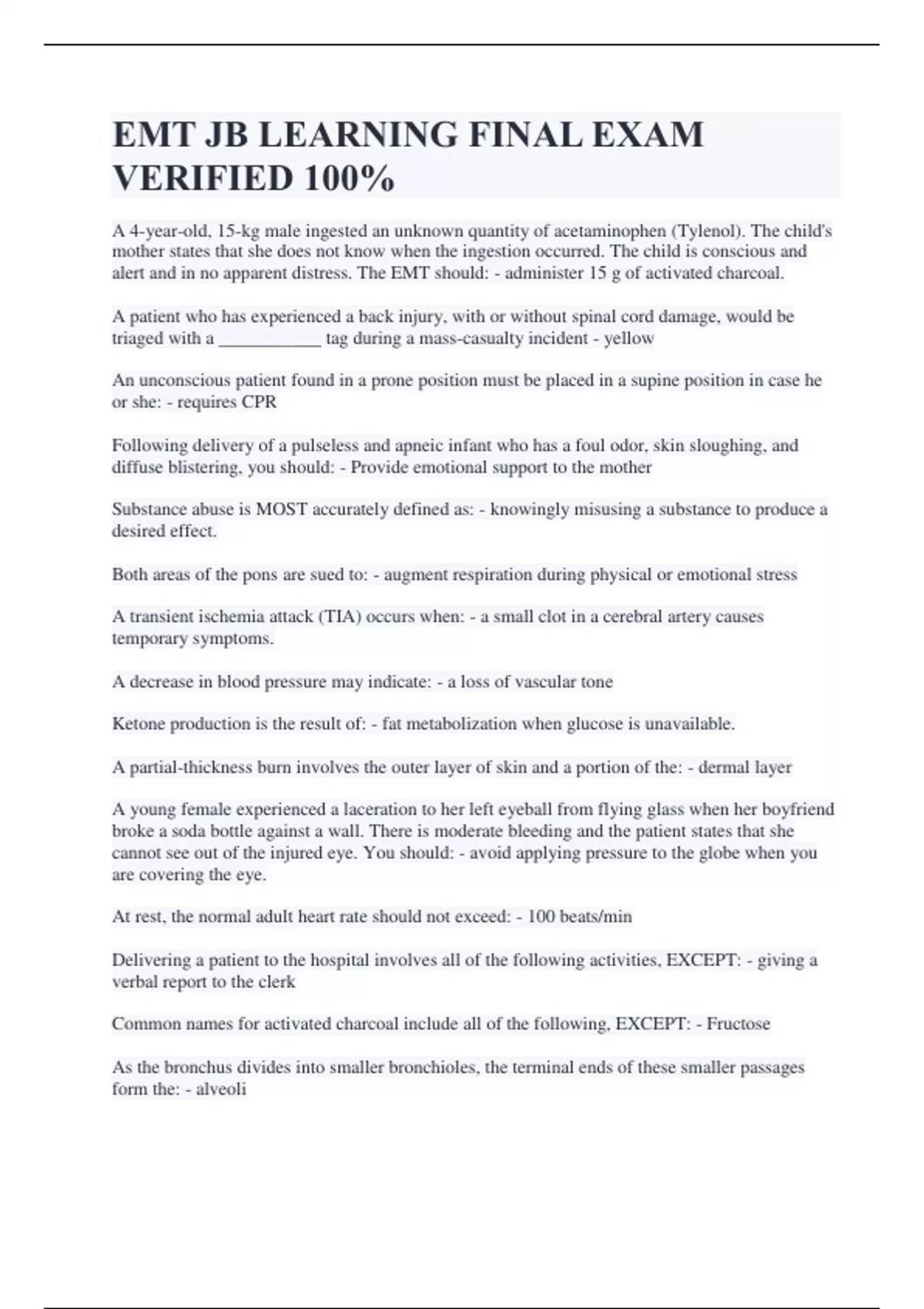 EMT JB LEARNING FINAL EXAM VERIFIED 100% A 4-year-old, 15-kg male ingested an unknown quantity of acetaminophen (Tylenol). The child's mother states that she does not know when the ingestion occurred. The child is conscious and alert and in no apparent distress. The EMT should: - administer 15 g of activated charcoal. A patient who has experienced a back injury, with or without spinal cord damage, would be triaged with a ___________ tag during a mass-casualty incident - yellow An unconscious patient found in a prone position must be placed in a supine position in case he or she: - requires CPR Following delivery of a pulseless and apneic infant who has a foul odor, skin sloughing, and diffuse blistering, you should: - Provide emotional support to the mother Substance abuse is MOST accurately defined as: - knowingly misusing a substance to produce a desired effect. Both areas of the pons are sued to: - augment respiration during physical or emotional stress A transient ischemia attack (TIA) occurs when: - a small clot in a cerebral artery causes temporary symptoms. A decrease in blood pressure may indicate: - a loss of vascular tone Ketone production is the result of: - fat metabolization when glucose is unavailable. A partial-thickness burn involves the outer layer of skin and a portion of the: - dermal layer A young female experienced a laceration to her left eyeball from flying glass when her boyfriend broke a soda bottle against a wall. There is moderate bleeding and the patient states that she cannot see out of the injured eye. You should: - avoid applying pressure to the globe when you are covering the eye. At rest, the normal adult heart rate should not exceed: - 100 beats/min Delivering a patient to the hospital involves all of the following activities, EXCEPT: - giving a verbal report to the clerk Common names for activated charcoal include all of the following, EXCEPT: - Fructose As the bronchus divides into smaller bronchioles, the terminal ends of these smaller passages form the: - alveoli Common signs and symptoms of AMI include all of the following EXCEPT: - pain exacerbated by breathing Breathing occurs as the result of a(n): - increase in carbon dioxide, which decreases the pH of the CSF During the alert and dispatch phase of EMS communications, the dispatcher's responsibilities include all of the following, EXCEPT: - discouraging the caller from providing care until the EMS unit arrives Initial signs and symptoms associated with viral hemorrhagic fevers include: - headache and sore throat Bile is produced by the liver and concentrated and stored in the: - gallbladder The MOST appropriate treatment for a patient with a mild upper airway obstruction includes: - administering oxygen and transporting immediately A 22 year-old female patient is complaining of dyspnea and numbness and tingling in her hands and feet after an argument with her fiancé. Her respirations are 40 breaths/min. You should: - provide reassurance and give oxygen as needed. A 37 year-old male is found unresponsive in his car. His airway is patent and his respirations are rapid and labored. As you and your partner are assessing and treating the patient, a police officer hands you a medication named Alupent, which he found in the backseat of the patient's car. This medication suggests that the patient has a history of: - asthma A positive TB skin test indicates that: - you have been exposed to TB Kussmaul respirations are an indication that the body is: - attempting to eliminate acids from the blood. A patient with a history of schizophrenia called EMS because he was experiencing abdominal pain. When law enforcement arrived, the patient became violent, necessitating the placement of handcuffs. When you assess the patient, he tells you that killing someone will make his abdominal pain go away. His vital signs are stable. How should you manage the situation? - Request a police officer to accompany you in the ambulance. A blood pressure cuff that is too small for a patient's arm will give a: - falsely high systolic and diastolic reading. A 29 year-old male with a head injury opens his eyes when you speak to him, is confused as to the time and date, and is able to move all of his extremities on command. HIs Glasgow Coma Scale (GCS) score is: - 13 A tour bus has overturned, resulting in numerous patients. When you arrive, you are immediately assigned to assist in the triage process. Patient 1 is a middle-aged male with respiratory distress, chest pain, and a closed deformity to his right forearm. Patient 2 is a young female who is conscious and alert, but has bilateral femur fractures and numerous abrasions to her arms and face. Patient 3 is an older woman who complains of abdominal pain and has a history of cardiovascular disease. Patient 4 is unresponsive, is not breathing, has a weak carotid pulse, and has a grossly deformed skull. What triage categories should you assign to these patients? - Patient 1, immediate (red); Patient 2, delayed (yellow); Patient 3, immediate (red); Patient 4, expectant (black) As an EMT, the performance of your duties will be compared to that of: - another EMT If hydroplaning of the ambulance occurs, the driver should: - gradually slow down without jamming on the brakes. All of the following biological agents or diseases can be transmitted from person to person, EXCEPT: - ricin A 23 year-old male experienced severe head trauma after his motorcycle collided with an oncoming truck. He is unconscious, has rapid and shallow breathing, and has copious bloody secretion in his mouth. How should you manage his airway? - Alternate 15 seconds of oral suctioning with 2 minutes of assisted ventilations. A 38 year-old male was electrocuted while attempting to wire a house. Your assessment reveals that he is unresponsive, pulseless and apneic. A coworker has shut off the power to the house. You should: - begin CPT and apply the AED. A patient is sitting in a chair, leaning forward on his outstre
