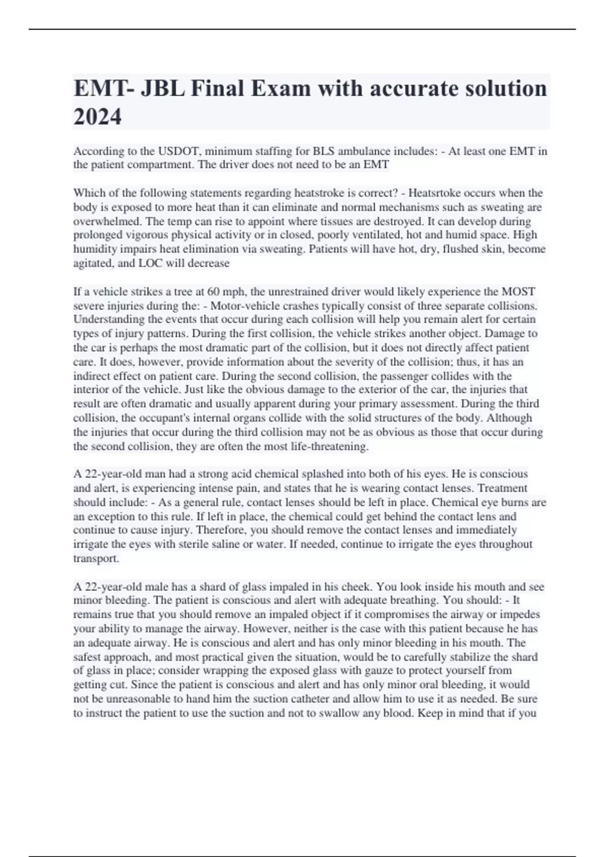 EMT- JBL Final Exam with accurate solution 2024 According to the USDOT, minimum staffing for BLS ambulance includes: - At least one EMT in the patient compartment. The driver does not need to be an EMT Which of the following statements regarding heatstroke is correct? - Heatsrtoke occurs when the body is exposed to more heat than it can eliminate and normal mechanisms such as sweating are overwhelmed. The temp can rise to appoint where tissues are destroyed. It can develop during prolonged vigorous physical activity or in closed, poorly ventilated, hot and humid space. High humidity impairs heat elimination via sweating. Patients will have hot, dry, flushed skin, become agitated, and LOC will decrease If a vehicle strikes a tree at 60 mph, the unrestrained driver would likely experience the MOST severe injuries during the: - Motor-vehicle crashes typically consist of three separate collisions. Understanding the events that occur during each collision will help you remain alert for certain types of injury patterns. During the first collision, the vehicle strikes another object. Damage to the car is perhaps the most dramatic part of the collision, but it does not directly affect patient care. It does, however, provide information about the severity of the collision; thus, it has an indirect effect on patient care. During the second collision, the passenger collides with the interior of the vehicle. Just like the obvious damage to the exterior of the car, the injuries that result are often dramatic and usually apparent during your primary assessment. During the third collision, the occupant's internal organs collide with the solid structures of the body. Although the injuries that occur during the third collision may not be as obvious as those that occur during the second collision, they are often the most life-threatening. A 22-year-old man had a strong acid chemical splashed into both of his eyes. He is conscious and alert, is experiencing intense pain, and states that he is wearing contact lenses. Treatment should include: - As a general rule, contact lenses should be left in place. Chemical eye burns are an exception to this rule. If left in place, the chemical could get behind the contact lens and continue to cause injury. Therefore, you should remove the contact lenses and immediately irrigate the eyes with sterile saline or water. If needed, continue to irrigate the eyes throughout transport. A 22-year-old male has a shard of glass impaled in his cheek. You look inside his mouth and see minor bleeding. The patient is conscious and alert with adequate breathing. You should: - It remains true that you should remove an impaled object if it compromises the airway or impedes your ability to manage the airway. However, neither is the case with this patient because he has an adequate airway. He is conscious and alert and has only minor bleeding in his mouth. The safest approach, and most practical given the situation, would be to carefully stabilize the shard of glass in place; consider wrapping the exposed glass with gauze to protect yourself from getting cut. Since the patient is conscious and alert and has only minor oral bleeding, it would not be unreasonable to hand him the suction catheter and allow him to use it as needed. Be sure to instruct the patient to use the suction and not to swallow any blood. Keep in mind that if you attempt to remove the shard of glass, you risk cutting yourself and causing further injury to the patient. When an error occurs while using the AED, it is MOST often the result of: - AEDs are highly sensitive and specific in recognizing shockable rhythms (eg, V-Fib, pulseless V-Tach); this means that they are highly reliable. It would be extremely rare for the AED to recommend a shock when one is not indicated or fail to recommend a shock when one is indicated. When an error does occur, it is usually the operator's fault. The most common error is not having a charged battery. To avoid this problem, many AEDs are equipped with an alarm that warns the operator if the battery is not fully charged. Some of the older AEDs, however, are not equipped with this feature. Therefore, it is important to check the AED daily, exercise the battery as often as the manufacturer recommends, and always have a spare, fully charged battery on hand. Prior to your arrival, a woman experiencing an asthma attack took two puffs from her prescribed inhaler without relief. After administering supplemental oxygen, you should: - Before assisting a patient with any medication other than oxygen, the EMT must ensure that the medication is prescribed to the patient and then obtain authorization from medical control. In this case, the physician probably will allow you to help the patient take one more puff from her inhaler. Generally, up to three puffs from an inhaler are delivered in the field. It is important for you to ask the patient how many puffs were taken from the inhaler before you arrived. The EMT must correct any airway and/or breathing problems as quickly as possible. After doing so, a secondary assessment can be performed. Upon discovering an open chest wound, you should: - Upon discovering an open chest wound (ie, sucking chest wound), you must take immediate action to prevent air from entering the wound. This is most effectively accomplished by applying an occlusive dressing or similar material to the wound. A porous (non-occlusive) trauma dressing will not prevent air from entering the wound. Tape three sides of the occlusive dressing and closely monitor the patient. If worsened respiratory distress and signs of shock are noted, a tension pneumothorax is probably developing, and you must release pressure from the pleural space by lifting up the unsecured portion of the occlusive dressing. Which of the following signs and symptoms are MOST characteristic of hyperglycemic ketoacidosis? - Hyperglycemic ketoacidosis (diabetic coma) is characterized by a dangerously high blood glucose