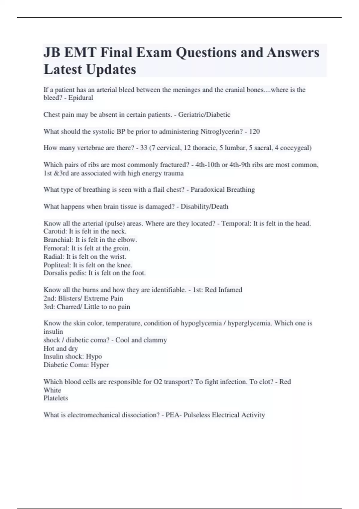 JB EMT Final Exam Questions and Answers Latest Updates If a patient has an arterial bleed between the meninges and the cranial bones....where is the bleed? - Epidural Chest pain may be absent in certain patients. - Geriatric/Diabetic What should the systolic BP be prior to administering Nitroglycerin? - 120 How many vertebrae are there? - 33 (7 cervical, 12 thoracic, 5 lumbar, 5 sacral, 4 coccygeal) Which pairs of ribs are most commonly fractured? - 4th-10th or 4th-9th ribs are most common, 1st &3rd are associated with high energy trauma What type of breathing is seen with a flail chest? - Paradoxical Breathing What happens when brain tissue is damaged? - Disability/Death Know all the arterial (pulse) areas. Where are they located? - Temporal: It is felt in the head. Carotid: It is felt in the neck. Branchial: It is felt in the elbow. Femoral: It is felt at the groin. Radial: It is felt on the wrist. Popliteal: It is felt on the knee. Dorsalis pedis: It is felt on the foot. Know all the burns and how they are identifiable. - 1st: Red Infamed 2nd: Blisters/ Extreme Pain 3rd: Charred/ Little to no pain Know the skin color, temperature, condition of hypoglycemia / hyperglycemia. Which one is insulin shock / diabetic coma? - Cool and clammy Hot and dry Insulin shock: Hypo Diabetic Coma: Hyper Which blood cells are responsible for O2 transport? To fight infection. To clot? - Red White Platelets What is electromechanical dissociation? - PEA- Pulseless Electrical Activity When can you give a patient oral glucose? - If they are able to swallow Below 60 mg/dL Signs of pre-eclampsia vs eclampsia - Headache, Swelling, Visual Disturbances Seizures What is the Good Samaritan law? Standard of care? Article 30? - Protecting regular people from a lawsuit Manner in which the Emt must act or behave Allows EMS to operate under medical cont Definition of COPD, Congestive Heart Failure, CVA, pericardial tamponade - Chronic Obstructive Pulmonary Diasease - Lung Disease Heart Failure Stroke Fluid around the heart Know the Blood flow through the heart. - ior vena cava 2. right atrium 3. tricuspid valve 4. right ventricle 5. pulmonic valve 6. pulmonary artery - where unoxygenated blood is converted to oxygenated blood in the lungs 7. pulmonary vein 8. left atrium 9. mitral/bicuspid valve 10. left ventricle 11.. aortic valve 12. aorta- where oxygenated blood is taken to the body What is an example of a hinge joint? - The elbow and knee