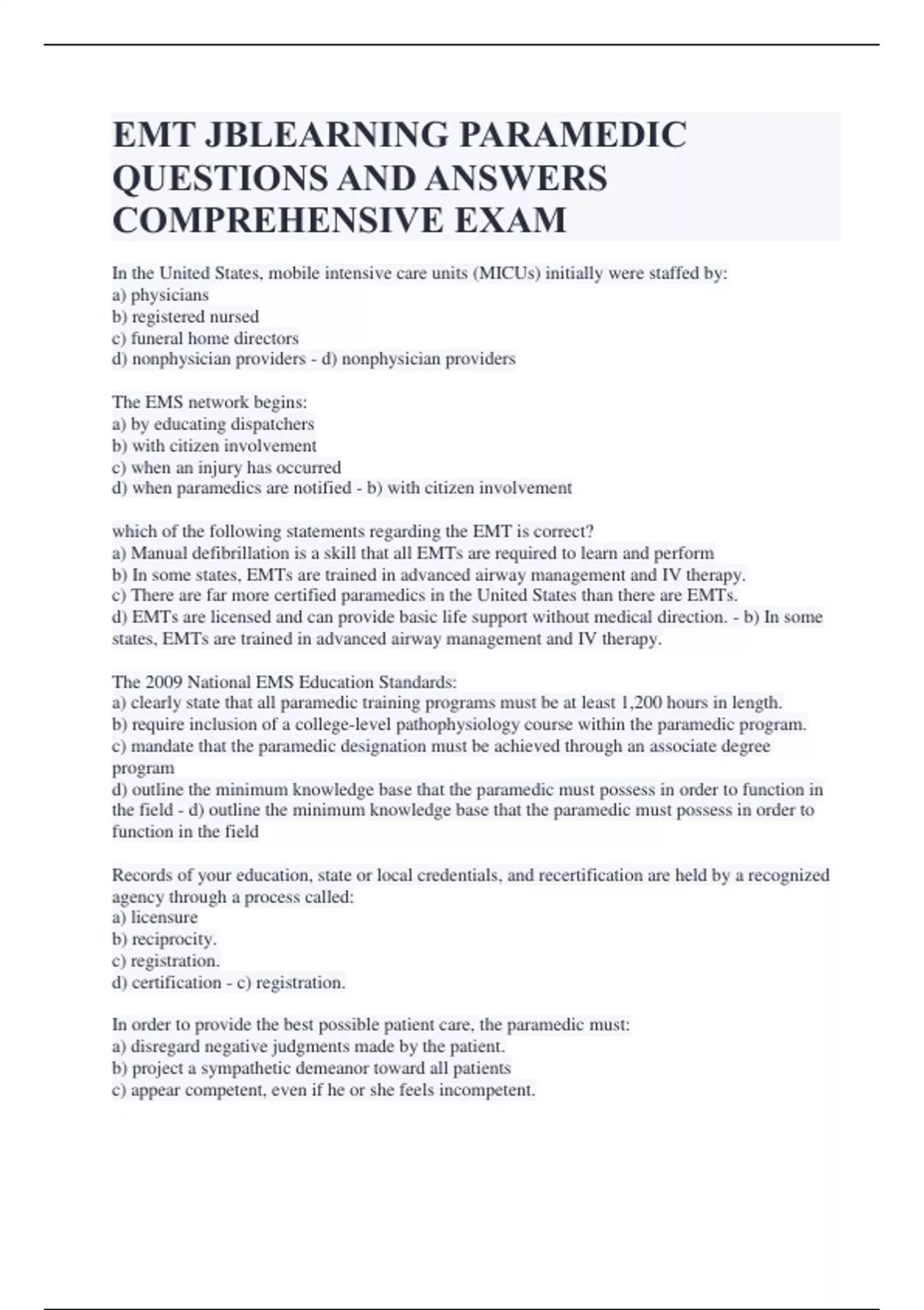 EMT JBLEARNING PARAMEDIC QUESTIONS AND ANSWERS COMPREHENSIVE EXAM In the United States, mobile intensive care units (MICUs) initially were staffed by: a) physicians b) registered nursed c) funeral home directors d) nonphysician providers - d) nonphysician providers The EMS network begins: a) by educating dispatchers b) with citizen involvement c) when an injury has occurred d) when paramedics are notified - b) with citizen involvement which of the following statements regarding the EMT is correct? a) Manual defibrillation is a skill that all EMTs are required to learn and perform b) In some states, EMTs are trained in advanced airway management and IV therapy. c) There are far more certified paramedics in the United States than there are EMTs. d) EMTs are licensed and can provide basic life support without medical direction. - b) In some states, EMTs are trained in advanced airway management and IV therapy. The 2009 National EMS Education Standards: a) clearly state that all paramedic training programs must be at least 1,200 hours in length. b) require inclusion of a college-level pathophysiology course within the paramedic program. c) mandate that the paramedic designation must be achieved through an associate degree program d) outline the minimum knowledge base that the paramedic must possess in order to function in the field - d) outline the minimum knowledge base that the paramedic must possess in order to function in the field Records of your education, state or local credentials, and recertification are held by a recognized agency through a process called: a) licensure b) reciprocity. c) registration. d) certification - c) registration. In order to provide the best possible patient care, the paramedic must: a) disregard negative judgments made by the patient. b) project a sympathetic demeanor toward all patients c) appear competent, even if he or she feels incompetent. d) establish and maintain credibility and instill confidence - d) establish and maintain credibility and instill confidence After ensuring your own personal safety, your next priority should be to: a) ensure the safety of your patient. b) proceed quickly with patient care. c) make sure that your partner is safe. d) provide safety for any bystanders - c) make sure that your partner is safe. The MAIN benefit to online medical control is that it: a) affords the paramedic better protection against a lawsuit b) provides an immediate and specific patient care resource. c) allows the physician and paramedic to develop a rapport d) facilitates a faster transport to the emergency department - b) provides an immediate and specific patient care resource. A CQI program should primarily focus on: a) modifying protocols as needed b) improving patient care delivery. c) identifying incompetent medics d) reviewing all patient care reports - b) improving patient care delivery EMS protocol development, training methodologies, and equipment use decisions are based mainly on? a) evidence b) experience c) personal opinion d) public preference - a) evidence The judicial branch at the state level is responsible for: a) establishing and defining the law. b) reporting to the governor in the state capitol c) resolving disputes based on interpretation of law d) carrying out and administering the laws - c) resolving disputes based on interpretation of law The aspect of the HIPAA is MOST pertinent to the paramedic? a) recovering funds from insurance companies b) documenting a thorough patient assessment c) ensuring that the patient's privacy is protected d) disclosing patient information to the media - c) ensuring that the patient's privacy is protected it is important to become in a national or state EMS organization, such as the National Association of EMTs (NAEMT) or the National Association of State EMS Officials (NASEMO), because: a) these organization offer continuing education for all EMS providers b) such organization have an impact on the future direction of EMS c) such organizations promote unique EMS training standards for each state d) membership in a professional organization is a tax-deductible expense - b) such organization have an impact on the future direction of EMS Mobile army surgical hospitals (M*A*S*H) saved thousands of soldiers' lives during the Korean war by: a) deploying combat medics to retrieve wounded soldiers b) using helicopters to airlift casualties to the United States c) bringing the hospital facilities closer to the battlefield d) performing surgery within 30 minutes of the injury - c) bringing the hospital facilities closer to the battlefield a paramedic is considered a health care professional, and as such should: a) meet societal expectations whether he or she is on or off duty b) demand respect from others who are in the EMS profession c) maintain higher standards than other health care professionals d) obtain more than the required amount of continuing education - a) meet societal expectations whether he or she is on or off duty. A major recommendation made by the 2009 EMS Education Standards for paramedic training was the: a) addition of 750 hours of clinical and field training above and beyond classroom education. b) removal of endotracheal intubation from the minimum core content of the training program c) prerequisite that all paramedic students possess a minimum of an associate's degree d) inclusion of a college-level anatomy and physiology course as part of the training program. - d) inclusion of a college-level anatomy and physiology course as part of the training program. if an emergency medical responder is appropriately trained and competent, he or she should be able to: a) detect signs of patient deterioration, obtain baseline vital signs, and give IV fluids to maintain adequate perfusion. b) perform lifesaving interventions and transport the patient after paramedics have performed a detailed physical exam c) recognize the seriousness of a patient's condition, provide basic life support care, and