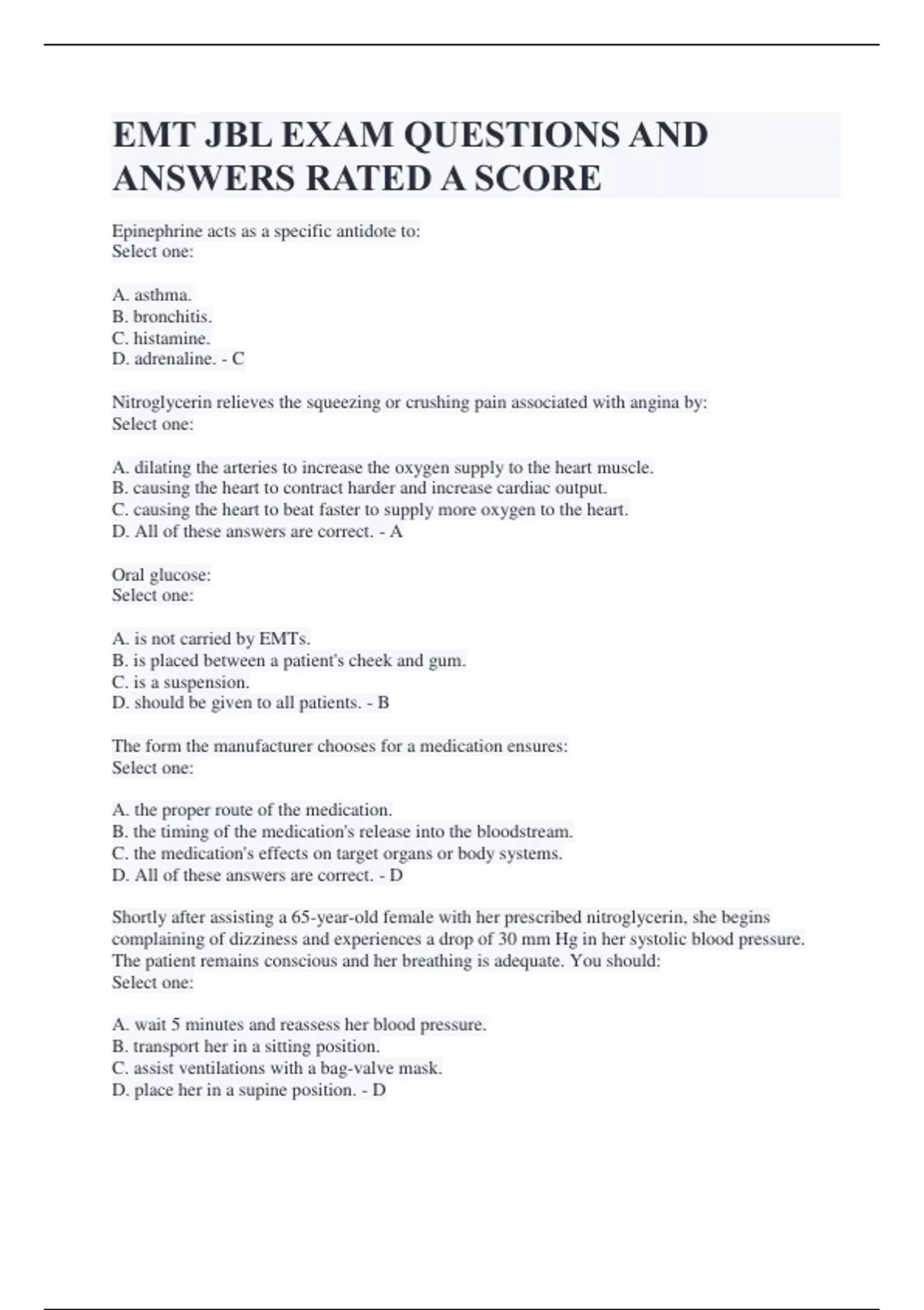 EMT JBL EXAM QUESTIONS AND ANSWERS RATED A SCORE Epinephrine acts as a specific antidote to: Select one: A. asthma. B. bronchitis. C. histamine. D. adrenaline. - C Nitroglycerin relieves the squeezing or crushing pain associated with angina by: Select one: A. dilating the arteries to increase the oxygen supply to the heart muscle. B. causing the heart to contract harder and increase cardiac output. C. causing the heart to beat faster to supply more oxygen to the heart. D. All of these answers are correct. - A Oral glucose: Select one: A. is not carried by EMTs. B. is placed between a patient's cheek and gum. C. is a suspension. D. should be given to all patients. - B The form the manufacturer chooses for a medication ensures: Select one: A. the proper route of the medication. B. the timing of the medication's release into the bloodstream. C. the medication's effects on target organs or body systems. D. All of these answers are correct. - D Shortly after assisting a 65-year-old female with her prescribed nitroglycerin, she begins complaining of dizziness and experiences a drop of 30 mm Hg in her systolic blood pressure. The patient remains conscious and her breathing is adequate. You should: Select one: A. wait 5 minutes and reassess her blood pressure. B. transport her in a sitting position. C. assist ventilations with a bag-valve mask. D. place her in a supine position. - D EMTs respond to a known heroin abuser who is unresponsive. If they give naloxone (Narcan) to this patient, the EMTs should recall that: Select one: A. naloxone should not be given if the patient's breathing is slow. B. naloxone administration could cause seizures in this patient. C. the effects of naloxone last longer than most opioid drugs. D. naloxone should be administered in increments of 2 mg. - B How is nitroglycerin usually given by the EMT? Select one: A. Sublingually B. Inhaled C. Injected D. Orally - A Nitroglycerin, when given to patients with cardiac-related chest pain: Select one: A. increases blood return to the right atrium. B. increases myocardial contraction force. C. constricts the veins throughout the body. D. relaxes the walls of the coronary arteries. - D What medication form does oral glucose come in? Select one: A. Gel B. Liquid C. Fine powder D. Suspension - A Which of the following is NOT a characteristic of epinephrine? Select one: A. Secreted naturally by the adrenal glands B. Constricts the blood vessels C. Dilates passages in the lungs D. Decreases heart rate and blood pressure - D Which of the following medication routes delivers a drug through the skin over an extended period of time, such as a nitroglycerin or nicotine patch? Select one: A. Transcutaneous B. Sublingual C. Intraosseous D. Subcutaneous - A Which of the following statements regarding the epinephrine auto-injector is correct? Select one: A. EMTs do not need physician authorization to use the auto-injector. B. The auto-injector delivers epinephrine via the subcutaneous route. C. The adult auto-injector delivers 0.5 to 1 mg of epinephrine. D. The epinephrine auto-injector delivers a preset amount of the drug. - D ________ is a bacterium that causes infections and is resistant to most antibiotics. Select one: A. Hepatitis C B. Tuberculosis C. Meningitis D. MRSA - D The _____ is your awareness and concern for potentially serious underlying and unseen injuries or illnesses. Select one: A. index of suspicion B. clinical impression C. nature of illness D. general impression - A The incubation period for hepatitis B is typically: Select one: A. 1 to 10 weeks. B. 5 to 10 weeks. C. 4 to 12 weeks. D. 1 to 2 weeks. - C You should assess pulse, motor, and sensation in all of the extremities and check for pupillary reactions if you suspect a(n) _____ problem. Select one: A. cardiovascular B. psychological C. neurologic D. endocrine - C Assessment of a patient's blood pressure with an automatic BP cuff reveals that it is 204/120 mm Hg. The patient is conscious and alert and denies any symptoms. The EMT should: Select one: A. obtain a manual blood pressure. B. prepare for immediate transport. C. conclude that she has hypertension. D. reassess her blood pressure in 5 minutes. - A End-tidal carbon dioxide (ETCO2) monitoring is clearly indicated for patients who present with: Select one: A. headache. B. high blood pressure. C. respiratory distress. D. abdominal pain. - C In addition to looking for severe bleeding, assessment of circulation in the conscious patient should involve: Select one: A. taking a blood pressure and determining if the patient is alert and oriented or confused. B. palpating the carotid pulse to determine the approximate rate and checking capillary refill time. C. checking the radial pulse and noting the color, temperature, and condition of the skin. D. applying a pulse oximeter probe to the finger to determine if peripheral perfusion is adequate. - C In contrast to viral hepatitis, toxin-induced hepatitis: Select one: A. typically does not cause yellow skin. B. is not a communicable disease. C. can be prevented with a vaccination. D. is a far more transmittable disease. - B Patients with tuberculosis pose the greatest risk for transmitting the disease when they: Select one: A. vomit. B. are bleeding. C. have a fever. D. cough. - D Reassessment of a patient with a medical complaint should begin by:
