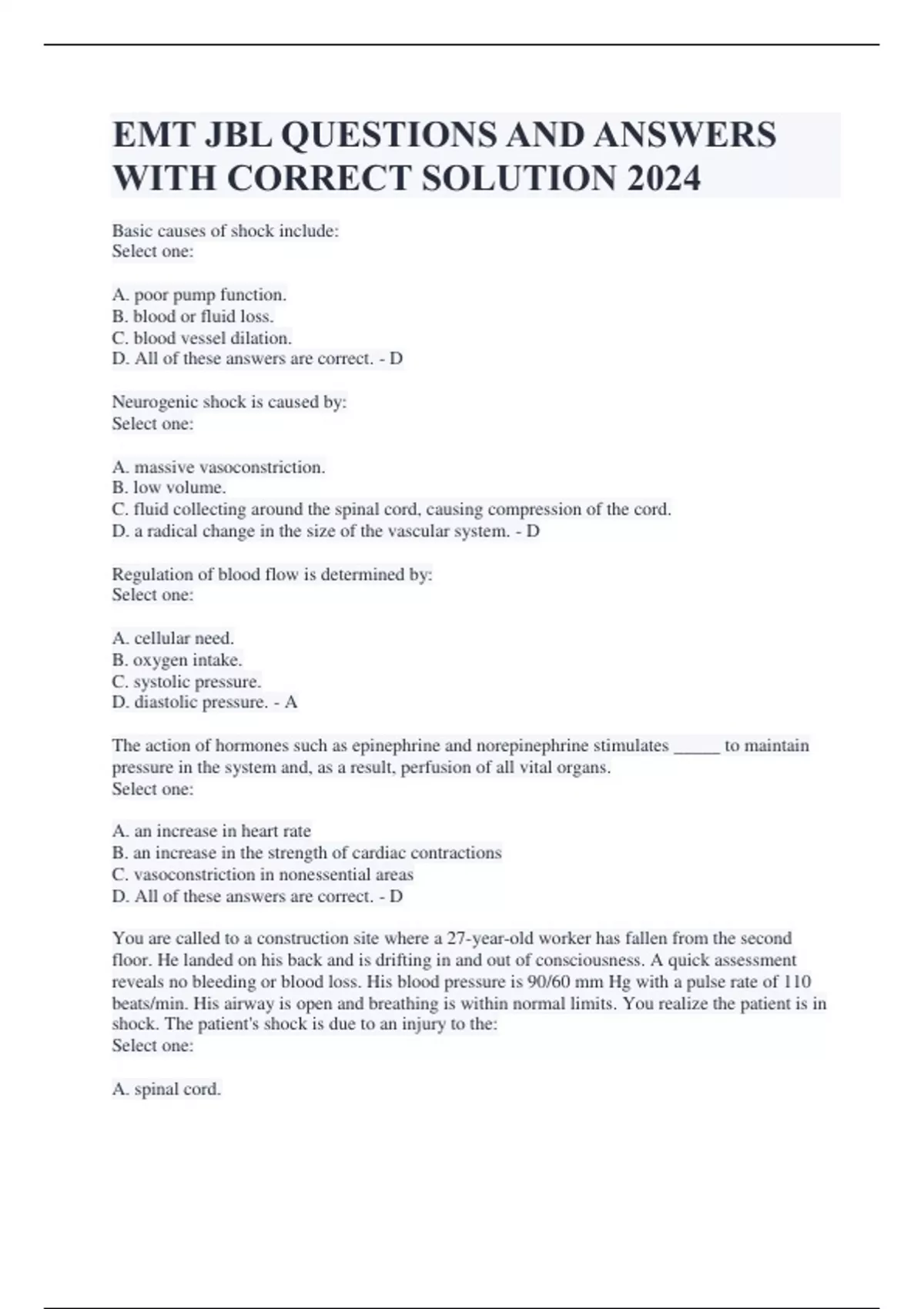EMT JBL QUESTIONS AND ANSWERS WITH CORRECT SOLUTION 2024 Basic causes of shock include: Select one: A. poor pump function. B. blood or fluid loss. C. blood vessel dilation. D. All of these answers are correct. - D Neurogenic shock is caused by: Select one: A. massive vasoconstriction. B. low volume. C. fluid collecting around the spinal cord, causing compression of the cord. D. a radical change in the size of the vascular system. - D Regulation of blood flow is determined by: Select one: A. cellular need. B. oxygen intake. C. systolic pressure. D. diastolic pressure. - A The action of hormones such as epinephrine and norepinephrine stimulates _____ to maintain pressure in the system and, as a result, perfusion of all vital organs. Select one: A. an increase in heart rate B. an increase in the strength of cardiac contractions C. vasoconstriction in nonessential areas D. All of these answers are correct. - D You are called to a construction site where a 27-year-old worker has fallen from the second floor. He landed on his back and is drifting in and out of consciousness. A quick assessment reveals no bleeding or blood loss. His blood pressure is 90/60 mm Hg with a pulse rate of 110 beats/min. His airway is open and breathing is within normal limits. You realize the patient is in shock. The patient's shock is due to an injury to the: Select one: A. spinal cord. B. peripheral nerves. C. skull. D. cervical vertebrae. - A A 19-year-old male was stung multiple times by fire ants. He is experiencing obvious signs and symptoms of anaphylactic shock. You administer high-flow oxygen and give him epinephrine via intramuscular injection. Upon reassessment, you determine that his condition has not improved. You should: Select one: A. consider that he may actually be experiencing an acute asthma attack. B. request a paramedic unit that is stationed approximately 15 miles away. C. repeat the epinephrine injection after consulting with medical control. D. transport him immediately and provide supportive care while en route. - C A 56-year-old male is found semiconscious by his wife. Your assessment reveals that his respirations are rapid and shallow, his pulse is rapid and irregular, and his blood pressure is low. The patient's wife states that he complained of left arm pain and nausea the day before, but would not allow her to call 9-1-1. The MOST likely cause of this patient's present condition is: Select one: A. severe septic hypoperfusion. B. a ruptured aortic aneurysm. C. acute myocardial infarction. D. cardiogenic hypoperfusion. - D Clinical signs of compensated shock include all of the following, EXCEPT: Select one: A. cool and clammy skin. B. absent peripheral pulses. C. restlessness or anxiety. D. rapid, shallow breathing. - B Neurogenic shock occurs when: Select one: A. failure of the nervous system causes widespread vasodilation. B. there is too much blood to fill a smaller vascular container. C. the spinal cord is severed and causes massive hemorrhaging. D. massive vasoconstriction occurs distal to a spinal cord injury. - A Which of the following MOST accurately describes septic shock? Select one: A. Viral infection of the blood vessels, vascular damage, and vasoconstriction B. Bacterial infection of the nervous system with widespread vasodilation C. Widespread vasoconstriction and plasma loss due to a severe viral infection D. Bacterial damage to the vessel wall, leaking blood vessels, and vasodilation - D Which of the following statements regarding anaphylactic shock is correct? Select one: A. Subsequent exposure after sensitization often produces a more severe reaction. B. Sensitized people will experience less severe reactions upon subsequent exposure. C. Anaphylactic shock occurs immediately after a person is sensitized to an allergen. D. Anaphylactic shock is caused by immune system failure due to a toxic exposure. - A You are dispatched to a residence for a 40-year-old female who fainted. Upon your arrival, the patient is conscious and alert, and states that she is fine. Her husband tells you that she fainted after receiving news that her sister was killed in a car crash. You offer oxygen to the patient, but she refuses to accept it. At this point, your primary concern should be to: Select one: A. obtain baseline vital signs and a medical history. B. provide emotional support regarding her sister. C. determine if she was injured when she fainted. D. advise her that she needs to go to the hospital. - C You are transporting a 33-year-old male who was involved in a major motor vehicle crash. You have addressed all immediate and potentially life-threatening conditions and have stabilized his condition with the appropriate treatment. With an estimated time of arrival at the hospital of 20 minutes, you should: Select one: A. reassess his condition in 5 minutes. B. take his vital signs in 15 minutes. C. arrange for an ALS rendezvous. D. repeat your secondary assessment. - A You respond to a residence for a patient with a severe leg injury following an accident with a chainsaw. When you arrive, you find the patient, a 44-year-old male, lying supine in the backyard. He has a partial amputation of his right lower leg that is actively bleeding. The patient is conscious and breathing adequately; however, he is restless and his skin is diaphoretic. You should: Select one: A. assess the rate and quality of his pulse. B. apply direct pressure to the wound. C. administer 100% supplemental oxygen. D. immediately evaluate his airway. - B Your assessment of an unresponsive patient reveals that her breathing is inadequate. Your MOST immediate action should be to: Select one: A. move her to the ambulance stretcher. B. ventilate her with a bag-valve mask. C. check her airway for obstructions. D. administer high-flow oxygen. - C A fall from more than _____ times the patient's height is considered to be significant. Select one: A. five B. four C. three D. two - C A patient complaining of chest tightness, cough