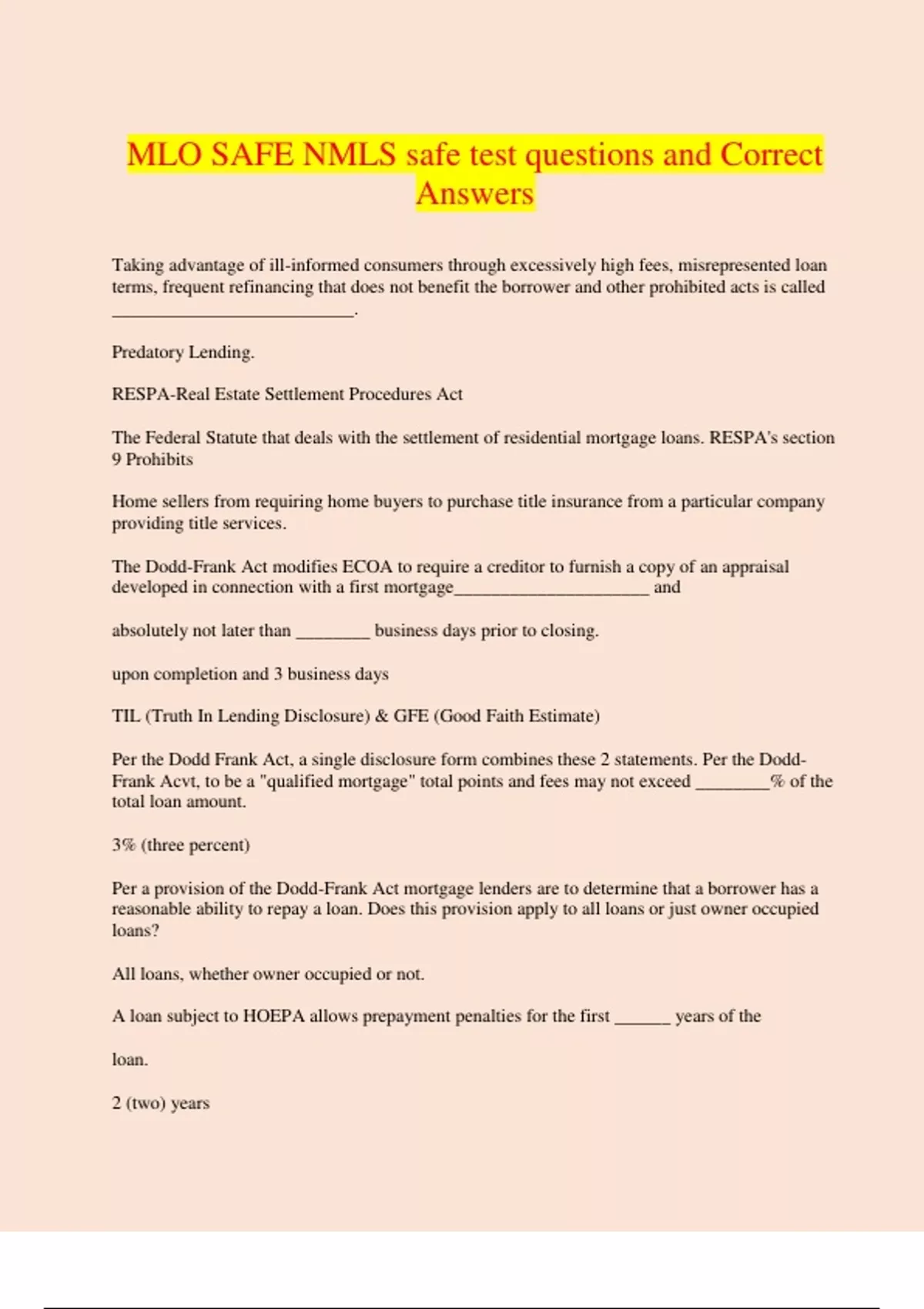 MLO SAFE NMLS safe test questions and Correct Answers