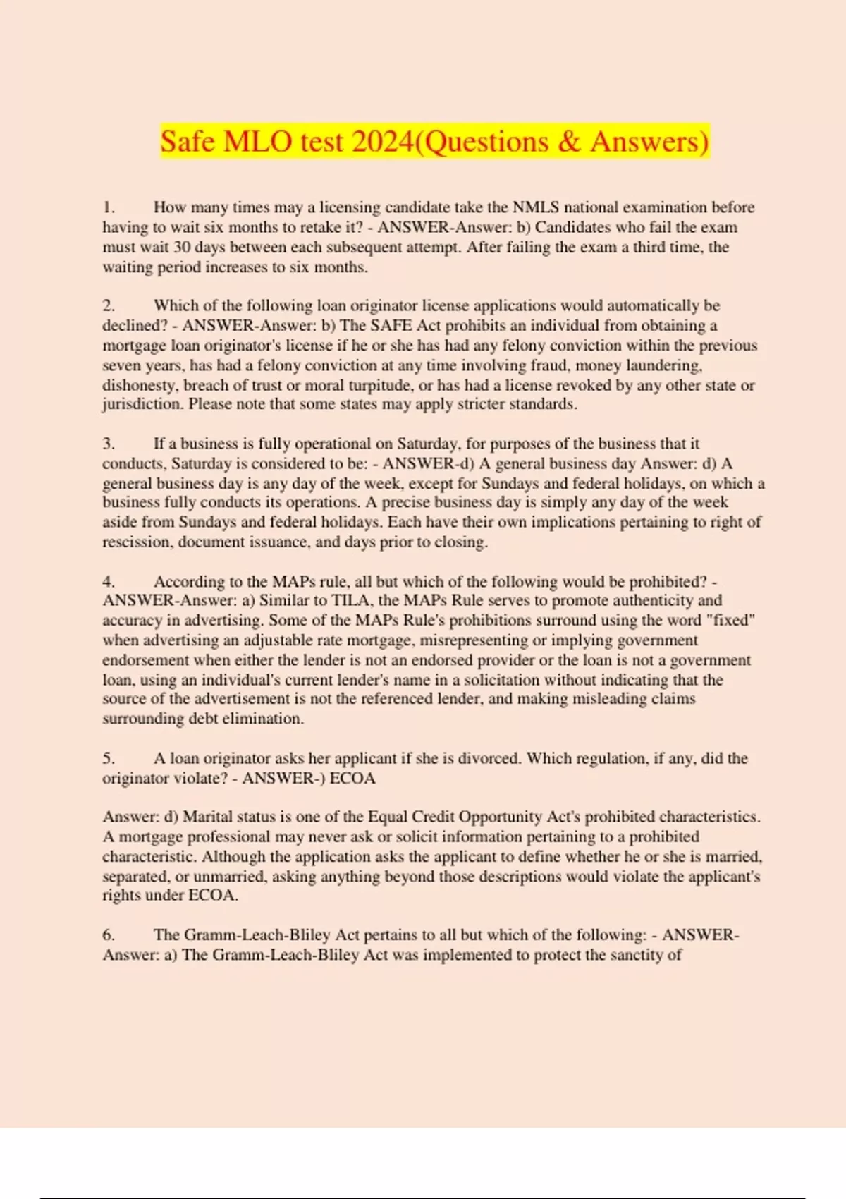1. How many times may a licensing candidate take the NMLS national examination before having to wait six months to retake it? - ANSWER-Answer: b) Candidates who fail the exam must wait 30 days between each subsequent attempt. After failing the exam a third time, the waiting period increases to six months. 2. Which of the following loan originator license applications would automatically be declined? - ANSWER-Answer: b) The SAFE Act prohibits an individual from obtaining a mortgage loan originator's license if he or she has had any felony conviction within the previous seven years, has had a felony conviction at any time involving fraud, money laundering, dishonesty, breach of trust or moral turpitude, or has had a license revoked by any other state or jurisdiction. Please note that some states may apply stricter standards. 3. If a business is fully operational on Saturday, for purposes of the business that it conducts, Saturday is considered to be: - ANSWER-d) A general business day Answer: d) A general business day is any day of the week, except for Sundays and federal holidays, on which a business fully conducts its operations. A precise business day is simply any day of the week aside from Sundays and federal holidays. Each have their own implications pertaining to right of rescission, document issuance, and days prior to closing.