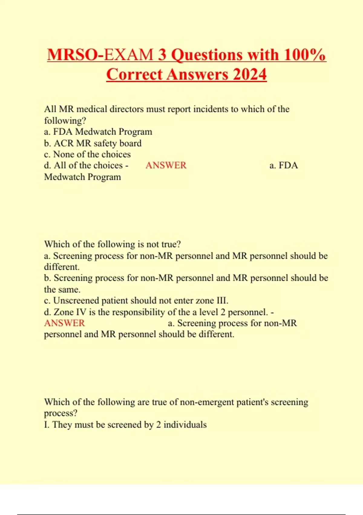 MRSO-EXAM 3 Questions with 100% Correct Answers 2024 All MR medical directors must report incidents to which of the following? a. FDA Medwatch Program b. ACR MR safety board c. None of the choices d. All of the choices - ANSWER a. FDA Medwatch Program Which of the following is not true? a. Screening process for non-MR personnel and MR personnel should be different. b. Screening process for non-MR personnel and MR personnel should be the same. c. Unscreened patient should not enter zone III. d. Zone IV is the responsibility of the a level 2 personnel. - ANSWER a. Screening process for non-MR personnel and MR personnel should be different. Which of the following are true of non-emergent patient's screening process? I. They must be screened by 2 individuals II. A verbal or interactive means of screening should be performed. III. Any history of potental ferromagnetic foreign objects must be investigated before entering zone III IV. Must remove metallic objects - ANSWER I,II,III,IV Which zone is the quench pipe located in when it vents outside the facility? a. Zone I b. Zone II c. Zone III d. Zone IV - ANSWER c. Zone III