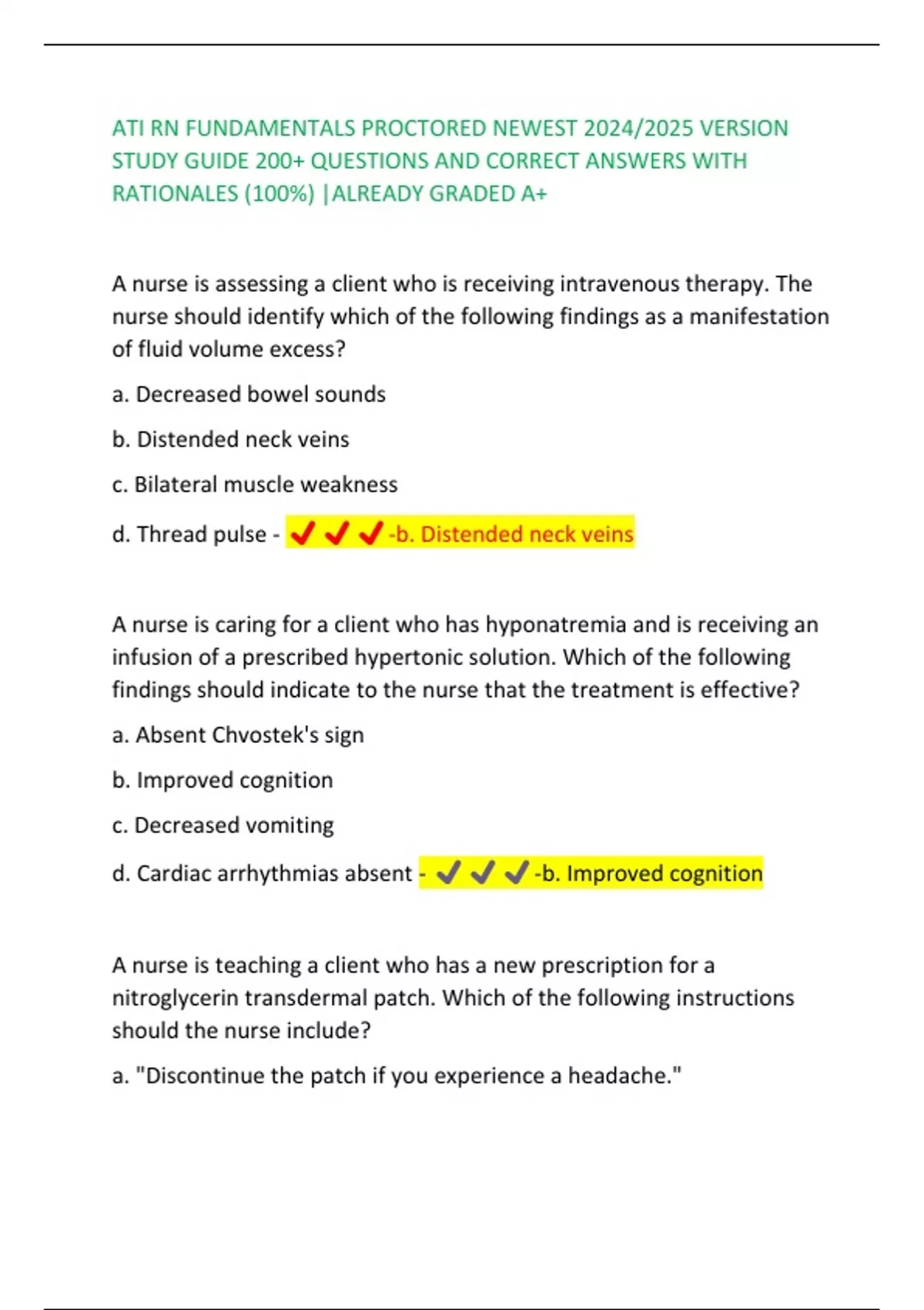 ATI RN FUNDAMENTALS PROCTORED NEWEST 2024/2025 VERSION STUDY GUIDE 200+ QUESTIONS AND CORRECT ANSWERS WITH RATIONALES (100%) |ALREADY GRADED A+ A nurse is assessing a client who is receiving intravenous therapy. The nurse should identify which of the following findings as a manifestation of fluid volume excess? a. Decreased bowel sounds b. Distended neck veins c. Bilateral muscle weakness d. Thread pulse - ️️️-b. Distended neck veins A nurse is caring for a client who has hyponatremia and is receiving an infusion of a prescribed hypertonic solution. Which of the following findings should indicate to the nurse that the treatment is effective? a. Absent Chvostek's sign b. Improved cognition c. Decreased vomiting d. Cardiac arrhythmias absent - -b. Improved cognition A nurse is teaching a client who has a new prescription for a nitroglycerin transdermal patch. Which of the following instructions should the nurse include? a. "Discontinue the patch if you experience a headache." b. "Apply a new patch if you have chest pain." c. "Cover the patch with dry gauze when taking a shower." d. "Remove the patch prior to going to bed." - -d. "Remove the patch prior to going to bed." A nurse is reviewing he laboratory results of a client who has a prescription for sodium polystyrene sulfonate (Kayexalate) every 6 hr. which of the following should the nurse report to the provider? a. Creatinine 0.72 mg/dL b. Sodium 138 mEq/L c. Magnesium 2 mEq/L d. Potassium 5.2 mEq/L - -d. Potassium 5.2 mEq/L - Hyperkalemia (serum potassium level greater than 5.0 mEq/L) increases the client risk for fatal cardiac dysrhythmias. Kayexalate is used to decrease the serum potassium level so the PN should monitor the client's serum potassium level A nurse is caring for a client who has tuberculosis and is taking isoniazid and rifampin. Which of the following outcomes indicates that the client is adhering to the medication regimen? a. The client has a negative sputum culture b. The client tests negative for HIV c. The client has a positive purified protein derivative test d. The client's liver function test results are within the expected reference range - -a. The client has a negative sputum culture A client is caring for a client who develops an anaphylactic reaction to IV administration. After assessing the client's respiratory status and stopping the medication infusion. Which of the following actions should the nurse take next? a. Replace the infusion with 0.9% sodium chloride b. Give diphenhydramine IM c. Elevate the client's legs and feet d. Administer epinephrine IM - -d. Administer epinephrine IM A nurse is caring for a client who is taking sertraline and reports a desire to begin taking supplements. Which of the following supplements should the nurse advise the client to avoid? a. St. John's Wort b. Ginger root c. Black cohosh d. Coenzyme Q10 - -a. St. John's Wort A nurse is caring for a client who has heart failure and a new prescription for lisinopril. For which of the following adverse effects should the nurse monitor when administering lisinopril? a. Bradycardia b. Hypokalemia c. Tinnitus d. Hypotension - -d. Hypotension