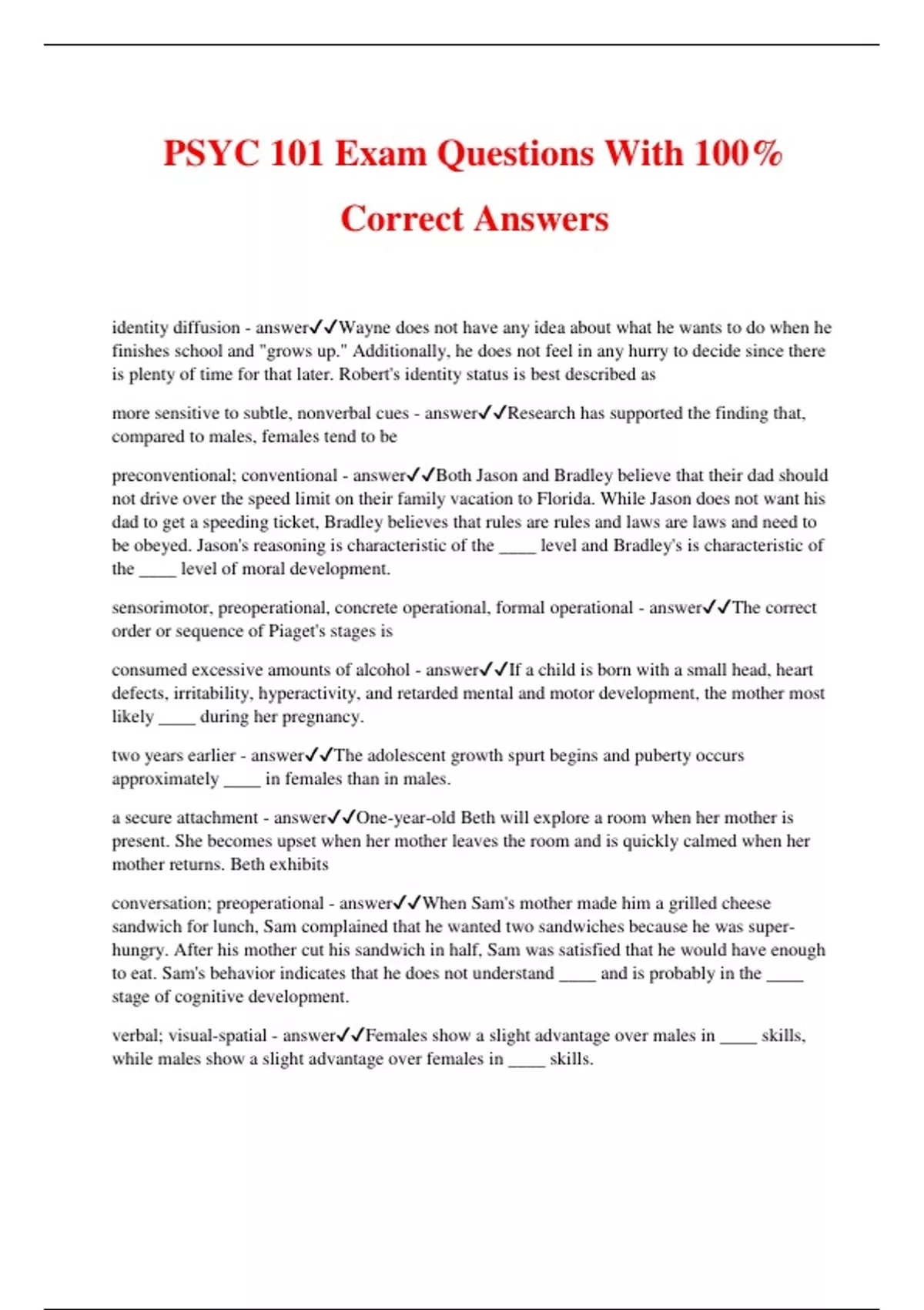 PSYC 101 Exam Questions With 100% Correct Answers identity diffusion - answerWayne does not have any idea about what he wants to do when he finishes school and "grows up." Additionally, he does not feel in any hurry to decide since there is plenty of time for that later. Robert's identity status is best described as more sensitive to subtle, nonverbal cues - answerResearch has supported the finding that, compared to males, females tend to be preconventional; conventional - answerBoth Jason and Bradley believe that their dad should not drive over the speed limit on their family vacation to Florida. While Jason does not want his dad to get a speeding ticket, Bradley believes that rules are rules and laws are laws and need to be obeyed. Jason's reasoning is characteristic of the ____ level and Bradley's is characteristic of the ____ level of moral development. sensorimotor, preoperational, concrete operational, formal operational - answerThe correct order or sequence of Piaget's stages is consumed excessive amounts of alcohol - answerIf a child is born with a small head, heart defects, irritability, hyperactivity, and retarded mental and motor development, the mother most likely ____ during her pregnancy. two years earlier - answerThe adolescent growth spurt begins and puberty occurs approximately ____ in females than in males. a secure attachment - answerOne-year-old Beth will explore a room when her mother is present. She becomes upset when her mother leaves the room and is quickly calmed when her mother returns. Beth exhibits conversation; preoperational - answerWhen Sam's mother made him a grilled cheese sandwich for lunch, Sam complained that he wanted two sandwiches because he was super- hungry. After his mother cut his sandwich in half, Sam was satisfied that he would have enough to eat. Sam's behavior indicates that he does not understand ____ and is probably in the ____ stage of cognitive development. verbal; visual-spatial - answerFemales show a slight advantage over males in ____ skills, while males show a slight advantage over females in ____ skills. develop a sense of isolation - answerJocelyn is 25 years old and she feels very insecure about some of the personal and career choices she has made so far. Consequently, at this point in her life she is unwilling to form a serious, committed relationship with another person. Based on Erikson's theory, Jocelyn may social interactions and a culture strongly influence the cognitive development of a child - answerUnlike Piaget's theory of cognitive development, Vygotsky emphasizes that 6-8; 14-18 - answerSeparation anxiety typically develops when infants are about ____ months old and peaks at around ______ months. vary somewhat; environmental factors can slow or accelerate early motor development - answerThe fact that children in different cultures ____ in the age at which basic motor skills appear demonstrates that ____. embryonic stage - answerDeveloping structures generally are most vulnerable to damage from environmental factors during the ____ of prenatal development. why adolescents engage in risky behavior like reckless driving and unprotected sex - answerThe immaturity of the prefrontal cortex has been used to explain experienced episodes of anger - answerResearch on cardiology patients shows that in the six hours prior to their heart attack they often people's appraisals of stressful events are highly subjective - answerImagine you studied for a psychology exam with two of your classmates. If one classmate, Becky, was very nervous and "stressed-out" about the exam, and the other classmate, Craig, thought the exam "wasn't a big deal," their differing attitudes are most consistent with the finding that can help to reduce stress by affecting appraisal of the event - answerFinding humor in a stressful situation more vulnerable to developing physical illness - answerPeople with higher scores on the Social Readjustment Rating Scale (SRRS) tend to be reducing its activity, thus causing the body to become more vulnerable to illness - answerStress affects the immune system by increased, rather than decreased, distress - answerPeople who use "giving up" or behavioral disengagement as a coping strategy typically experience may involve either positive or negative emotions - answerResearch has shown that the emotional responses to stress good physical health - answerSocial support, optimism, and forgiveness are positively related to: