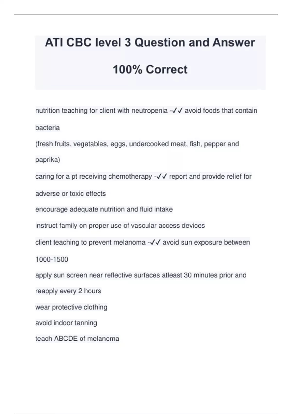 ATI CBC level 3 Question and Answer 100% Correct nutrition teaching for client with neutropenia - avoid foods that contain bacteria (fresh fruits, vegetables, eggs, undercooked meat, fish, pepper and paprika) caring for a pt receiving chemotherapy - report and provide relief for adverse or toxic effects encourage adequate nutrition and fluid intake instruct family on proper use of vascular access devices client teaching to prevent melanoma - avoid sun exposure between apply sun screen near reflective surfaces atleast 30 minutes prior and reapply every 2 hours wear protective clothing avoid indoor tanning teach ABCDE of melanoma