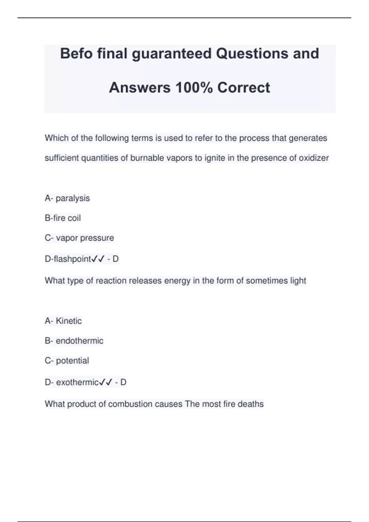 Befo final guaranteed Questions and Answers 100% Correct Which of the following terms is used to refer to the process that generates sufficient quantities of burnable vapors to ignite in the presence of oxidizer A- paralysis B-fire coil C- vapor pressure D-flashpoint - D What type of reaction releases energy in the form of sometimes light A- Kinetic B- endothermic C- potential D- exothermic - D What product of combustion causes The most fire deaths