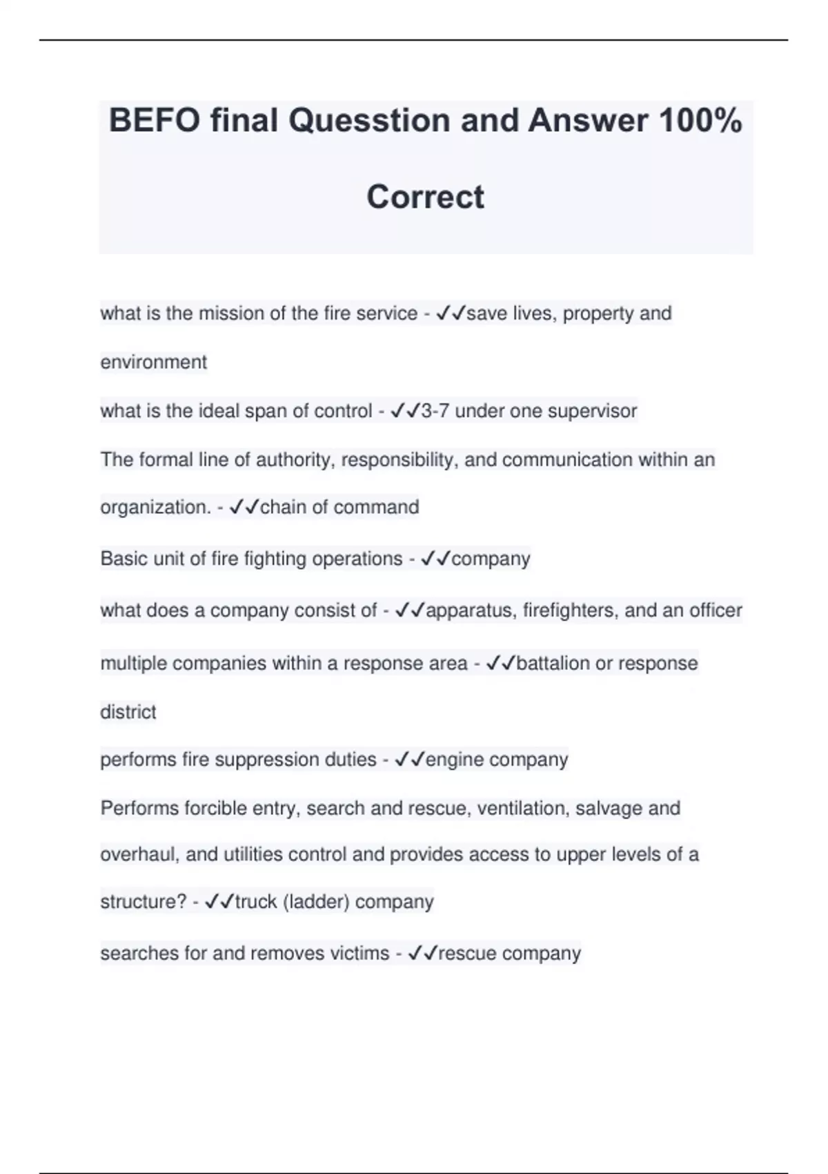 BEFO final Quesstion and Answer 100% Correct what is the mission of the fire service - save lives, property and environment what is the ideal span of control - 3-7 under one supervisor The formal line of authority, responsibility, and communication within an organization. - chain of command Basic unit of fire fighting operations - company what does a company consist of - apparatus, firefighters, and an officer multiple companies within a response area - battalion or response district performs fire suppression duties - engine company Performs forcible entry, search and rescue, ventilation, salvage and overhaul, and utilities control and provides access to upper levels of a structure? - truck (ladder) company searches for and removes victims - rescue company