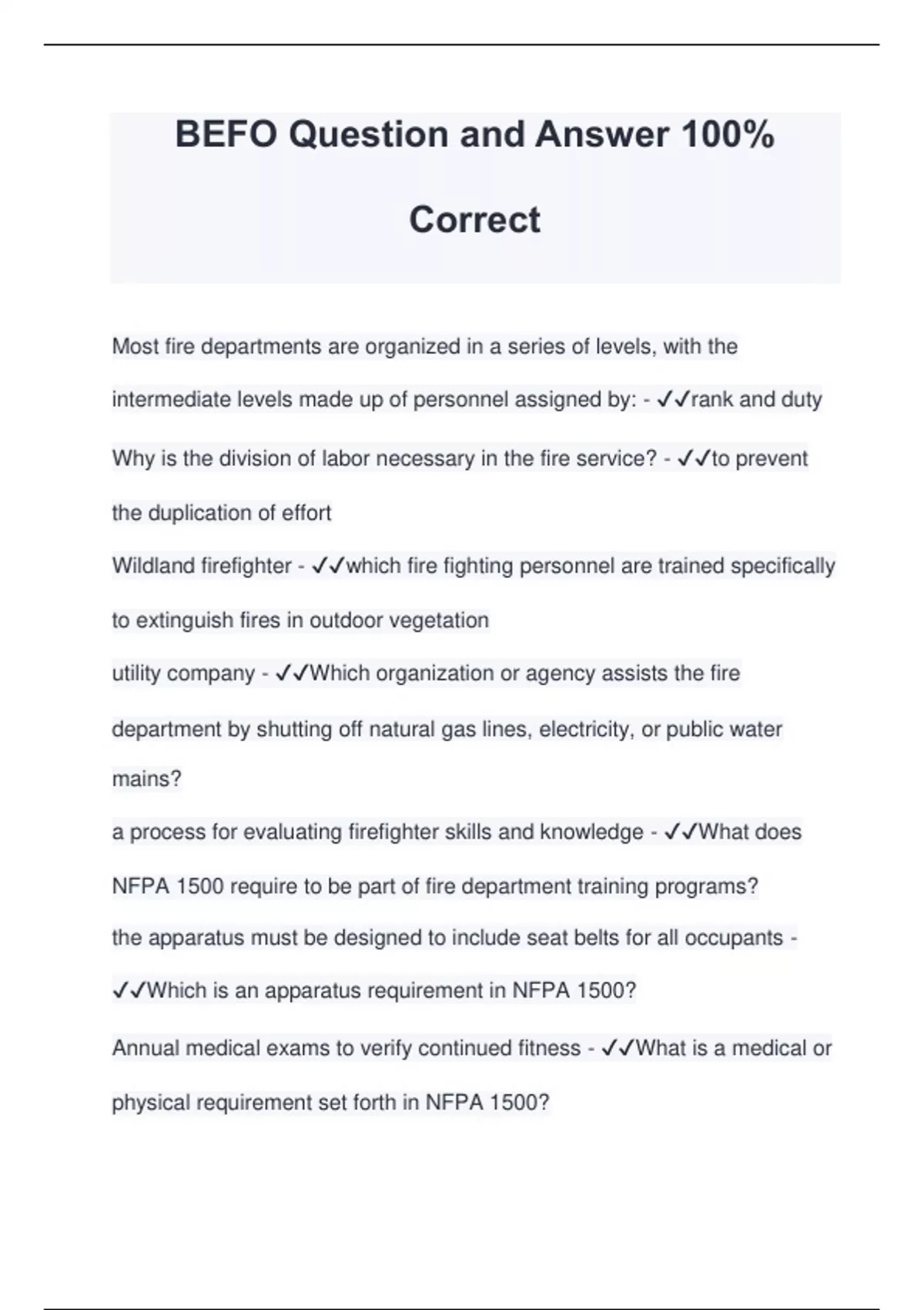 BEFO Question and Answer 100% Correct Most fire departments are organized in a series of levels, with the intermediate levels made up of personnel assigned by: - rank and duty Why is the division of labor necessary in the fire service? - to prevent the duplication of effort Wildland firefighter - which fire fighting personnel are trained specifically to extinguish fires in outdoor vegetation utility company - Which organization or agency assists the fire department by shutting off natural gas lines, electricity, or public water mains? a process for evaluating firefighter skills and knowledge - What does NFPA 1500 require to be part of fire department training programs? the apparatus must be designed to include seat belts for all occupants - Which is an apparatus requirement in NFPA 1500? Annual medical exams to verify continued fitness - What is a medical or physical requirement set forth in NFPA 1500? Vehicles -