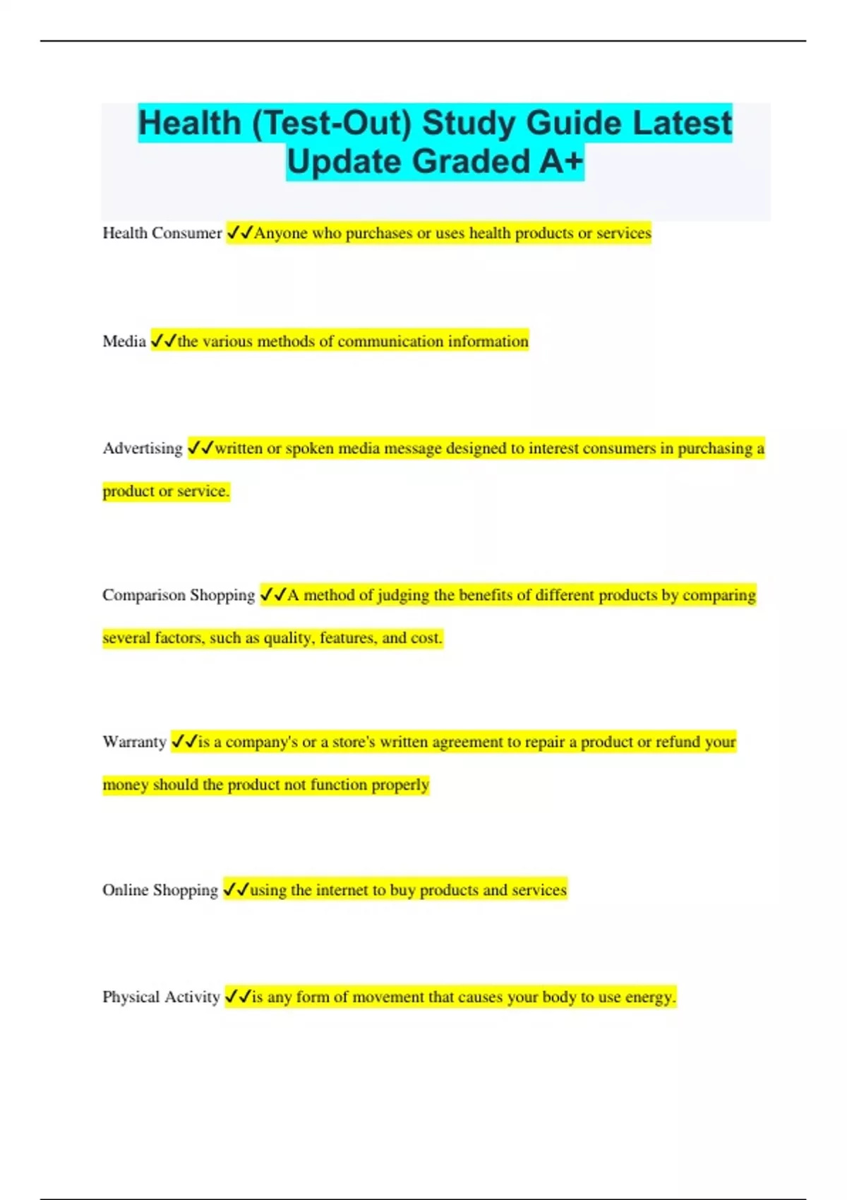 Health (Test-Out) Study Guide Latest Update Graded A+ Health Consumer Anyone who purchases or uses health products or services Media the various methods of communication information Advertising written or spoken media message designed to interest consumers in purchasing a product or service. Comparison Shopping A method of judging the benefits of different products by comparing several factors, such as quality, features, and cost. Warranty is a company's or a store's written agreement to repair a product or refund your money should the product not function properly Online Shopping using the internet to buy products and services Physical Activity is any form of movement that causes your body to use energy. Physical Fitness the ability to carry out daily tasks easily and have enough reserve energy to respond to unexpected demands Sedentary Lifestyle a way of life that involves little physical activity Osteoporosis a condition characterized by a decrease in bone density, producing porous, and fragile bones. Metabolism the process by which your body gets energy from food. Cardiorespiratory endurance the ability of the heart, lungs, and blood vessels to utilize and send fuel and oxygen to the body's tissues during long periods of moderate-to-vigorous- activity Muscular Strength the amount of force a muscle can exert Muscle Endurance the ability of the muscles to perform physical tasks over a period of time without becoming fatigued. Flexibility the ability to move a body part through a full range of motion Body Composition the ratio of body fat to lean body tissue, including muscle, bone, water, and connective tissue such as ligaments, cartilage, and tendons. Exercise purposeful physical activity that is planned, structured, and repetitive and that improves or maintains personal fitness Aerobic Exercise any activity that uses large muscle groups, is rhythmic in nature, and can be maintained continuously for at least 10 minutes three times a day for 20 to 30 minutes Anaerobic exercise intense short bursts of activity in which the muscles works so hard that they produce energy without using oxygen. Overload working the body harder than it is normally worked Progression the gradual increase in overload