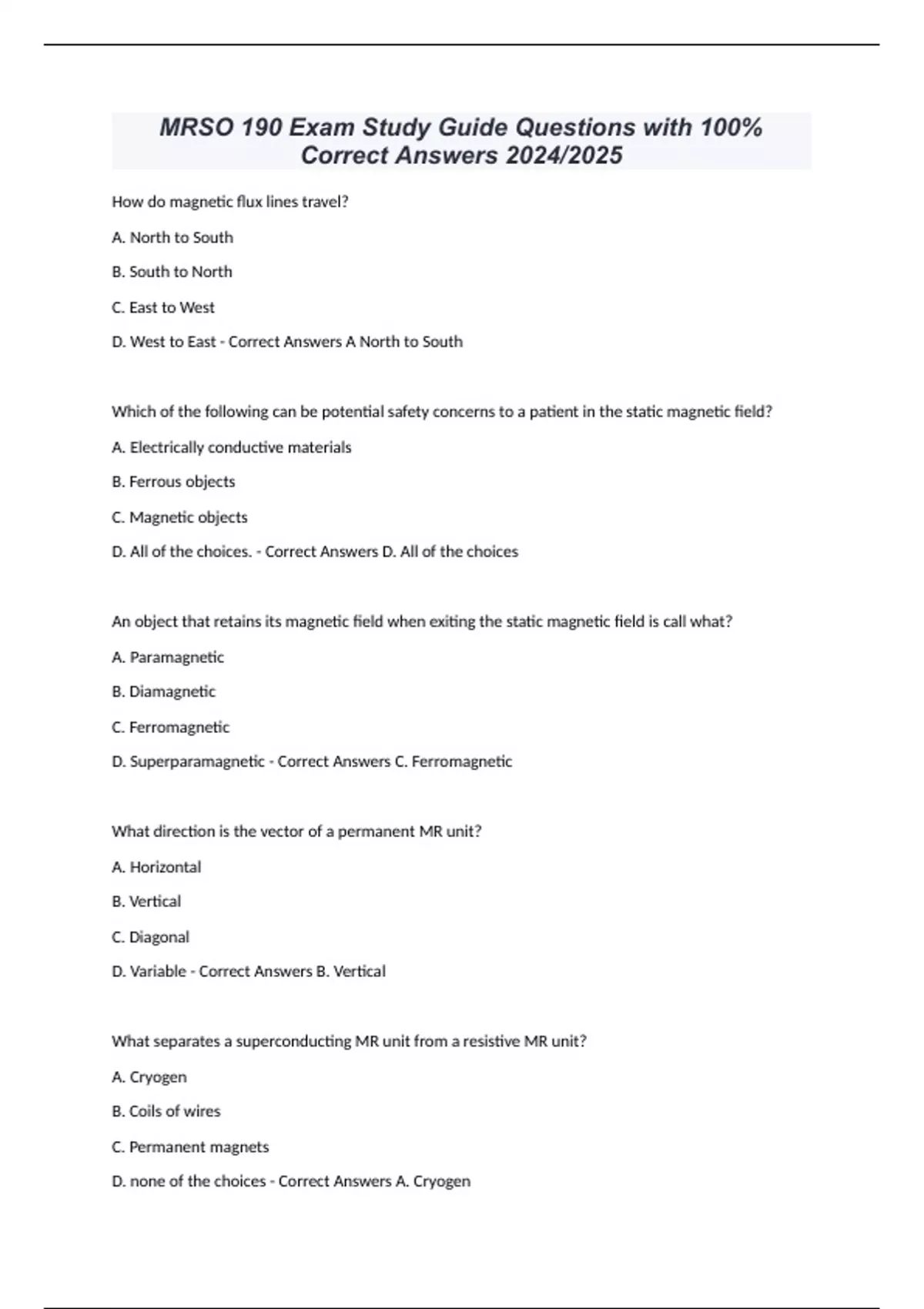 MRSO 190 Exam Study Guide Questions with 100% Correct Answers 2024/2025 How do magnetic flux lines travel? A. North to South B. South to North C. East to West D. West to East - Correct Answers A North to South Which of the following can be potential safety concerns to a patient in the static magnetic field? A. Electrically conductive materials B. Ferrous objects C. Magnetic objects D. All of the choices. - Correct Answers D. All of the choices An object that retains its magnetic field when exiting the static magnetic field is call what? A. Paramagnetic B. Diamagnetic C. Ferromagnetic D. Superparamagnetic - Correct Answers C. Ferromagnetic What direction is the vector of a permanent MR unit? A. Horizontal B. Vertical C. Diagonal D. Variable - Correct Answers B. Vertical What separates a superconducting MR unit from a resistive MR unit? A. Cryogen B. Coils of wires C. Permanent magnets D. none of the choices - Correct Answers A. Cryogen