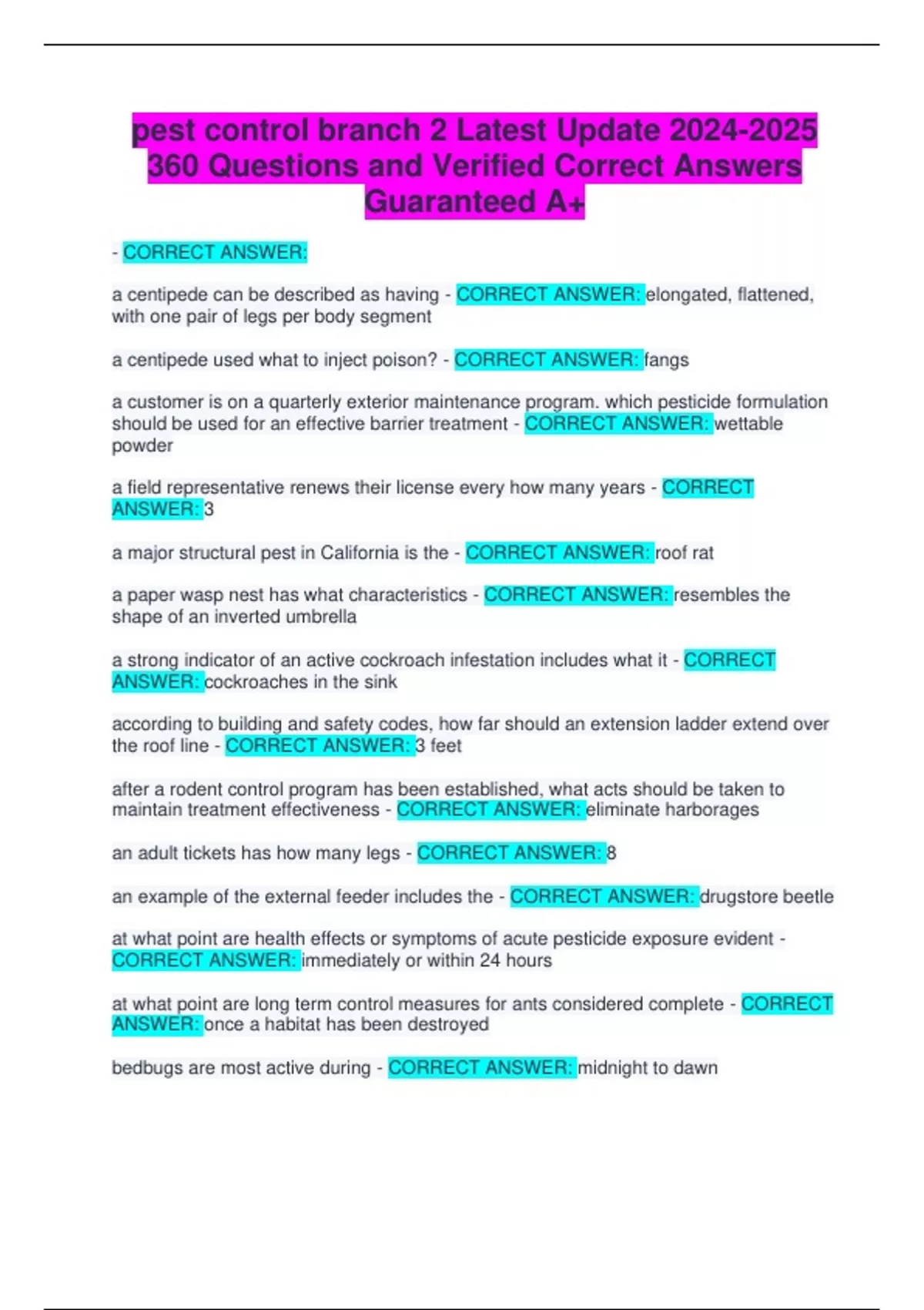 pest control branch 2 Latest Update Questions and Verified Correct Answers Guaranteed A+