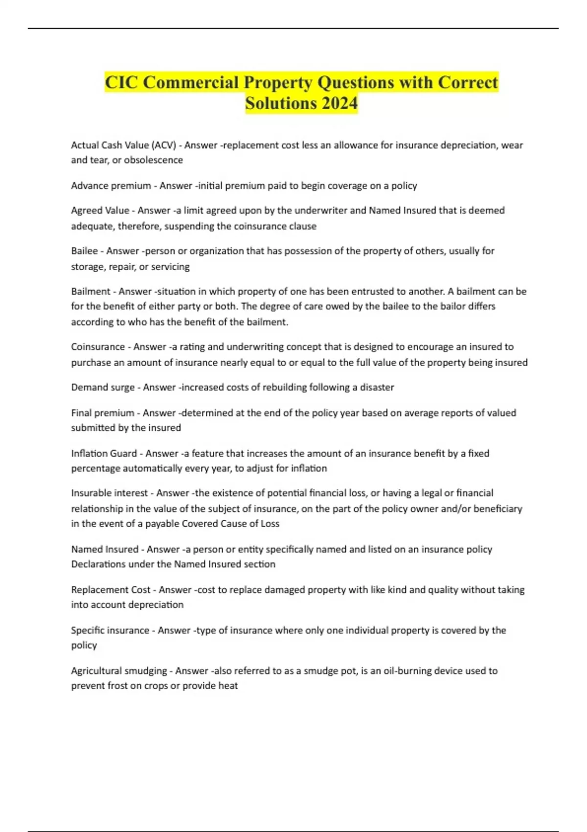 CIC Commercial Property Questions with Correct Solutions 2024 Actual Cash Value (ACV) - Answer -replacement cost less an allowance for insurance depreciation, wear and tear, or obsolescence Advance premium - Answer -initial premium paid to begin coverage on a policy Agreed Value - Answer -a limit agreed upon by the underwriter and Named Insured that is deemed adequate, therefore, suspending the coinsurance clause Bailee - Answer -person or organization that has possession of the property of others, usually for storage, repair, or servicing Bailment - Answer -situation in which property of one has been entrusted to another. A bailment can be for the benefit of either party or both. The degree of care owed by the bailee to the bailor differs according to who has the benefit of the bailment. Coinsurance - Answer -a rating and underwriting concept that is designed to encourage an insured to purchase an amount of insurance nearly equal to or equal to the full value of the property being insured Demand surge - Answer -increased costs of rebuilding following a disaster Final premium - Answer -determined at the end of the policy year based on average reports of valued submitted by the insured Inflation Guard - Answer -a feature that increases the amount of an insurance benefit by a fixed percentage automatically every year, to adjust for inflation Insurable interest - Answer -the existence of potential financial loss, or having a legal or financial relationship in the value of the subject of insurance, on the part of the policy owner and/or beneficiary in the event of a payable Covered Cause of Loss Named Insured - Answer -a person or entity specifically na