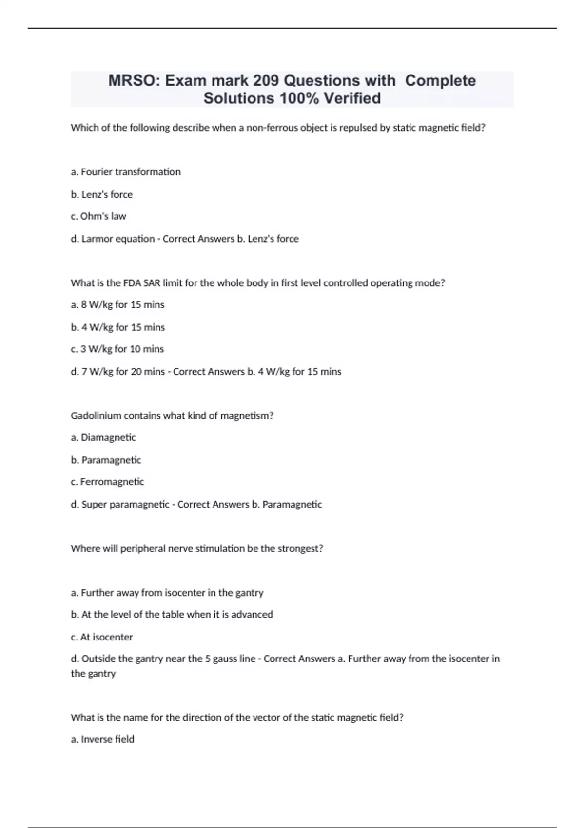 MRSO: Exam mark 209 Questions with Complete Solutions 100% Verified Which of the following describe when a non-ferrous object is repulsed by static magnetic field? a. Fourier transformation b. Lenz's force c. Ohm's law d. Larmor equation - Correct Answers b. Lenz's force What is the FDA SAR limit for the whole body in first level controlled operating mode? a. 8 W/kg for 15 mins b. 4 W/kg for 15 mins c. 3 W/kg for 10 mins d. 7 W/kg for 20 mins - Correct Answers b. 4 W/kg for 15 mins Gadolinium contains what kind of magnetism? a. Diamagnetic b. Paramagnetic c. Ferromagnetic d. Super paramagnetic - Correct Answers b. Paramagnetic Where will peripheral nerve stimulation be the strongest? a. Further away from isocenter in the gantry b. At the level of the table when it is advanced c. At isocenter d. Outside the gantry near the 5 gauss line - Correct Answers a. Further away from the isocenter in the gantry What is the name for the direction of the vector of the static magnetic field? a. Inverse field